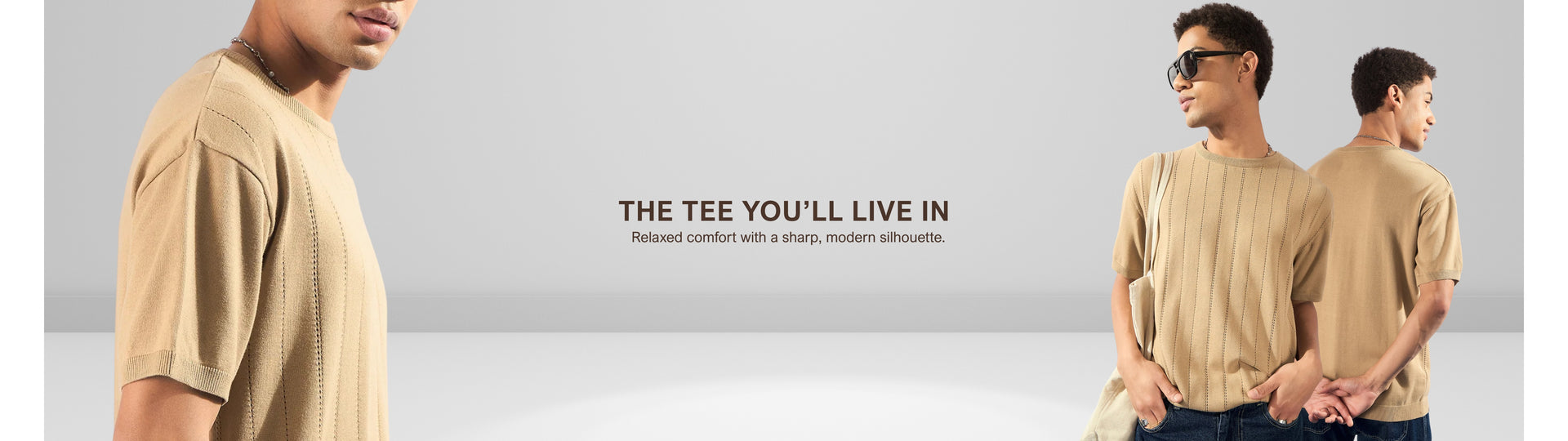 Beige: Relaxed Round Neck Knitted T-Shirt