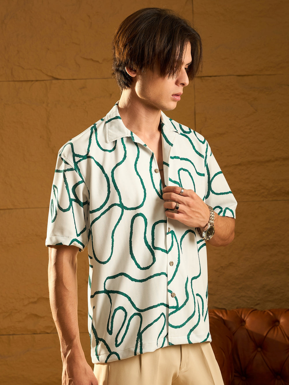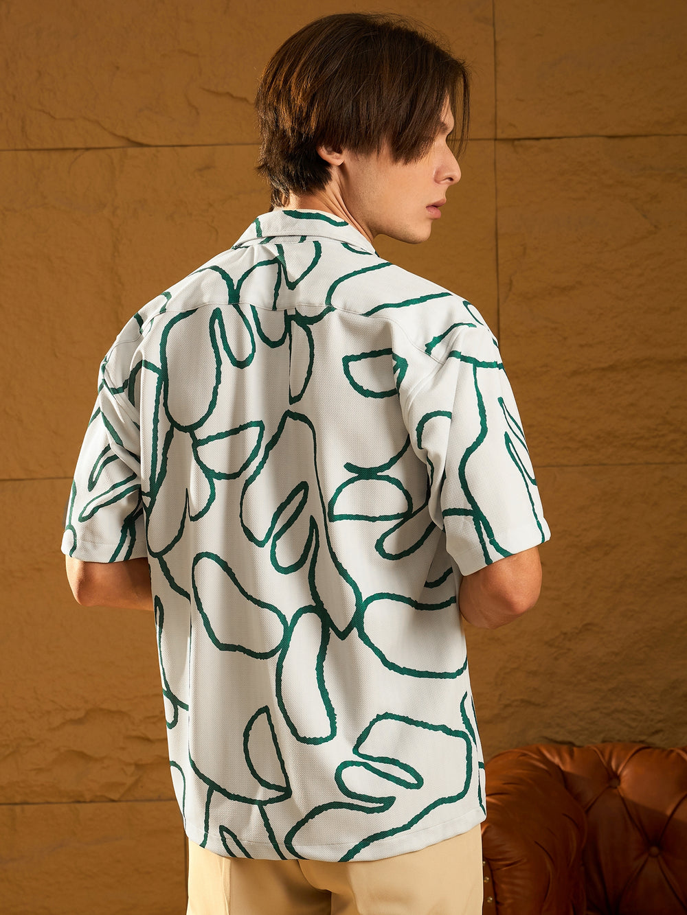 This oversized, drop-shoulder shirt with an abstract print and Cuban collar is a statement piece. Made from Polyester, it’s perfect for casual wear, pairing effortlessly with jeans or shorts for a bold, relaxed look.