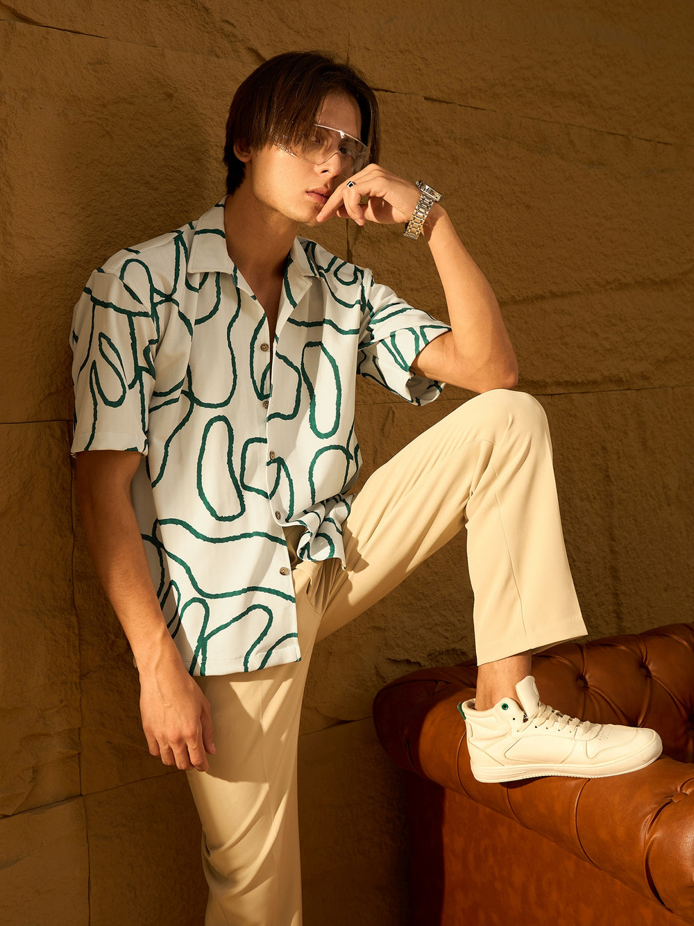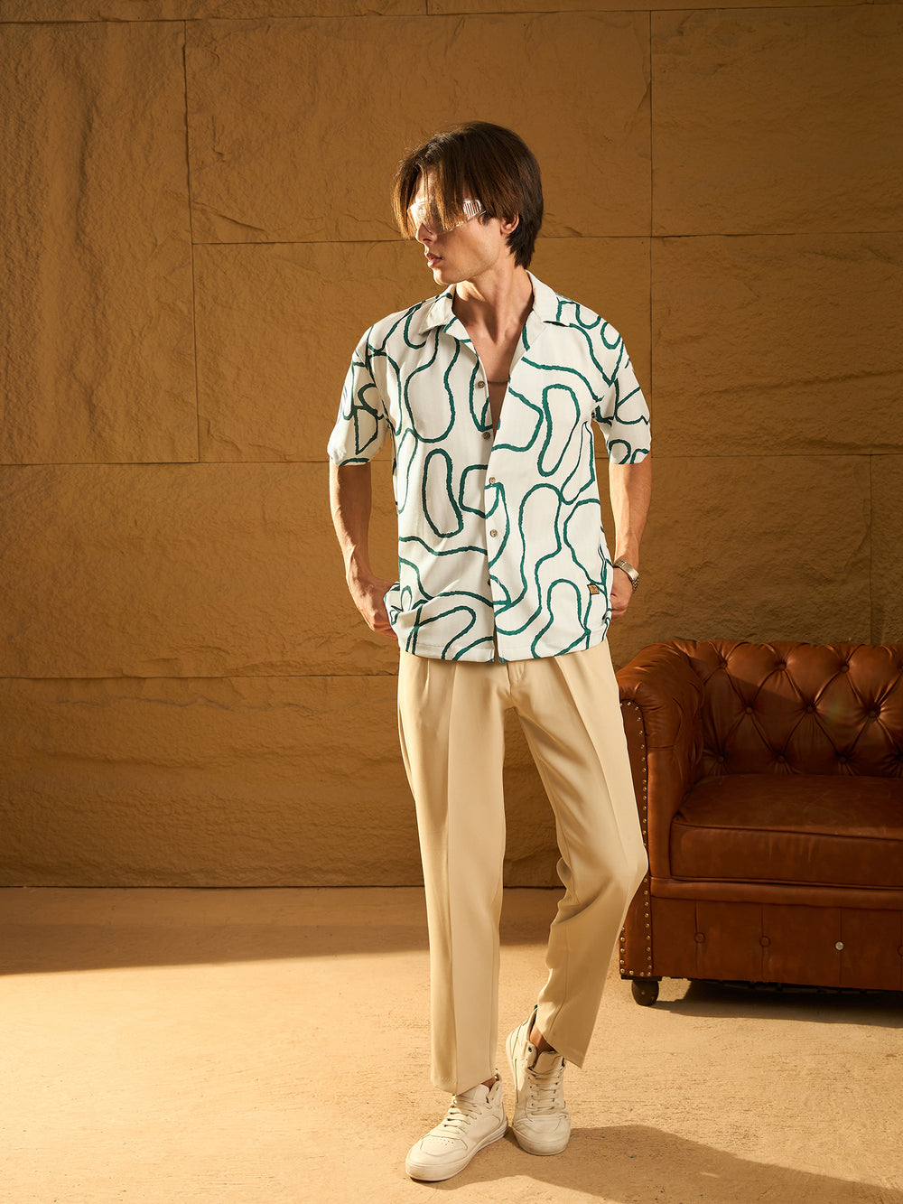 White and Green printed opaque, has a Cuban collar, button placket, no pocket, Half regular sleeves, Straight hem, Drop Shoulder