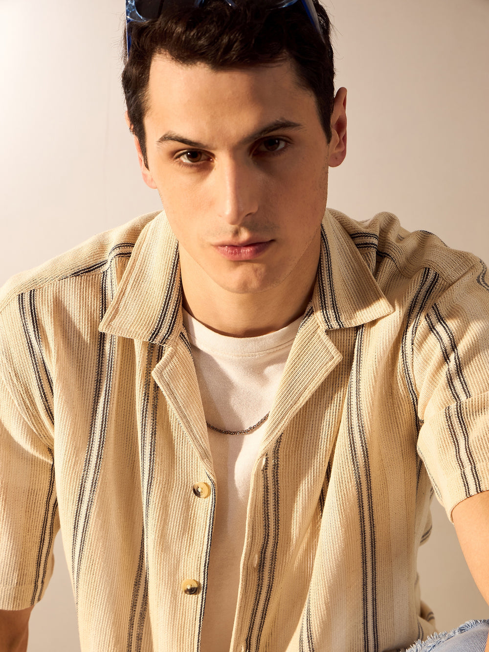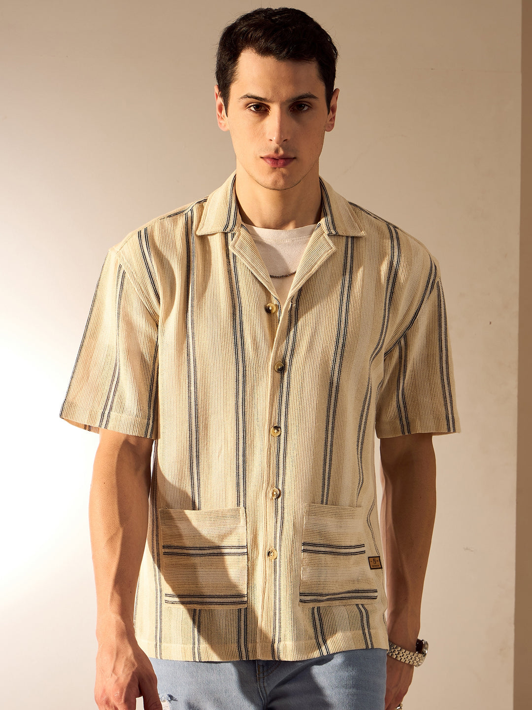 Beige and Black Vertical Striped Crochet oversized casual shirt, has a Cuban collar, button placket, 2 Patch pocket, short regular sleeves, Straight hem