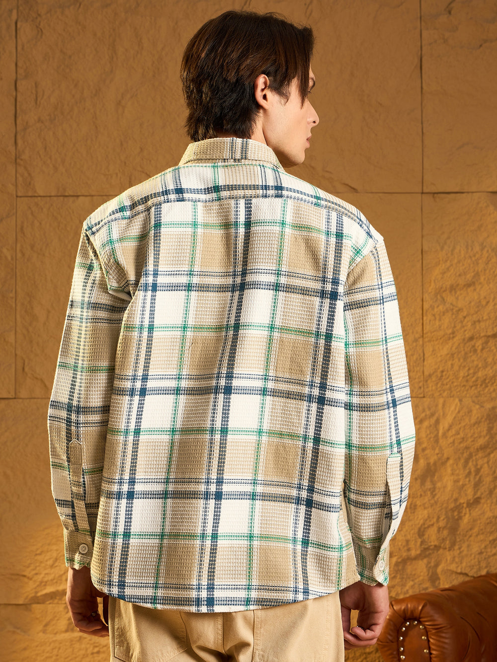 Beige and White checked shacket featuring a spread collar, drop shoulders, oversized fit, full sleeves, 2 Patch pockets, and a stylish curved hemline
