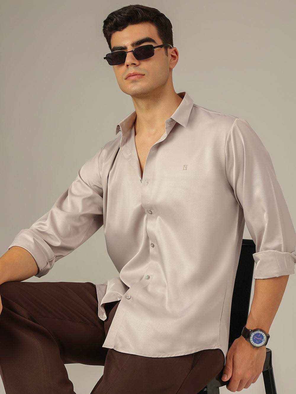 Elevate your wardrobe with this regular fit formal shirt crafted from smooth satin fabric. Designed with full sleeves, a spread collar, no pocket, and a placement brand logo for a clean, sleek look.
