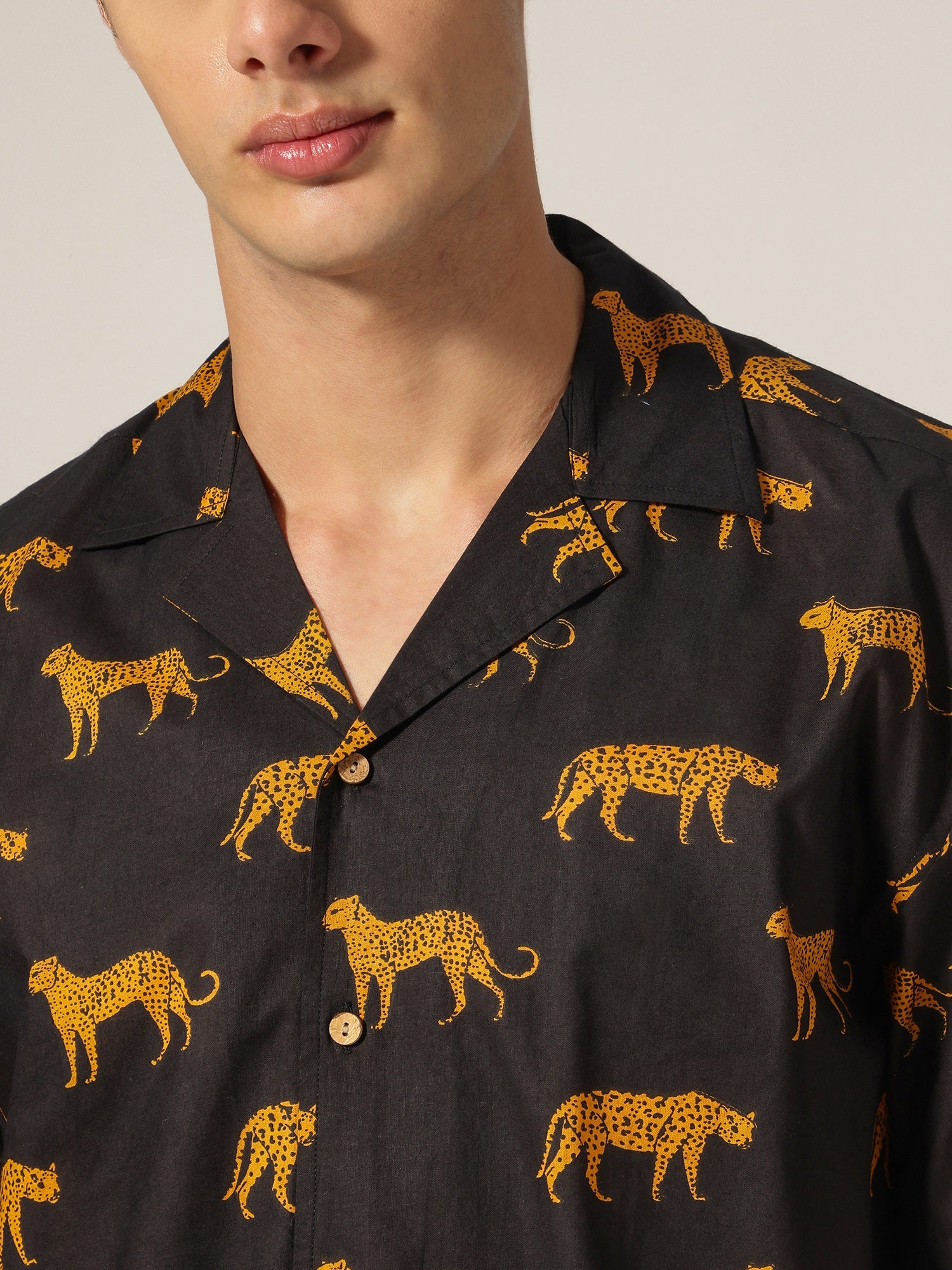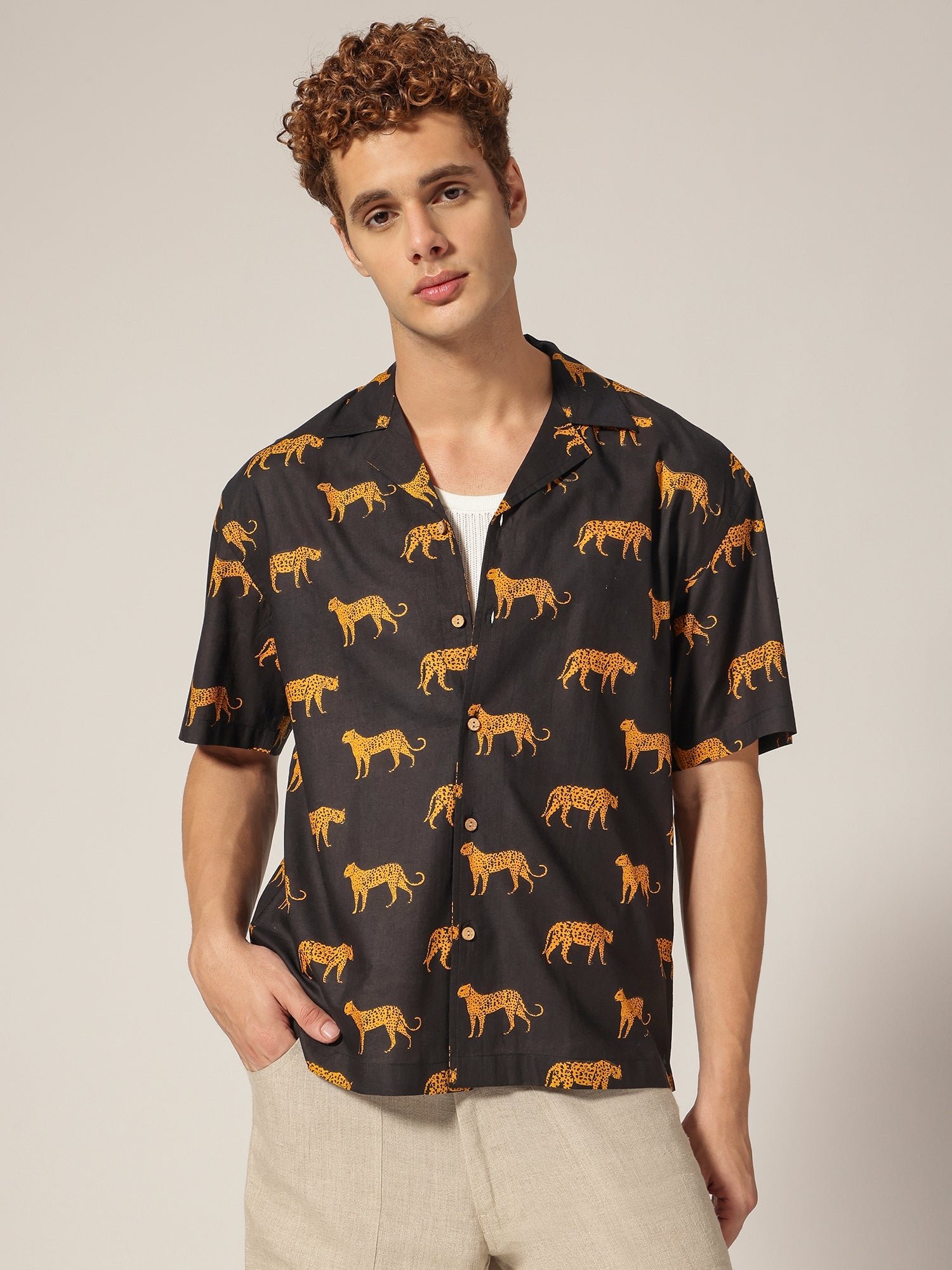 Black & Step up your style game with this Oversized Fit Casual shirt in soft Cotton, featuring bold Animal Block Printed design, Drop Shoulder, Half Sleeves, Cuban Collar, Straight Hemline, and no pocket for a clean finish.