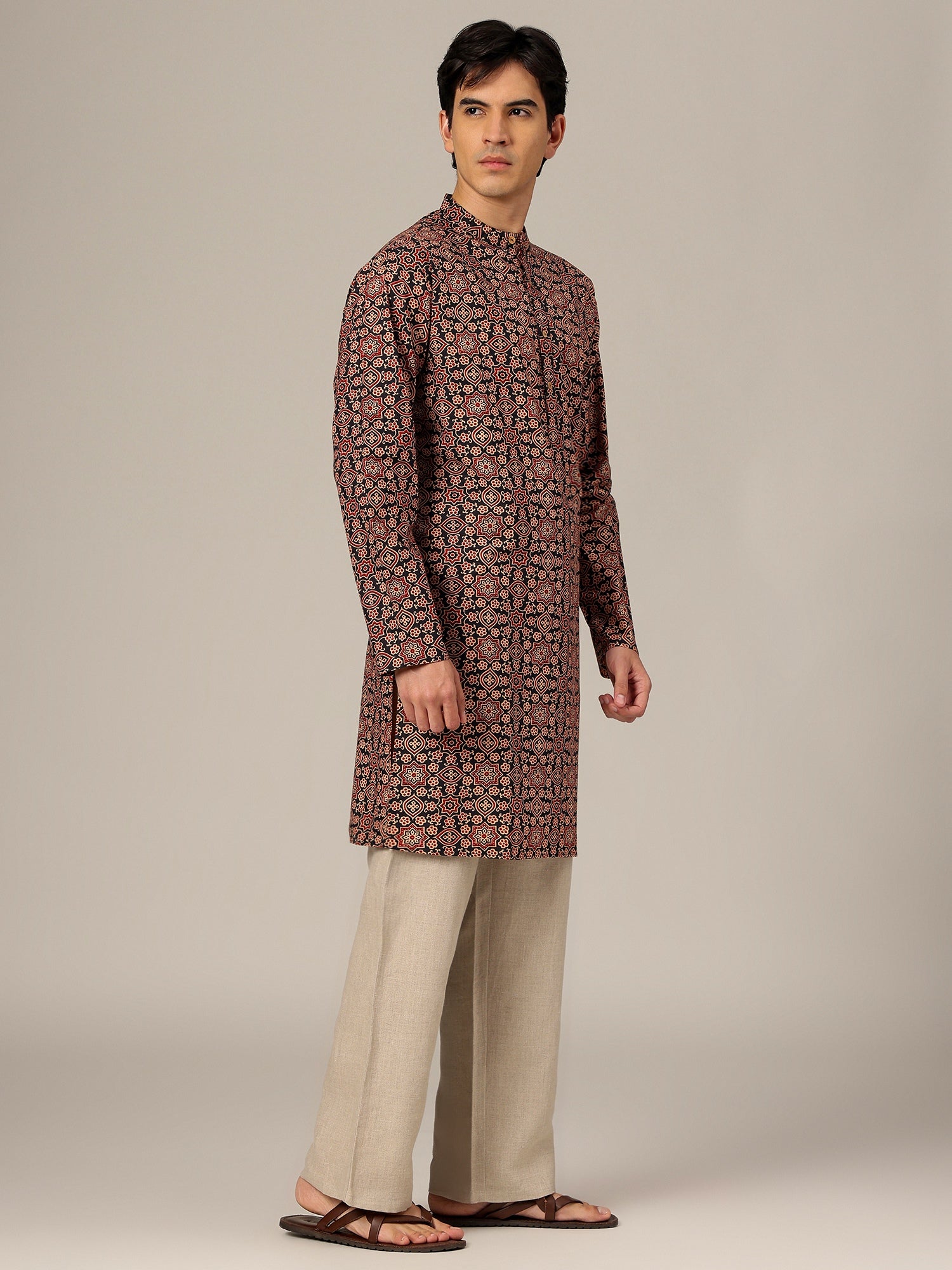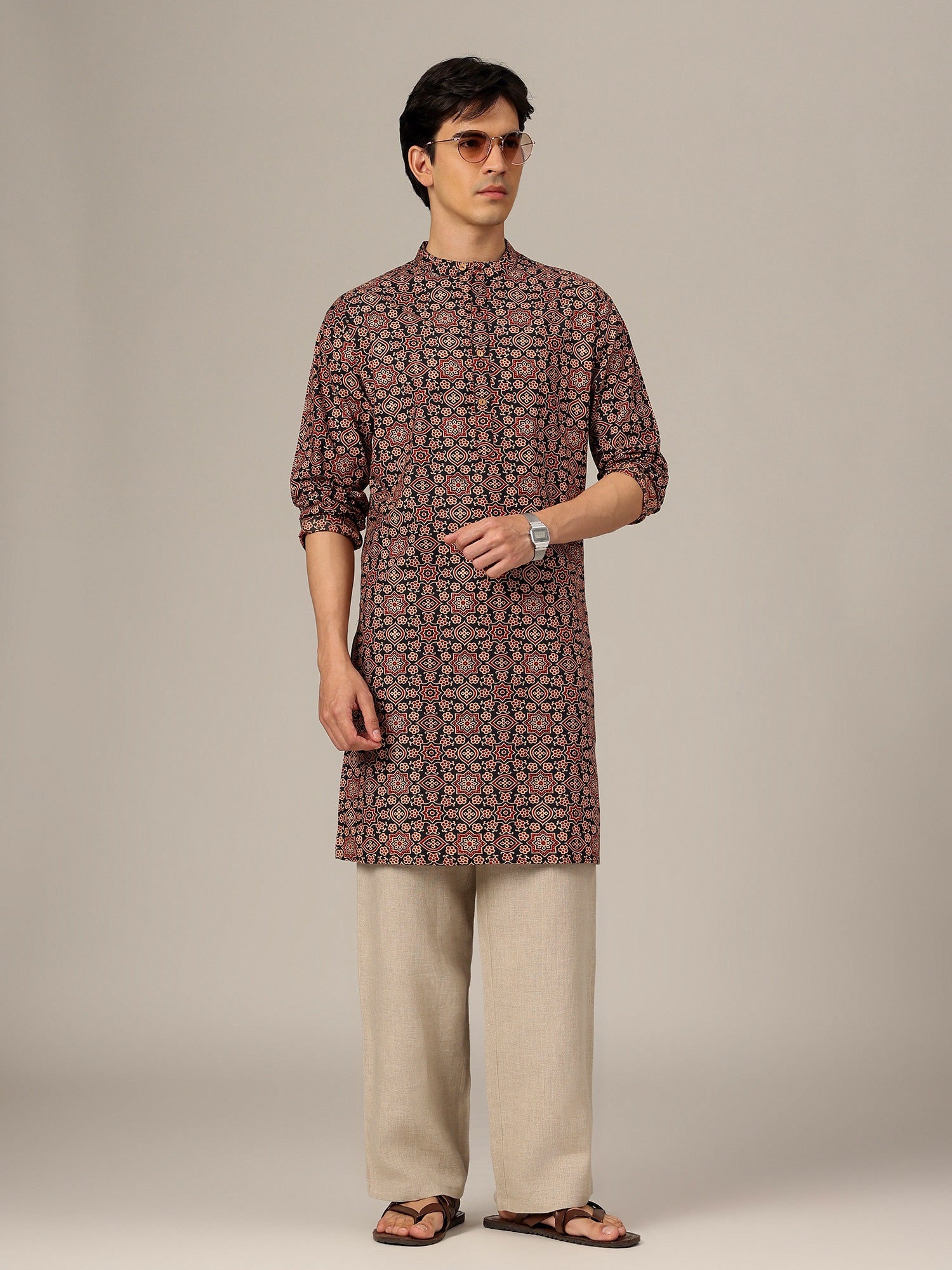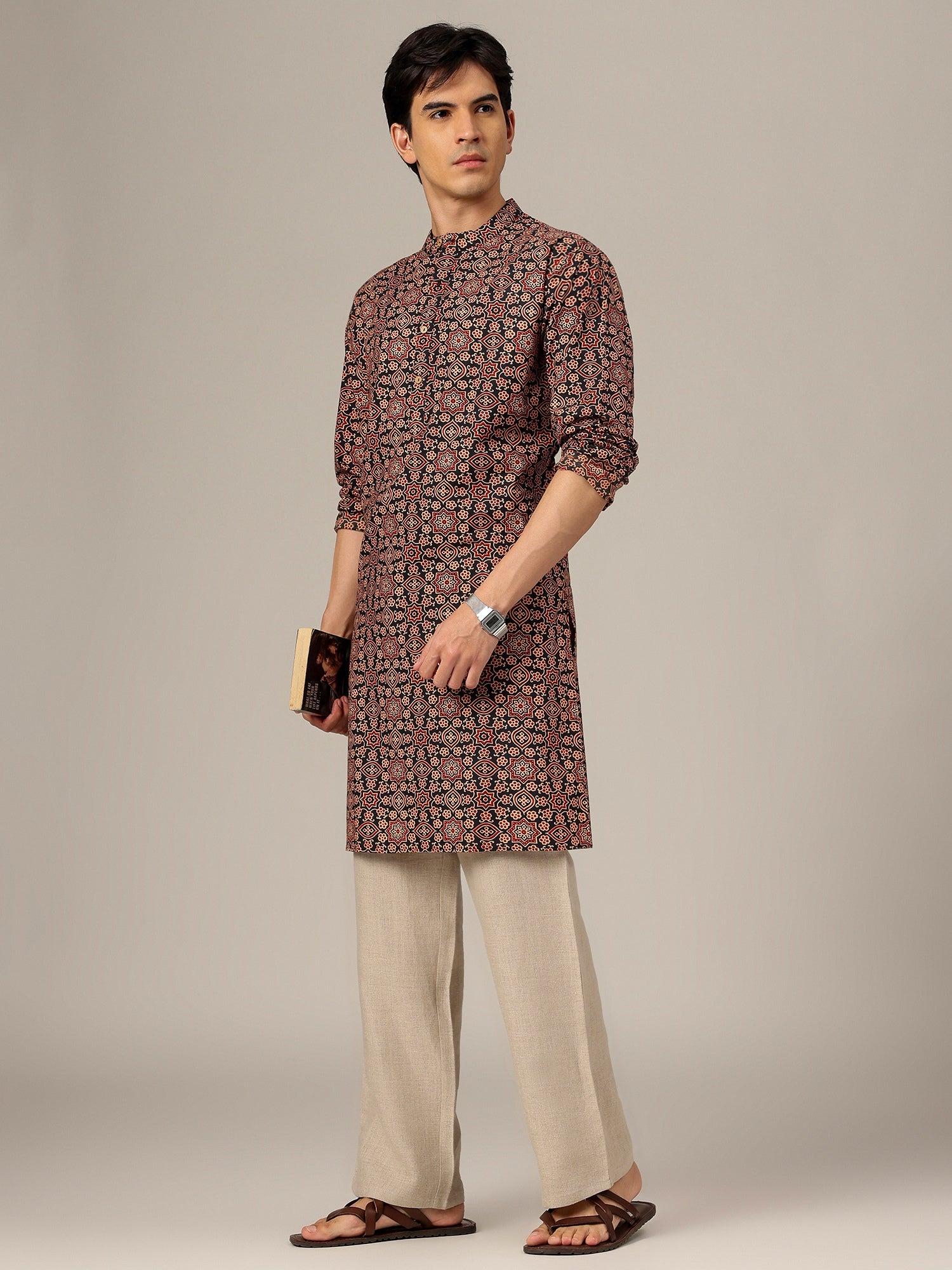 This Regular Fit Floral Block Printed Kurta is crafted from soft cotton and features a Mandarin collar, long sleeves, and two pockets. The knee-length, straight shape with side slits ensures comfort and timeless elegance.