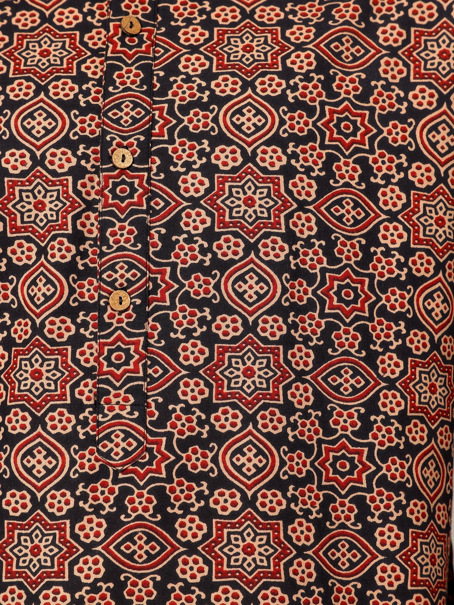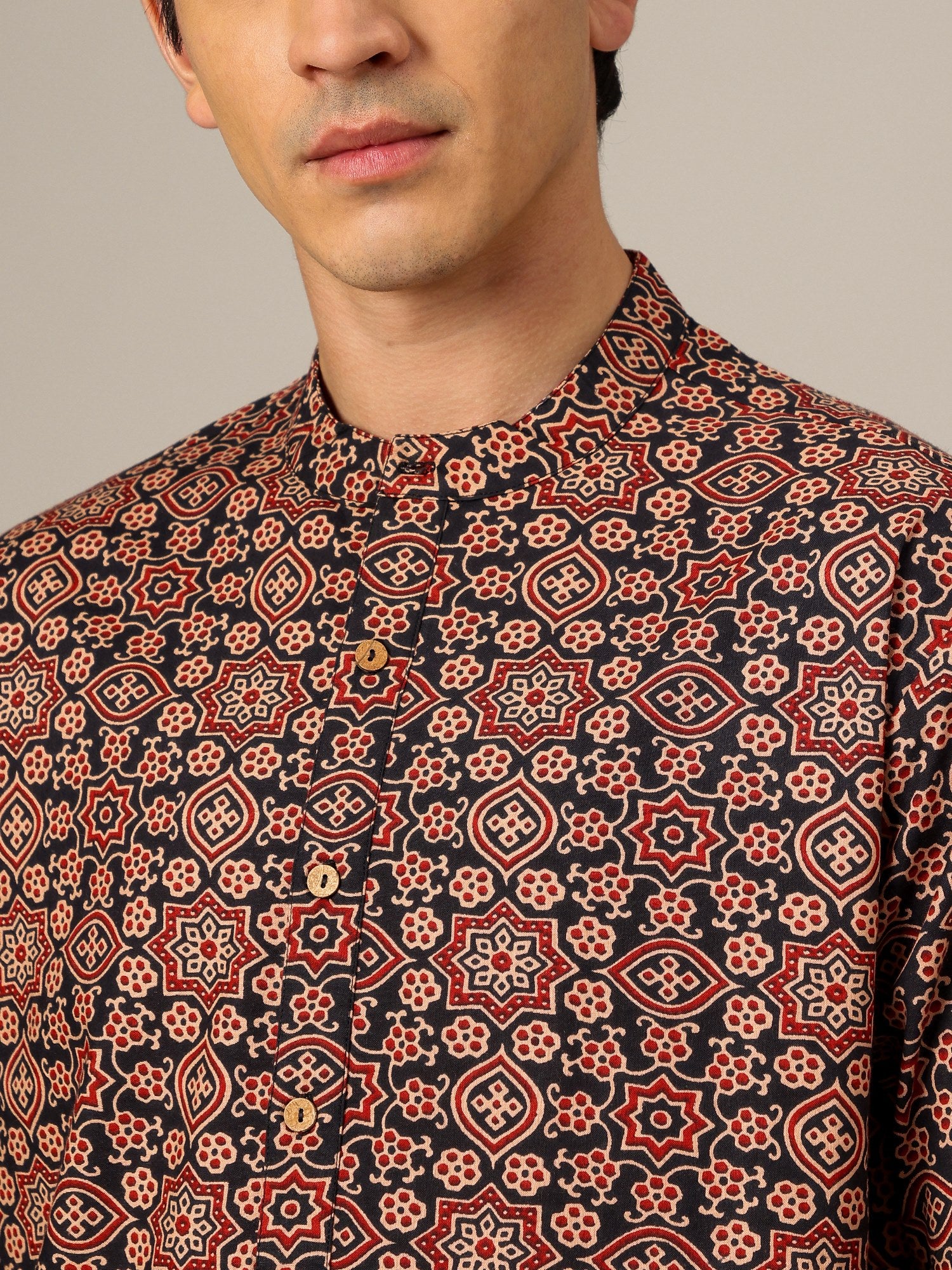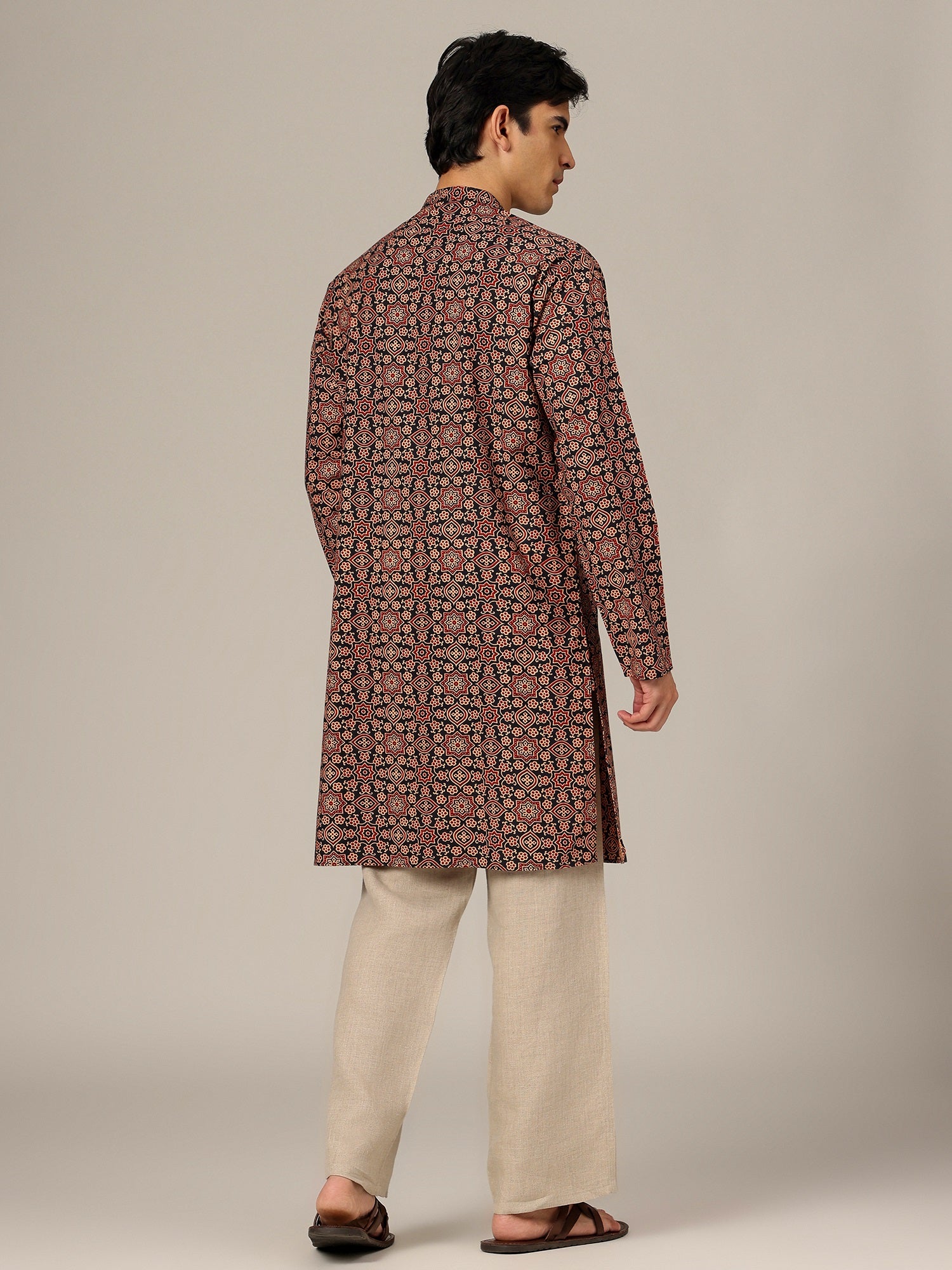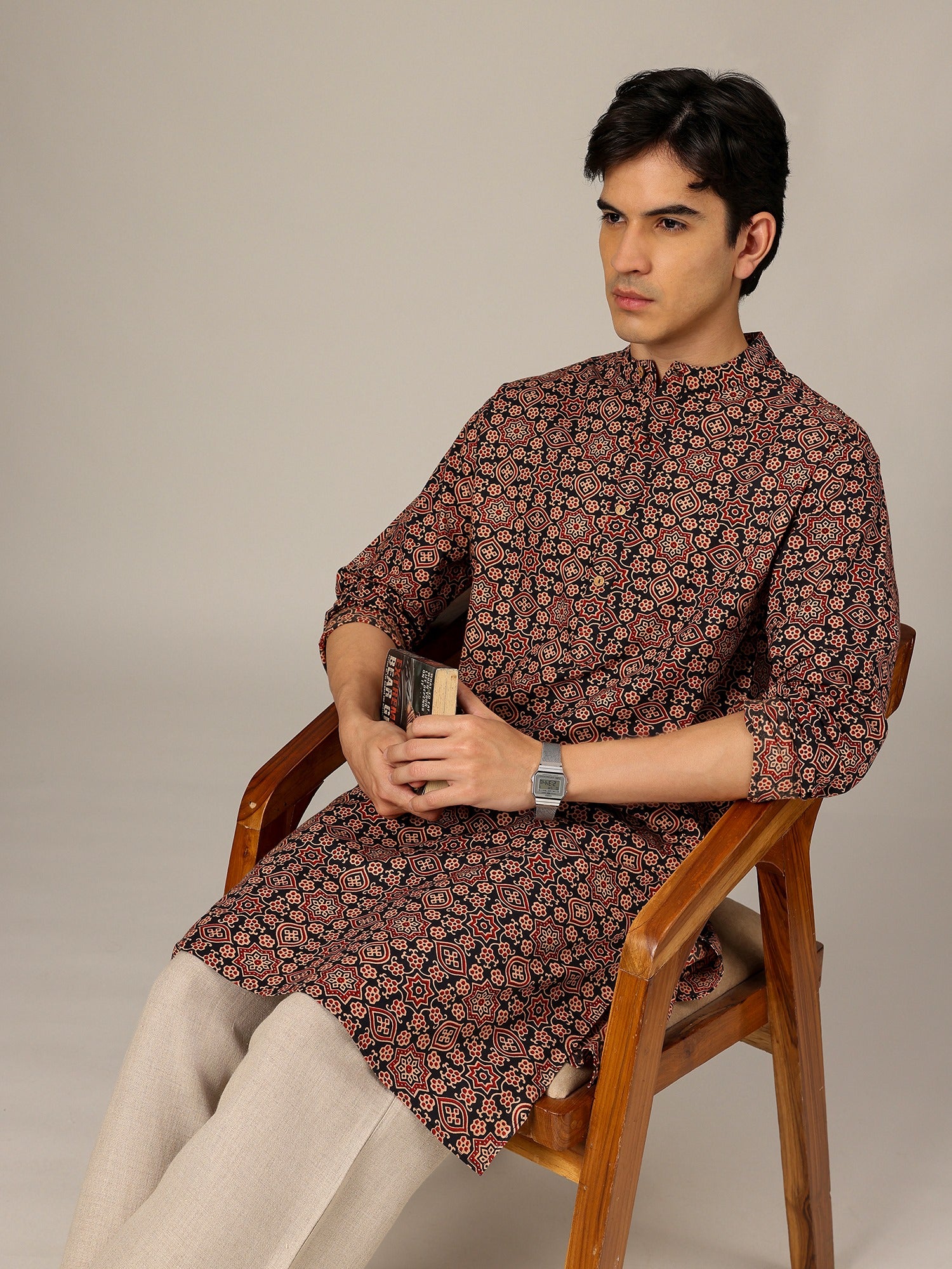 This Regular Fit Floral Block Printed Kurta is crafted from soft cotton and features a Mandarin collar, long sleeves, and two pockets. The knee-length, straight shape with side slits ensures comfort and timeless elegance.