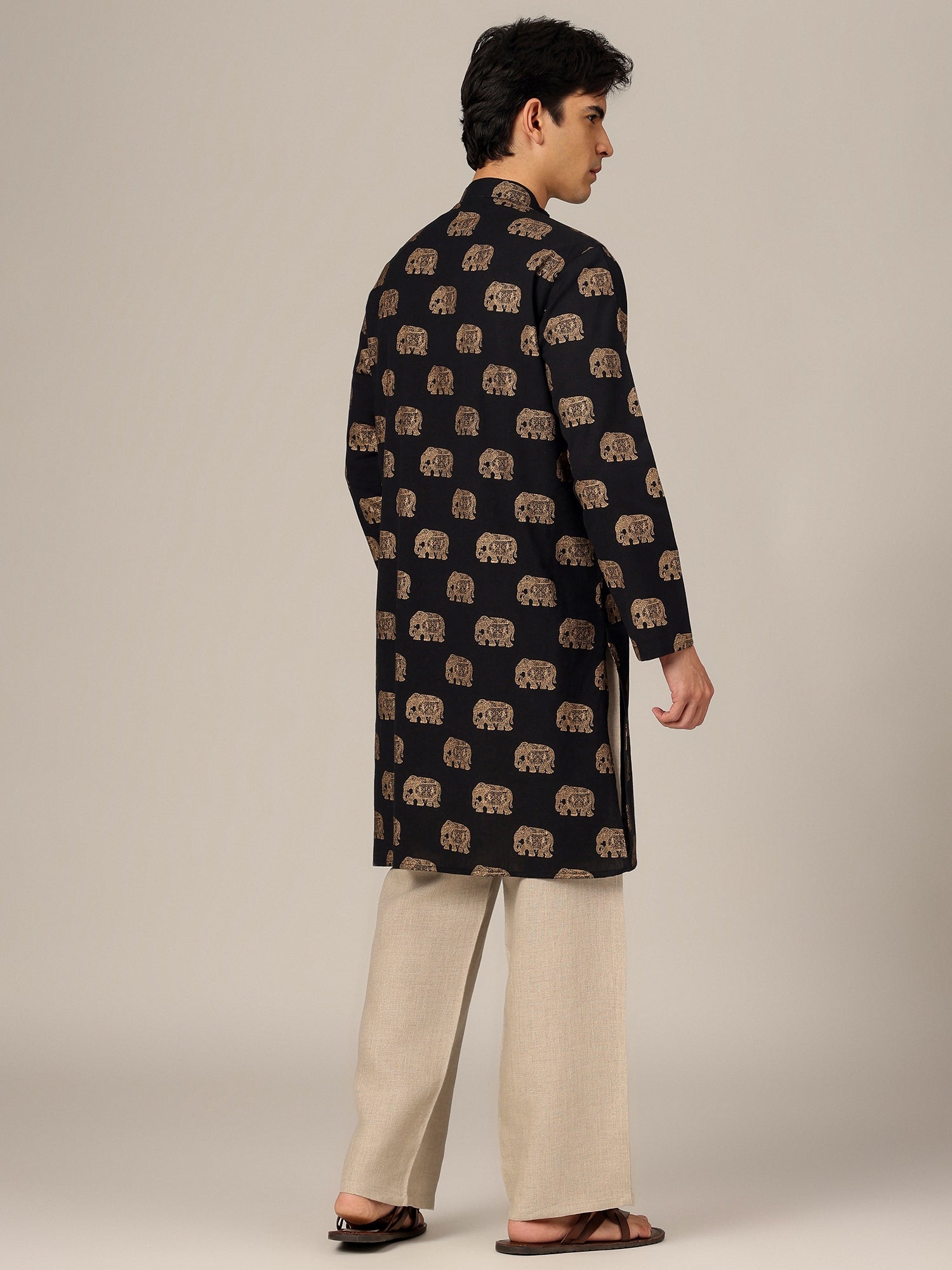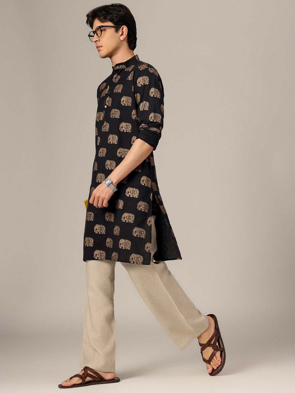 Featuring intricate block prints, this cotton kurta balances tradition and modernity. Its Mandarin collar and straight silhouette make it a versatile choice for ethnic or casual occasions.