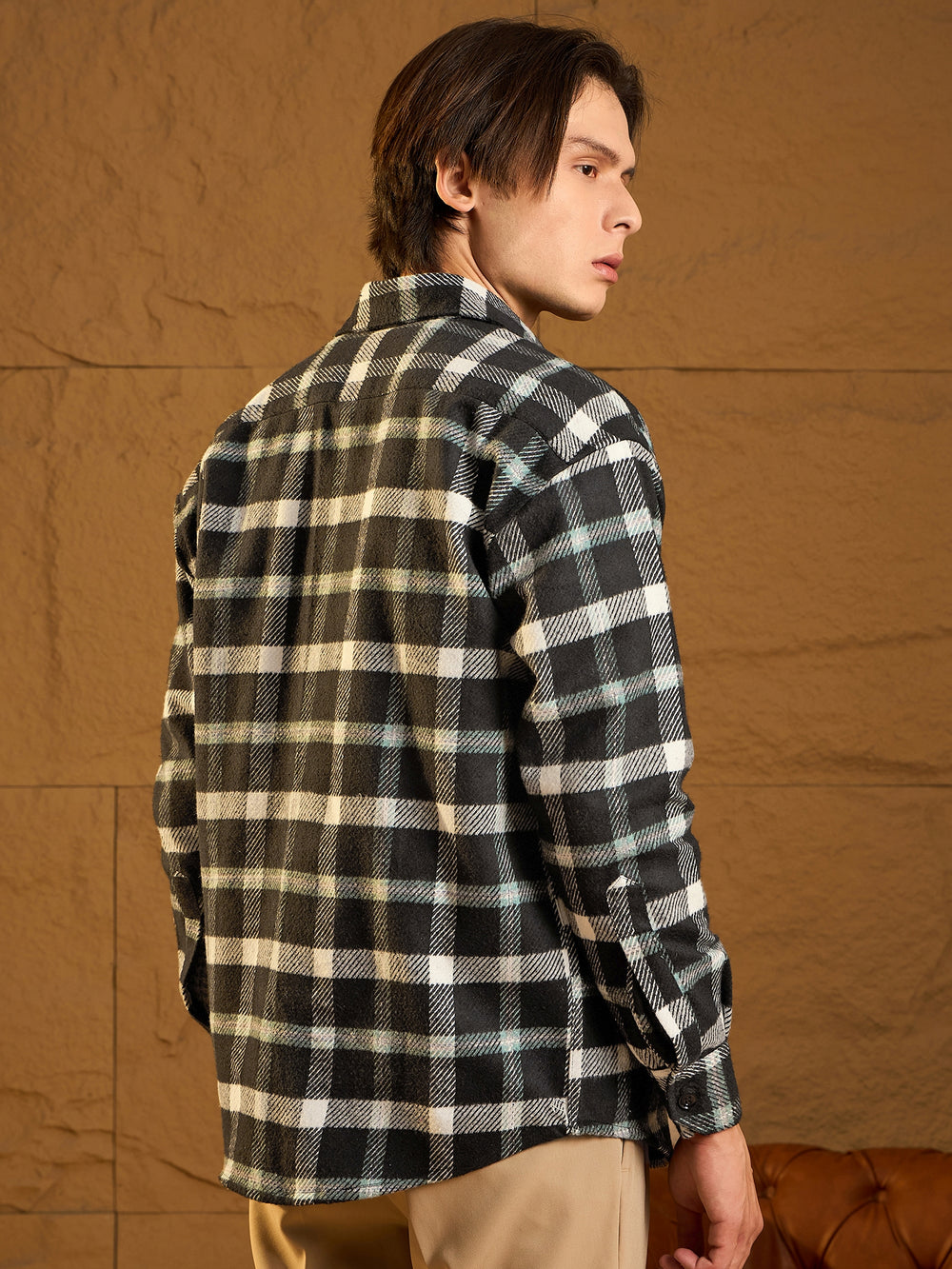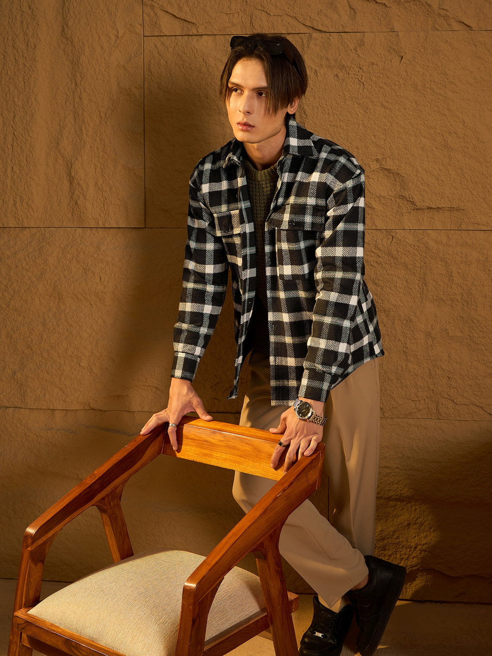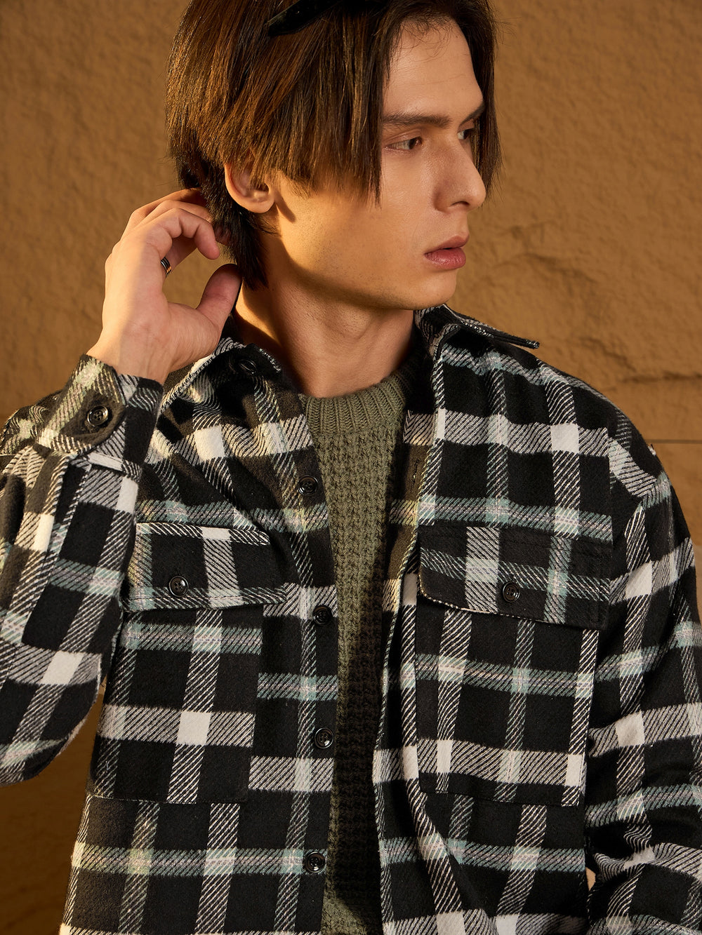 Black and White checked shacket featuring a spread collar, drop shoulders, oversized fit, full sleeves, 2 Flap pockets, and a stylish curved hemline