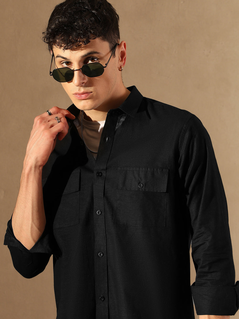 Black solid opaque casual shirt ,has a spread collar, button placket, 2 flap pockets, long regular sleeves, curved hem
