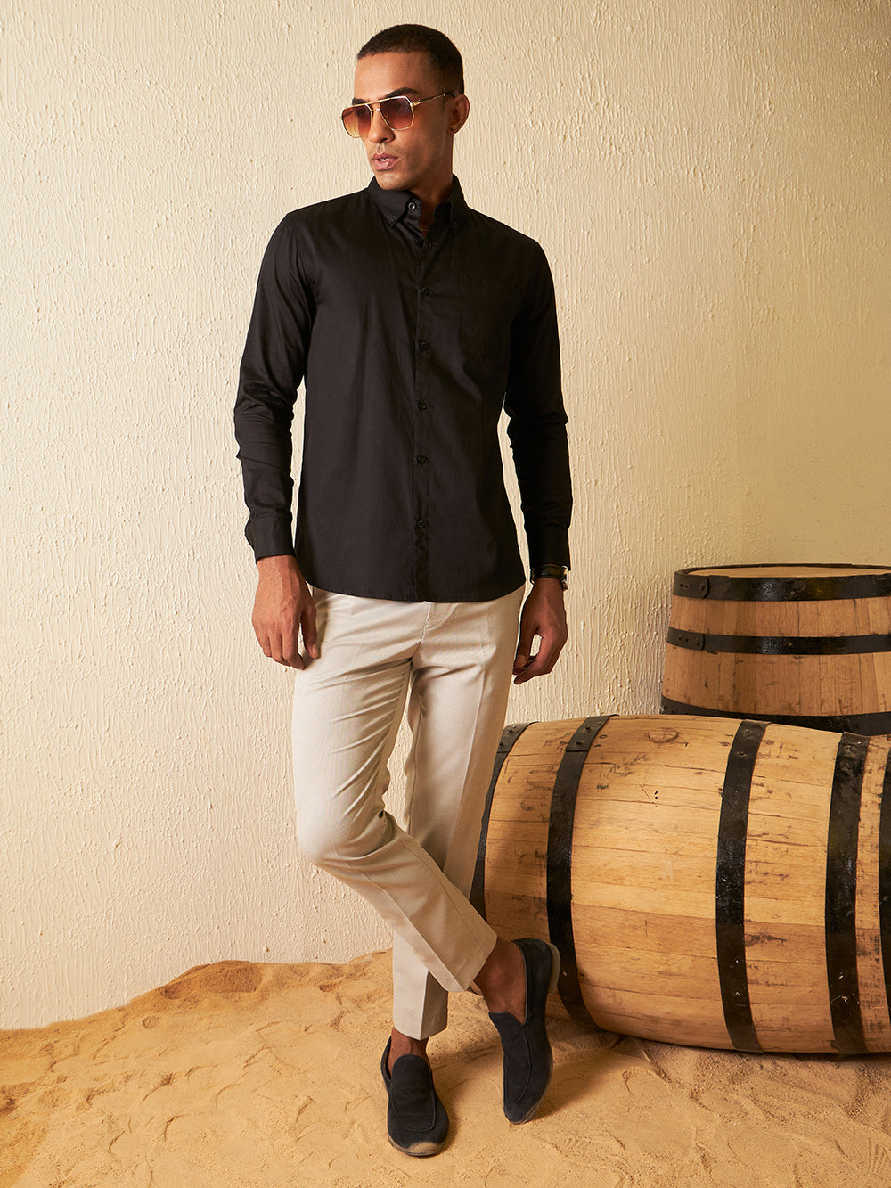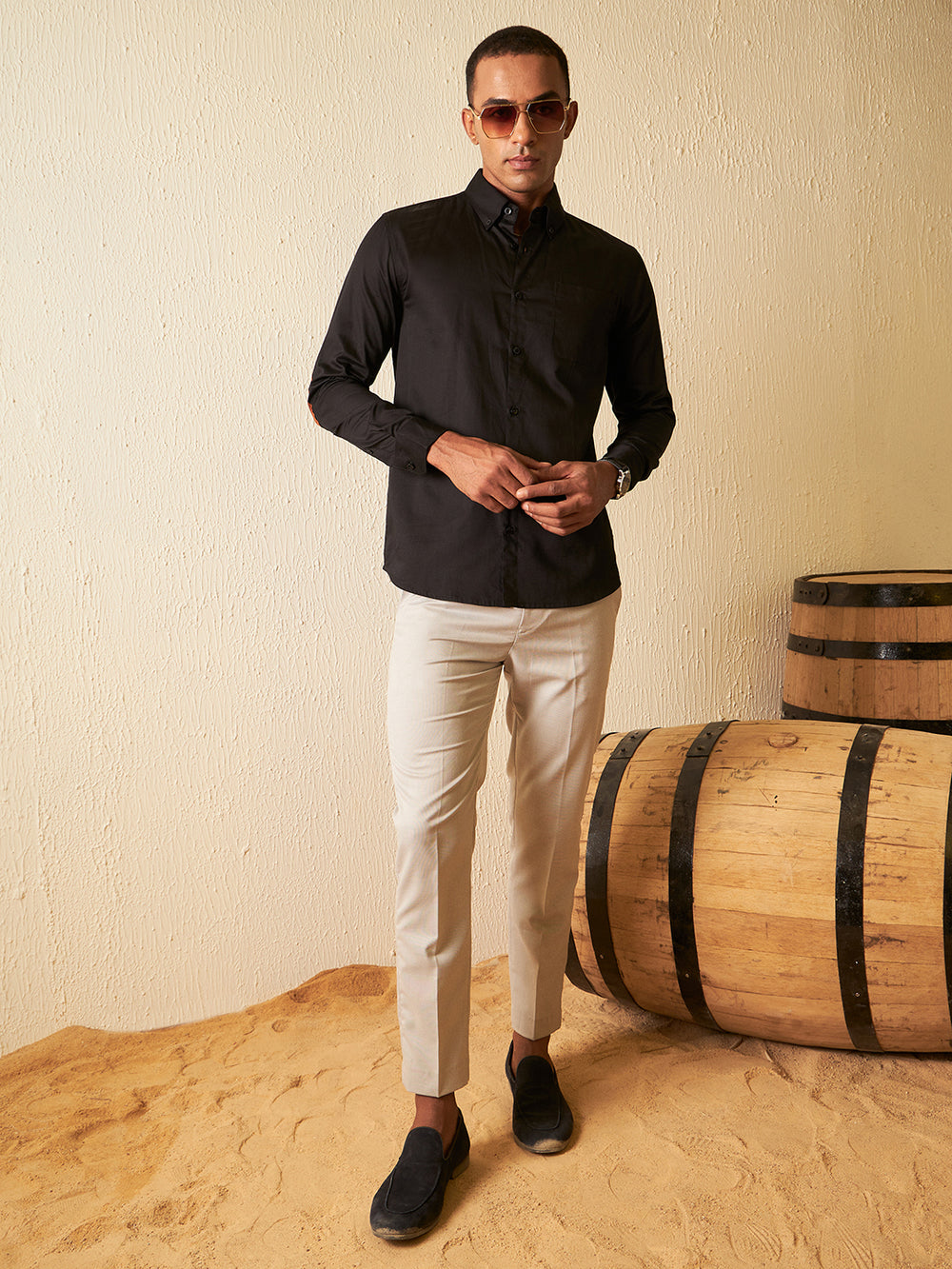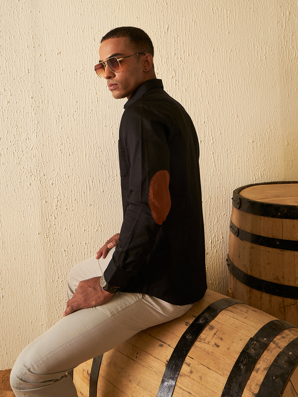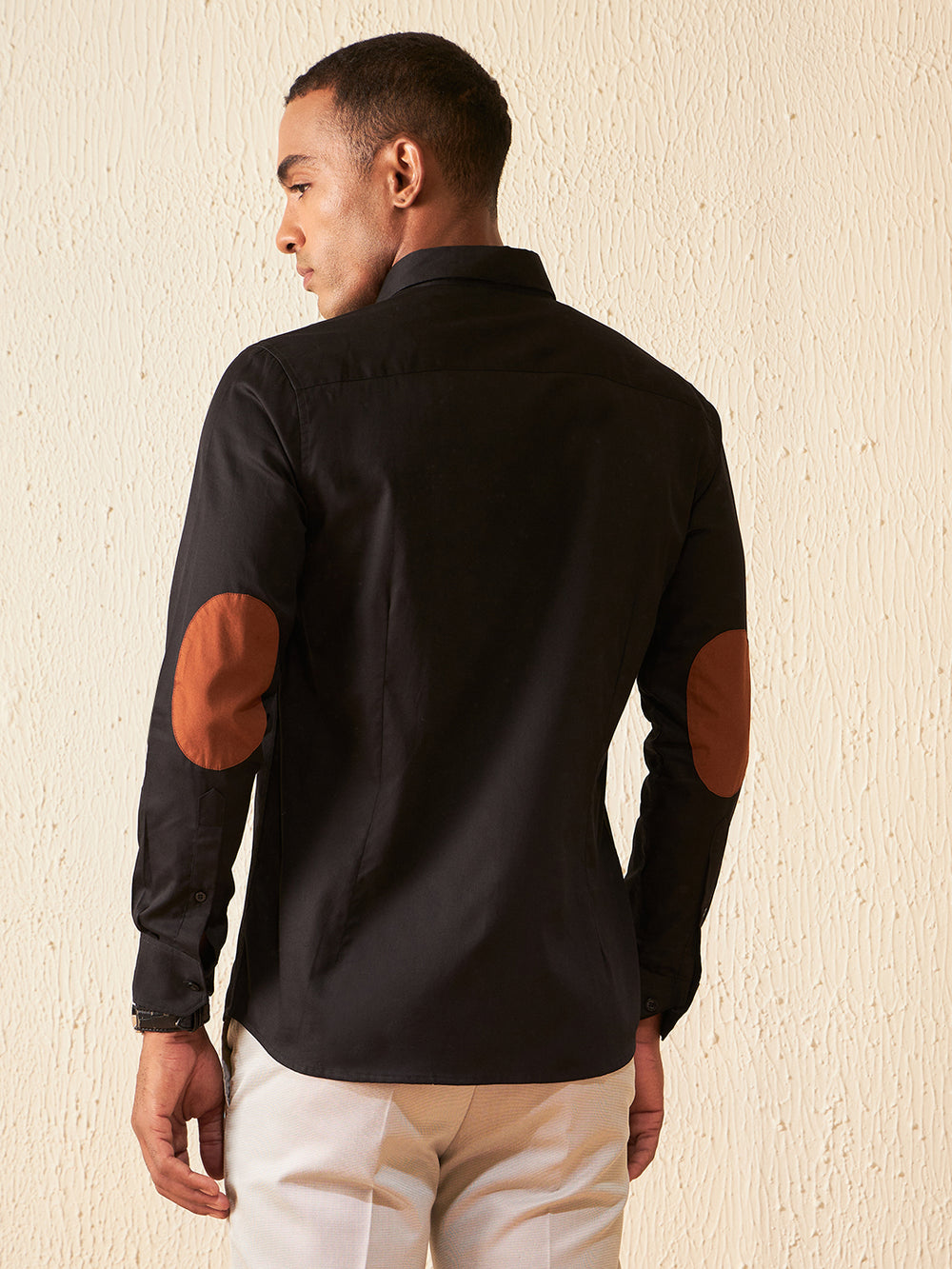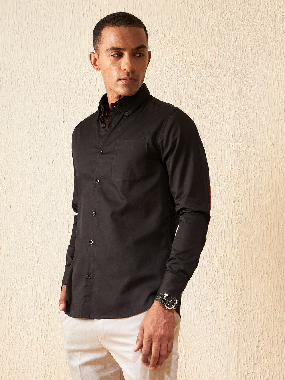 Black solid opaque Formal shirt ,has a button-down collar, button placket, 1 patch pocket, long regular sleeves with elbow patch, curved hem