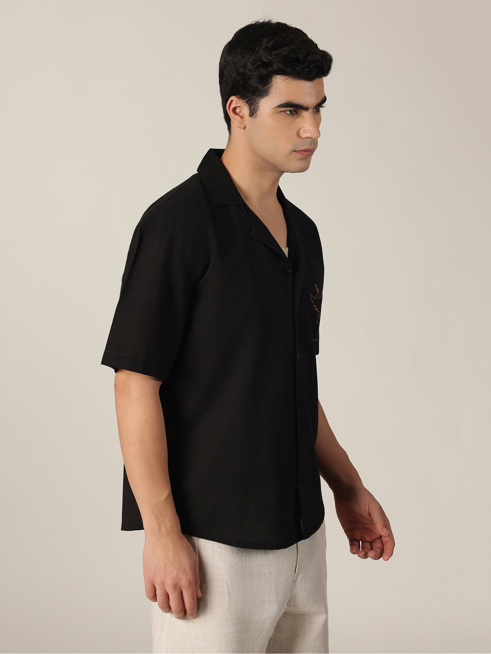 This embroidered Cuban-collar shirt blends relaxed structure with refined detailing. Its oversized silhouette and drop-shoulder cut create a modern, effortless vibe, perfect for elevating simple everyday looks with subtle sophistication.
