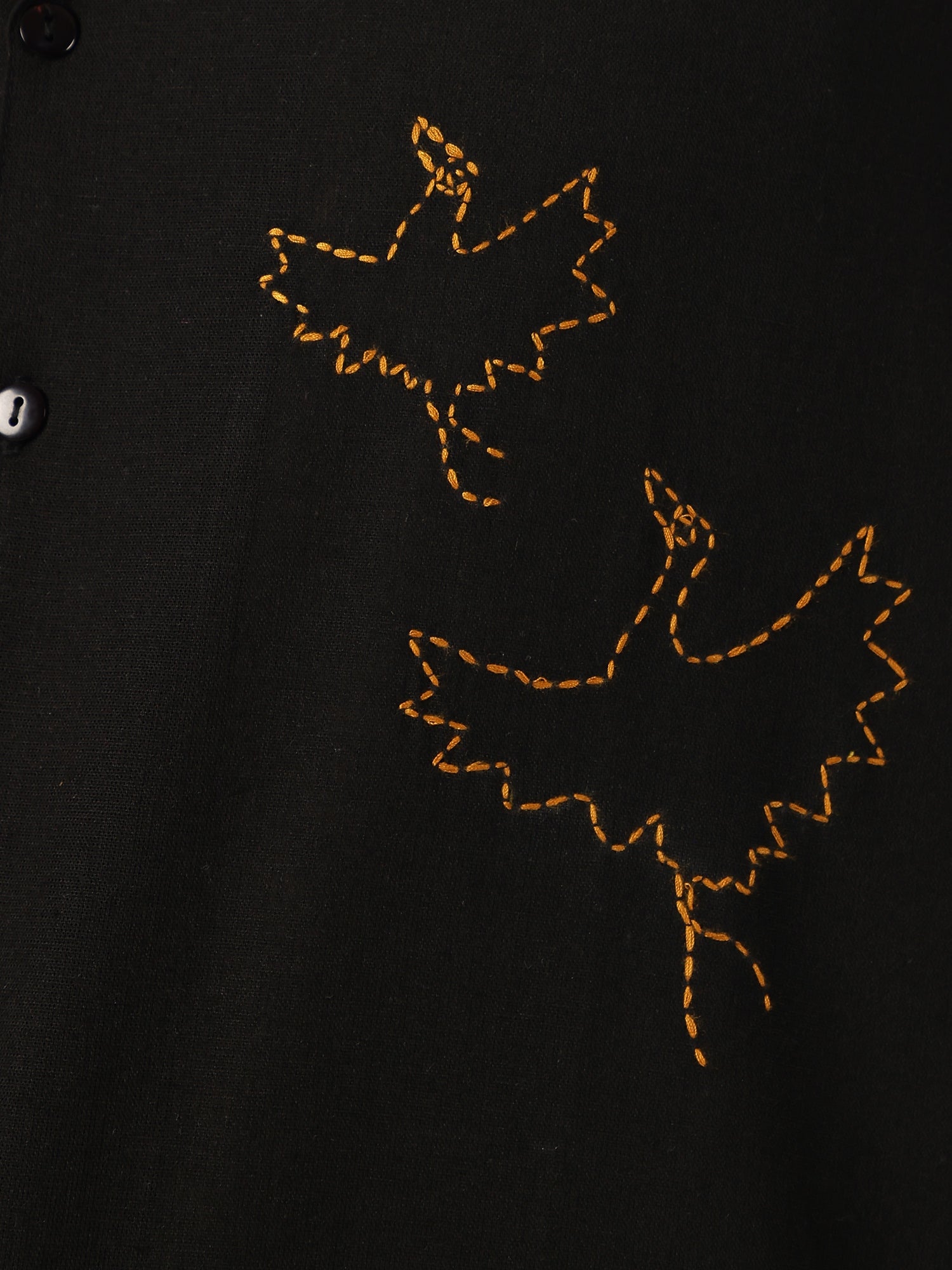Black: Embroidered Drop Shoulder Oversized Shirt