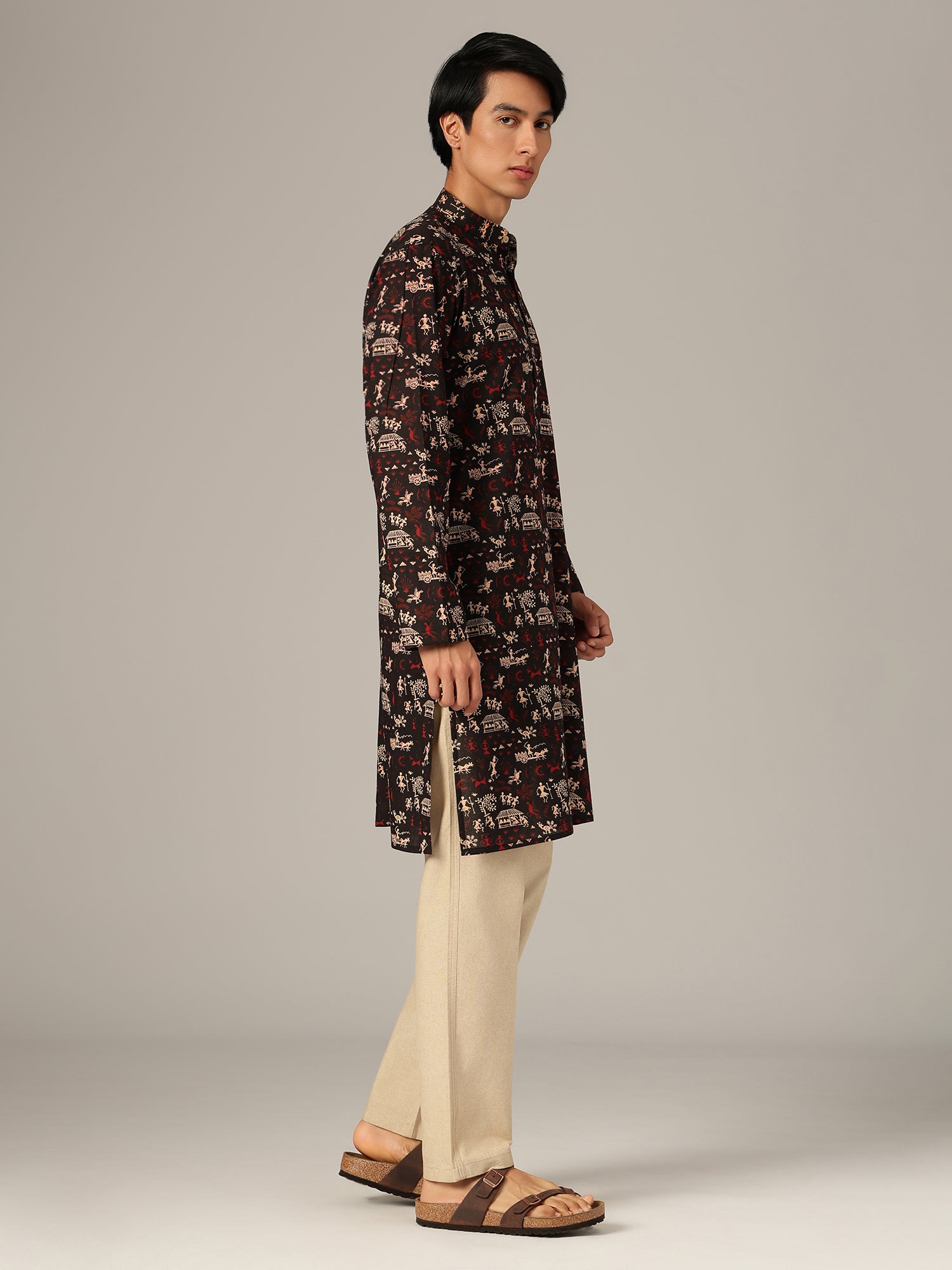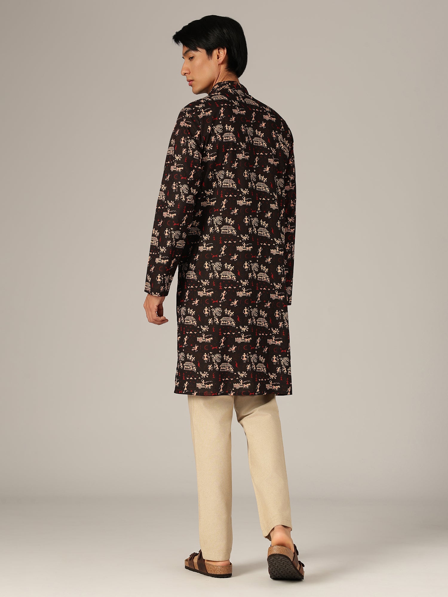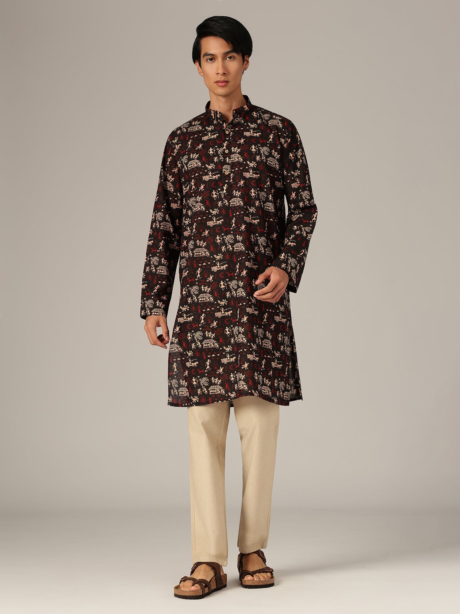 Traditional block prints in earthy tones bring a timeless appeal to this kurta, blending classic ethnic craftsmanship with a clean, structured silhouette for versatile everyday styling.