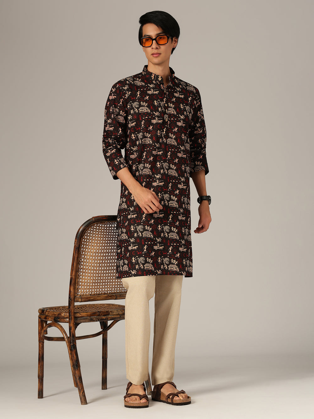 This regular fit ethnic block printed kurta is crafted from breathable cotton, featuring a mandarin collar, long sleeves, knee length silhouette, straight hemline, and side slits for ease of movement and all-day comfort.