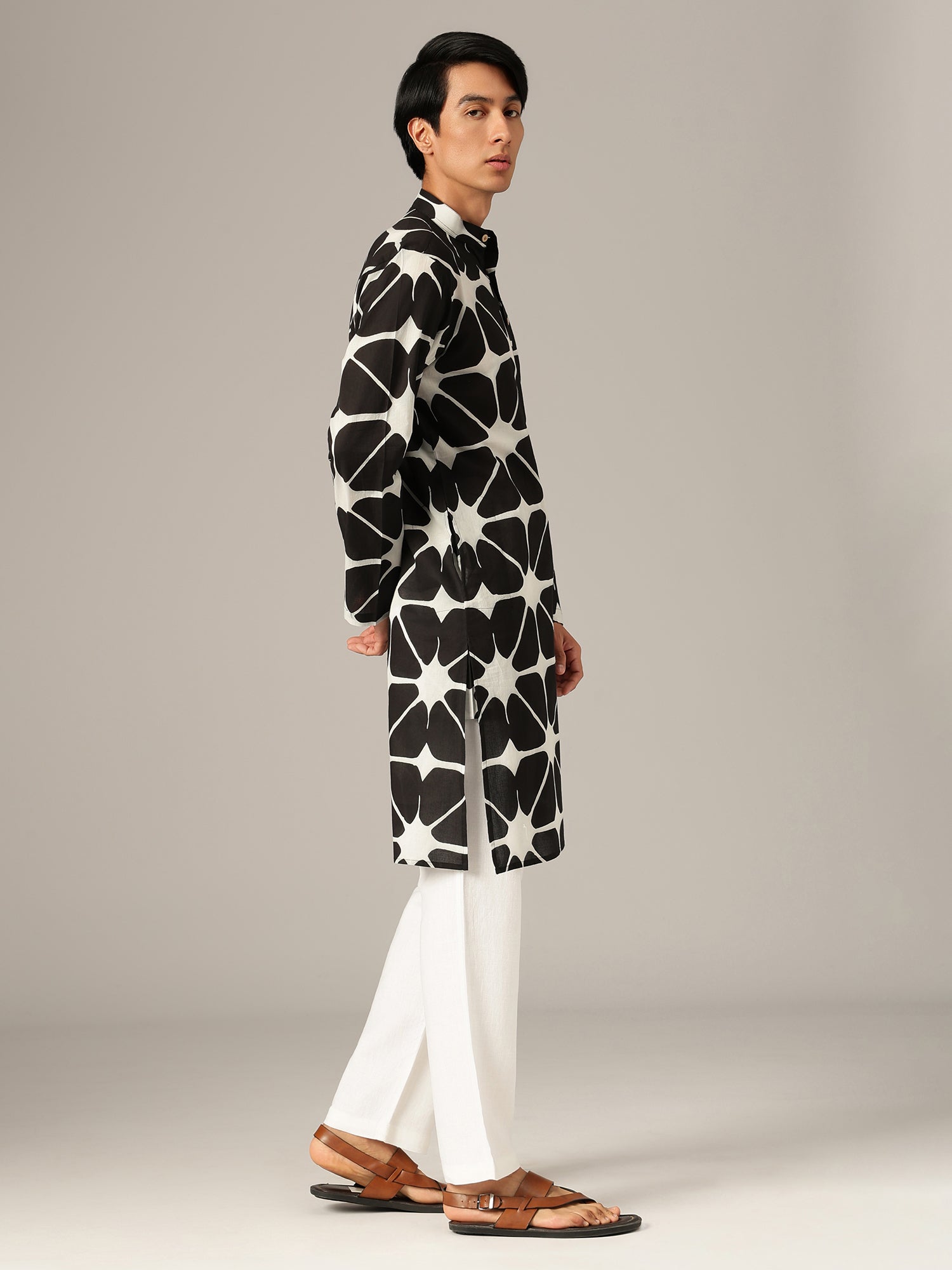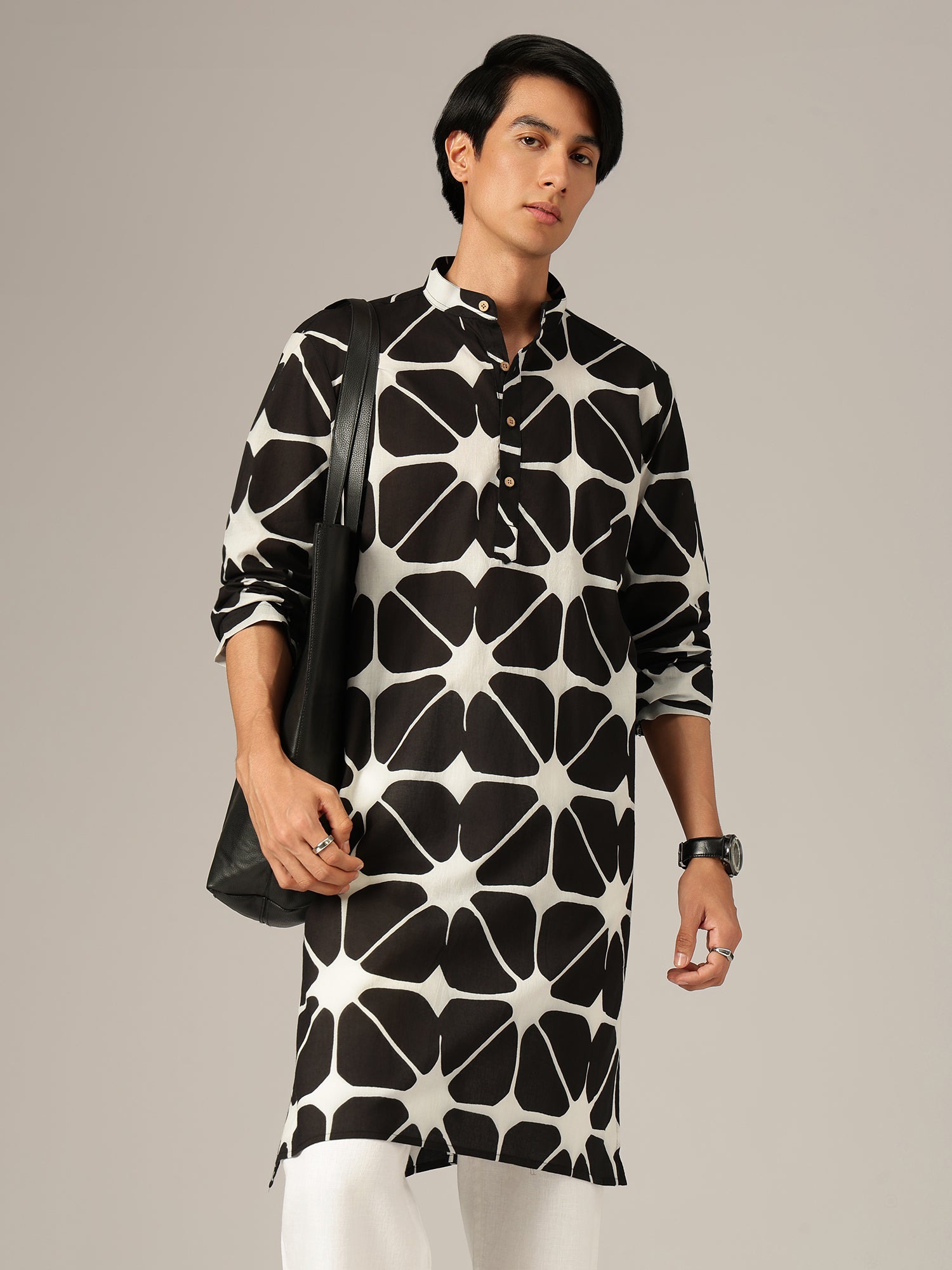 This regular fit geometric printed kurta is crafted from breathable cotton, featuring a mandarin collar, long sleeves, knee length silhouette, straight hemline, and side slits, offering structured comfort in a sleek monochrome color palette.