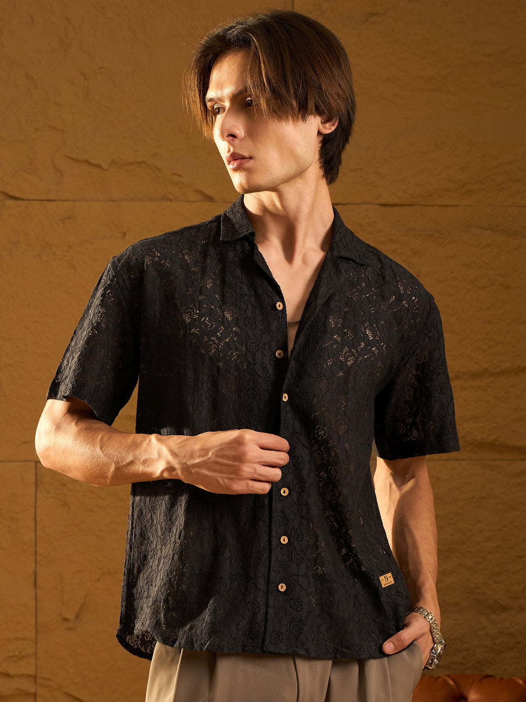 Black schiffli semi sheer Casual shirt, has a Cuban collar, button placket, short drop shoulder sleeves, curved hem