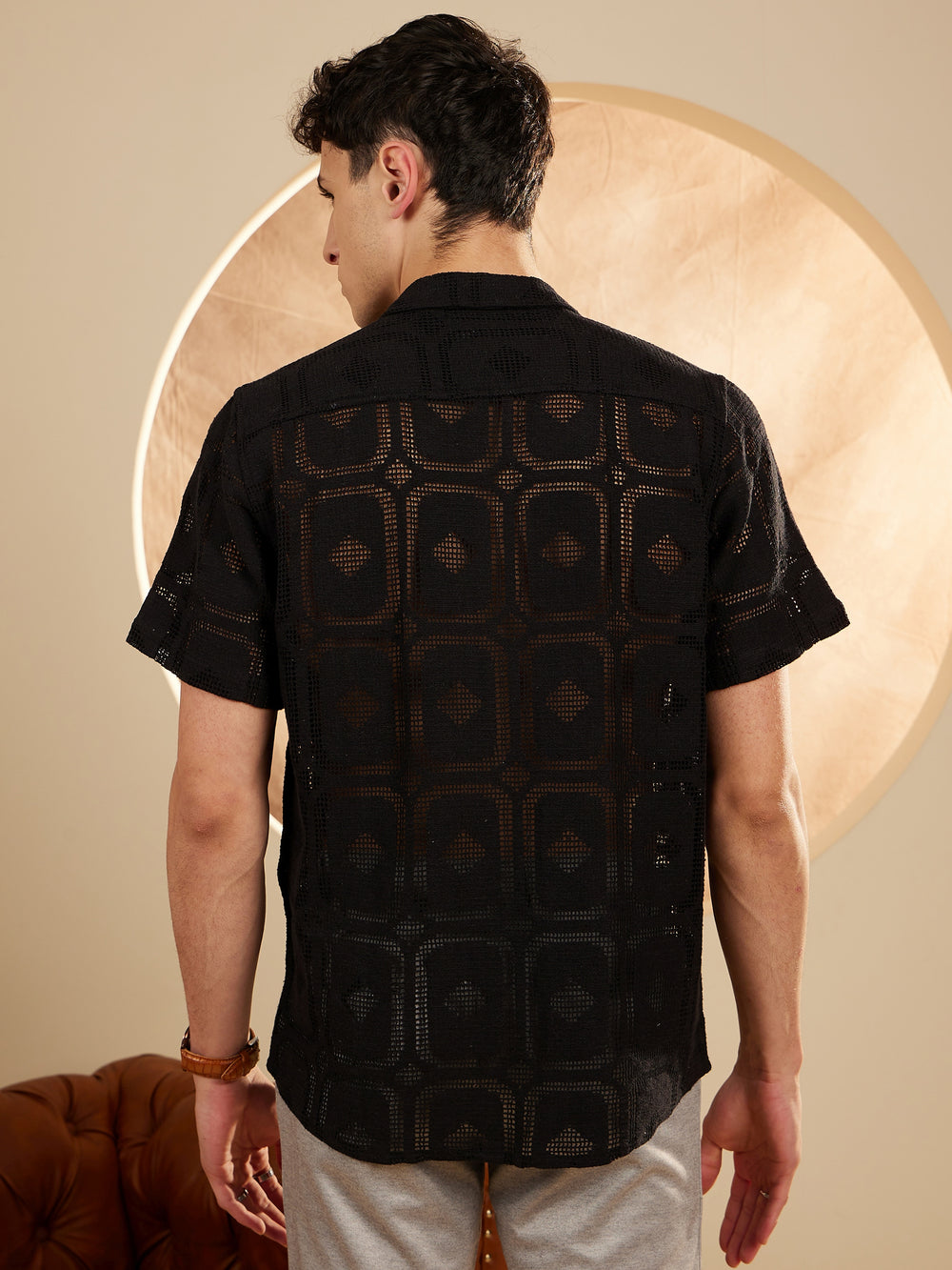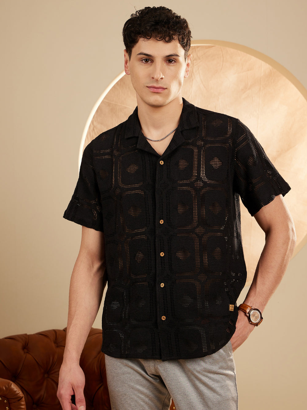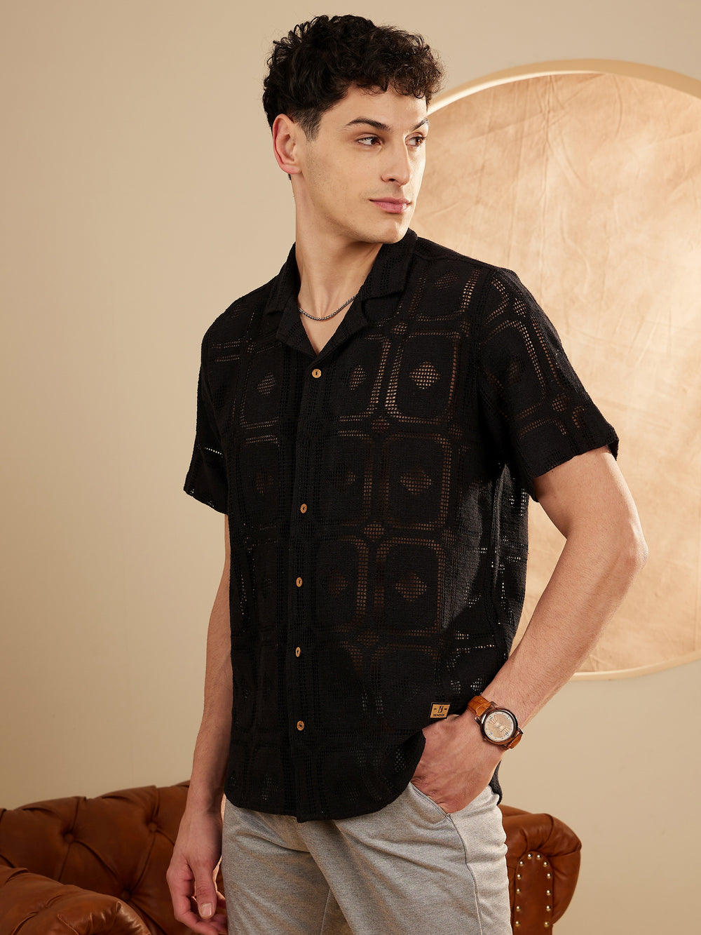 Black self designed semi sheer casual shirt ,has a cuban collar, button placket, short regular sleeves, curved hem