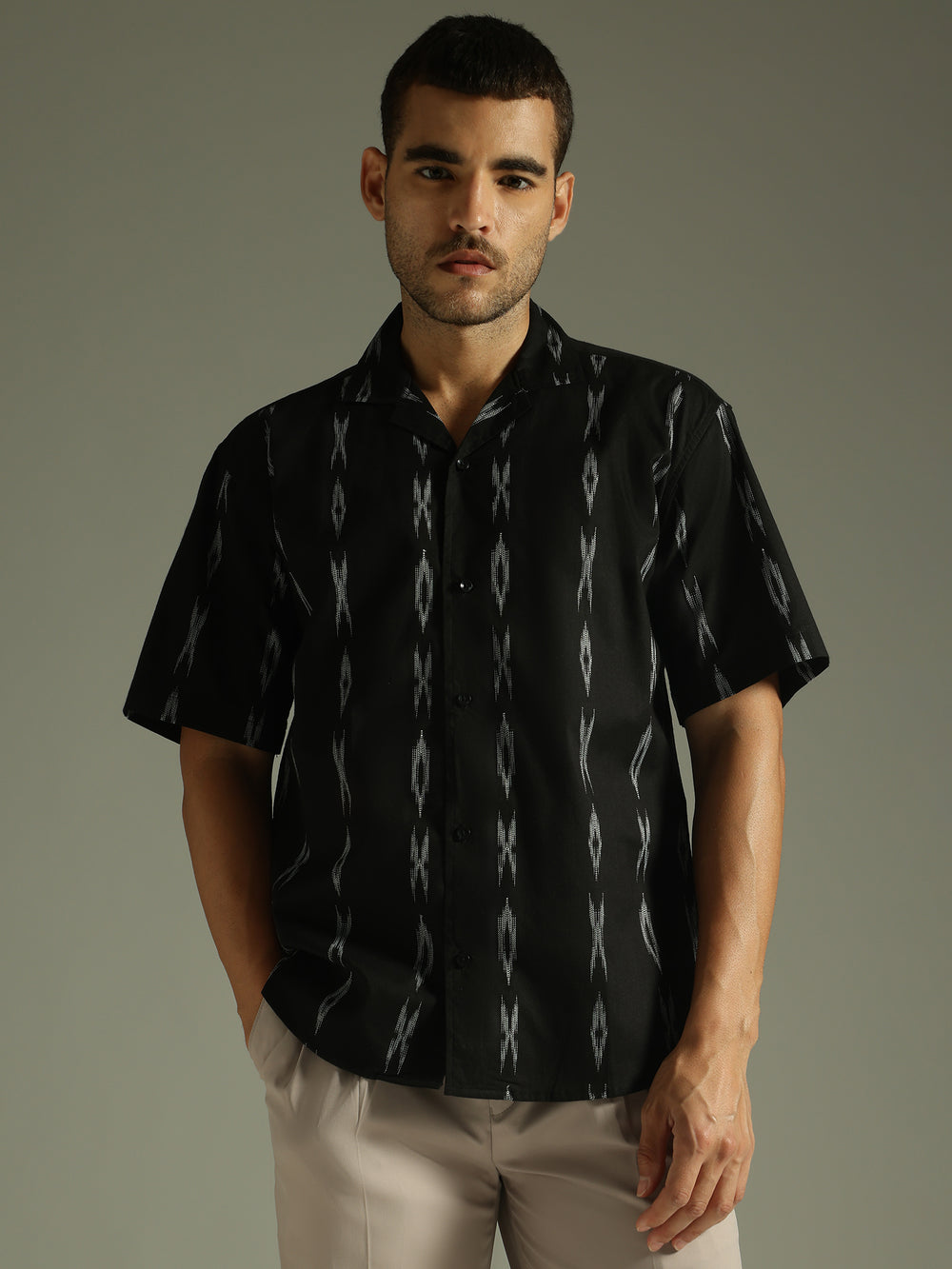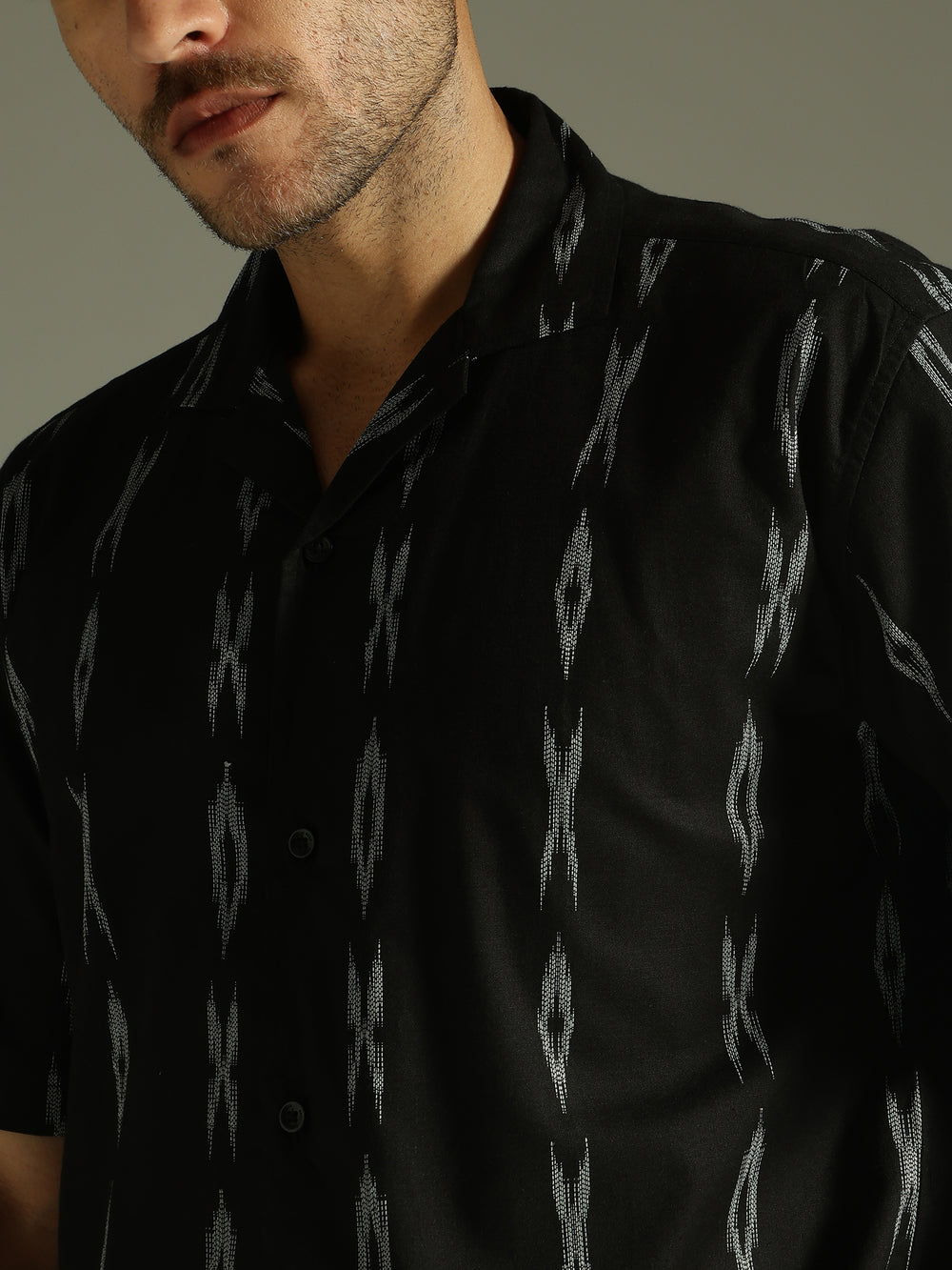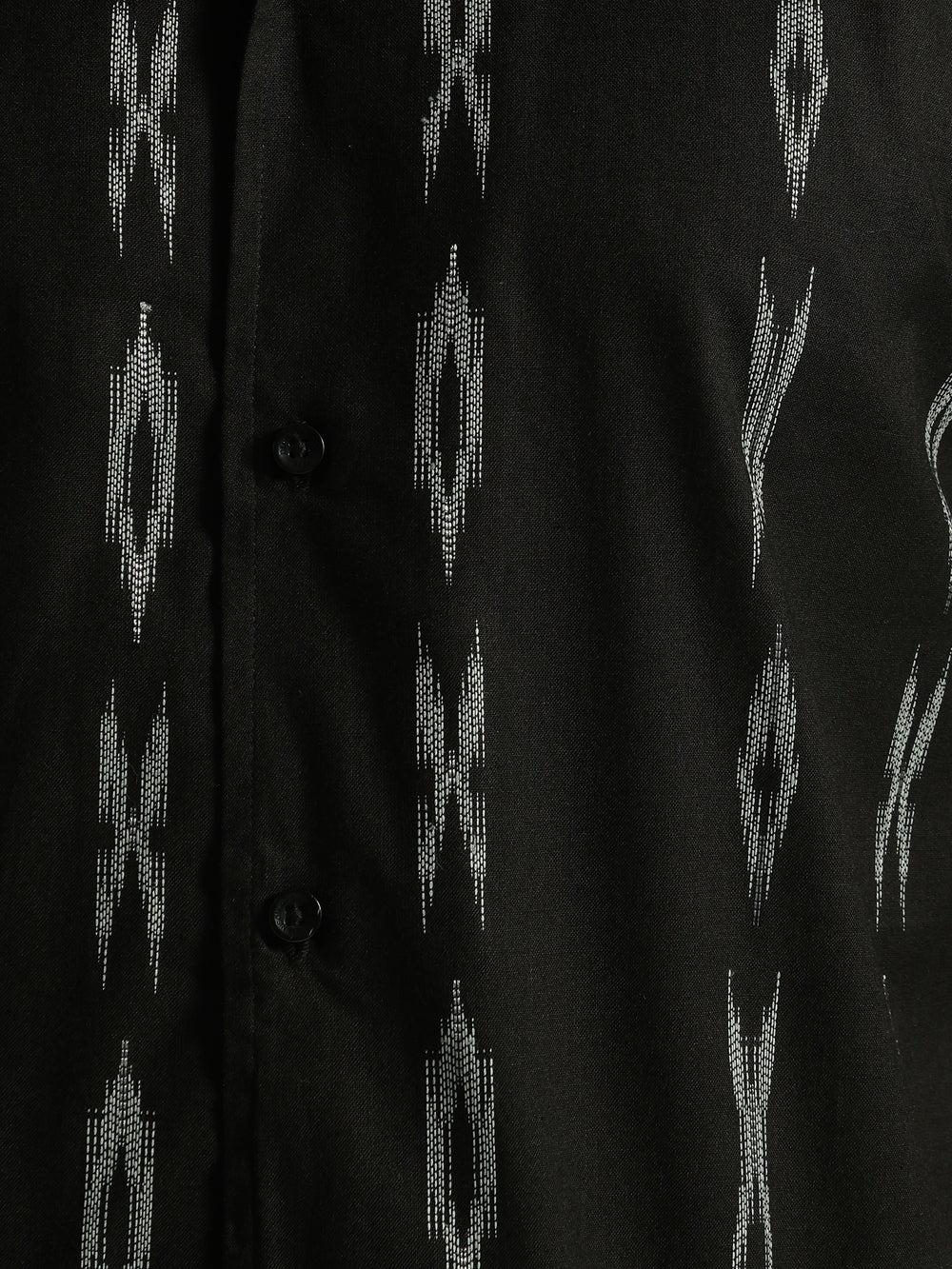 This Regular Fit Ikat Embroidered Shirt is crafted from soft, durable poly cotton. It features a Cuban Collar, Half Sleeves, Regular Shoulders, Curved Hemline, and a clean, minimalist design with no pockets.