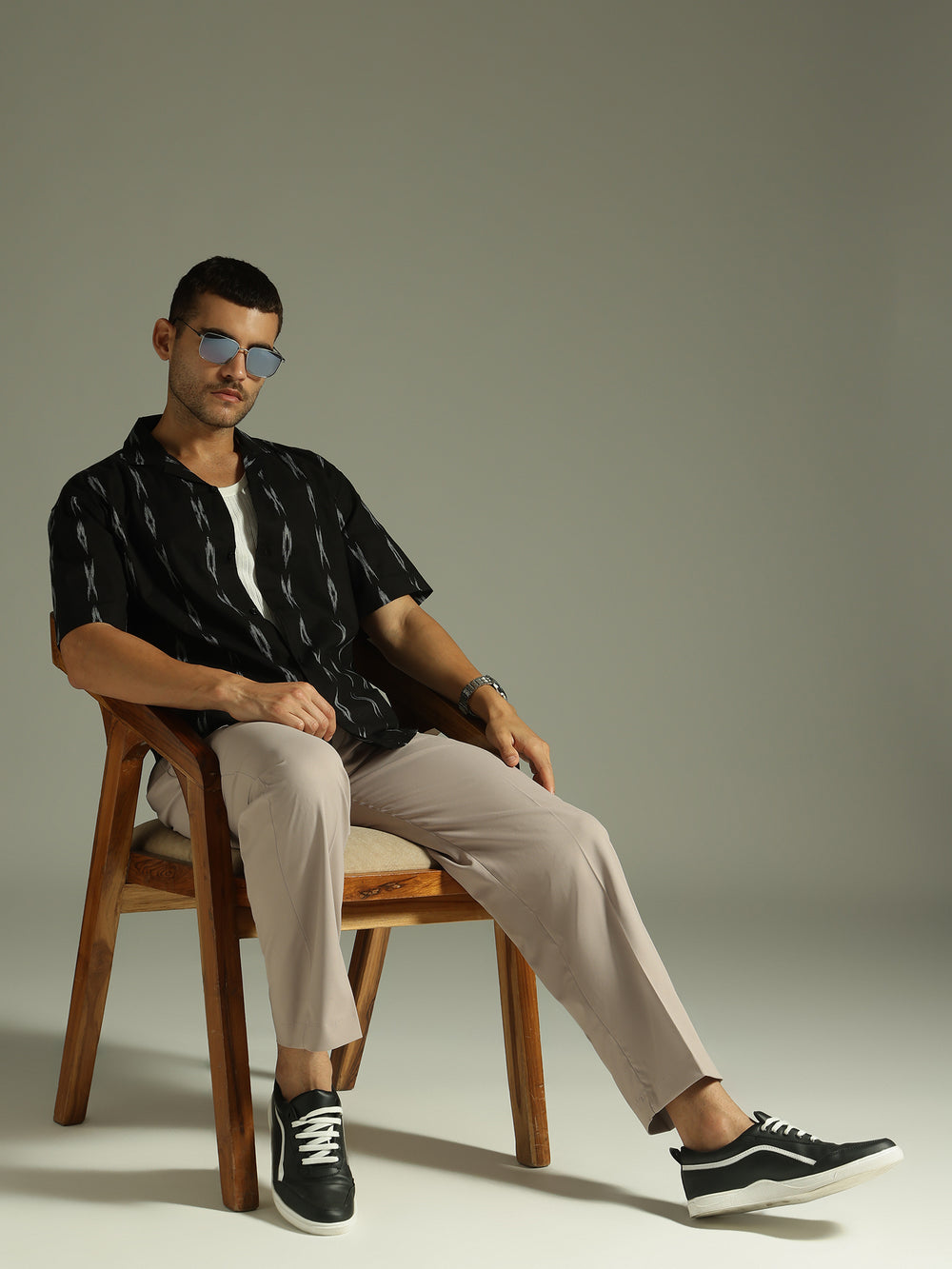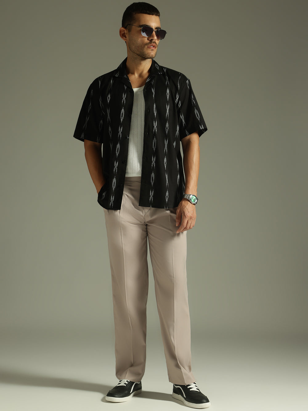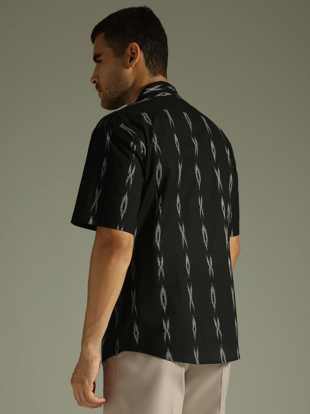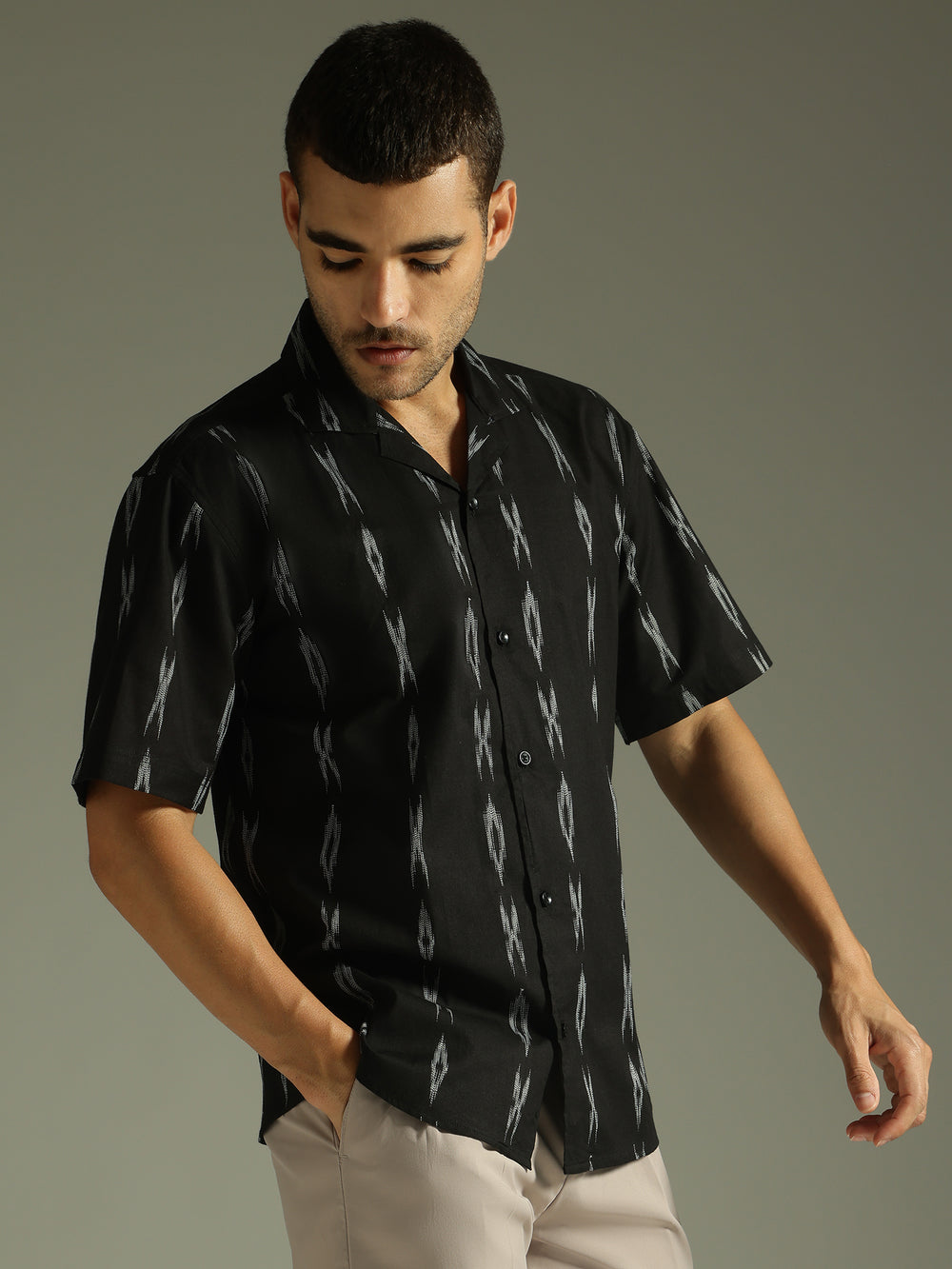 This Regular Fit Ikat Embroidered Shirt is crafted from soft, durable poly cotton. It features a Cuban Collar, Half Sleeves, Regular Shoulders, Curved Hemline, and a clean, minimalist design with no pockets.