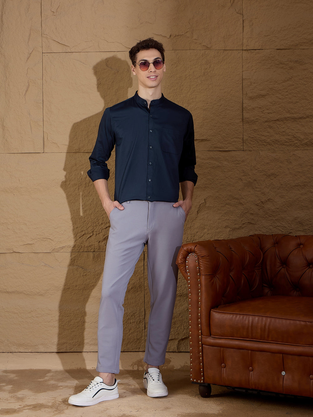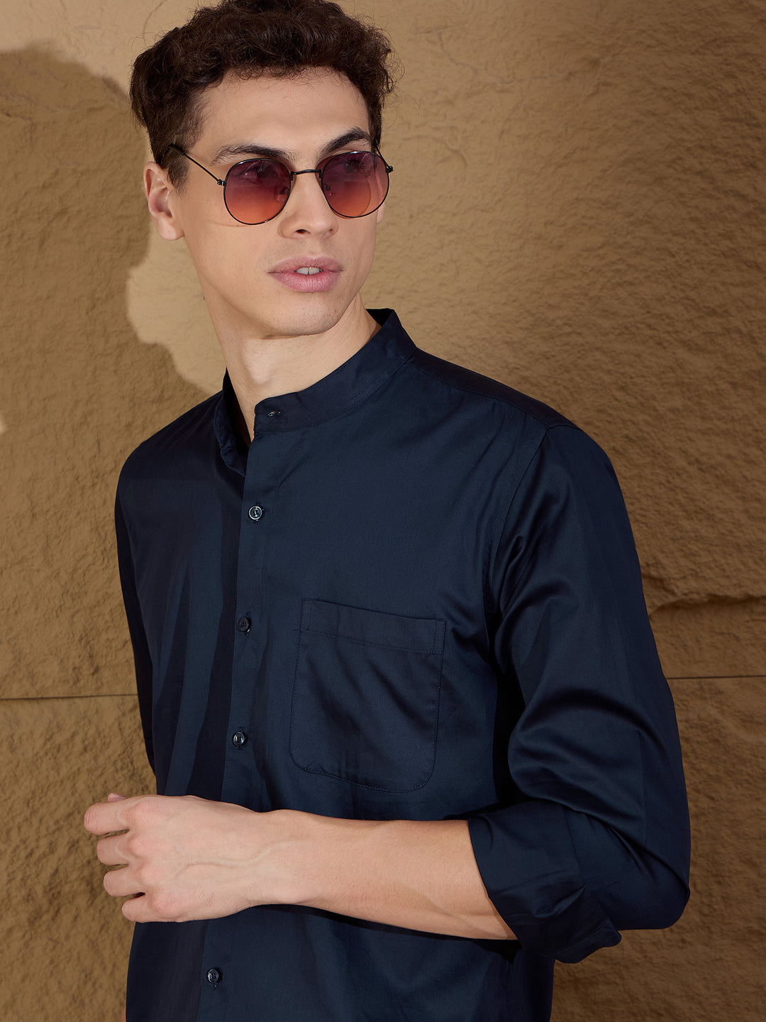 Navy Blue solid opaque Casual shirt has a mandarin collar, button placket, 1 patch pocket, long regular sleeves, curved hem