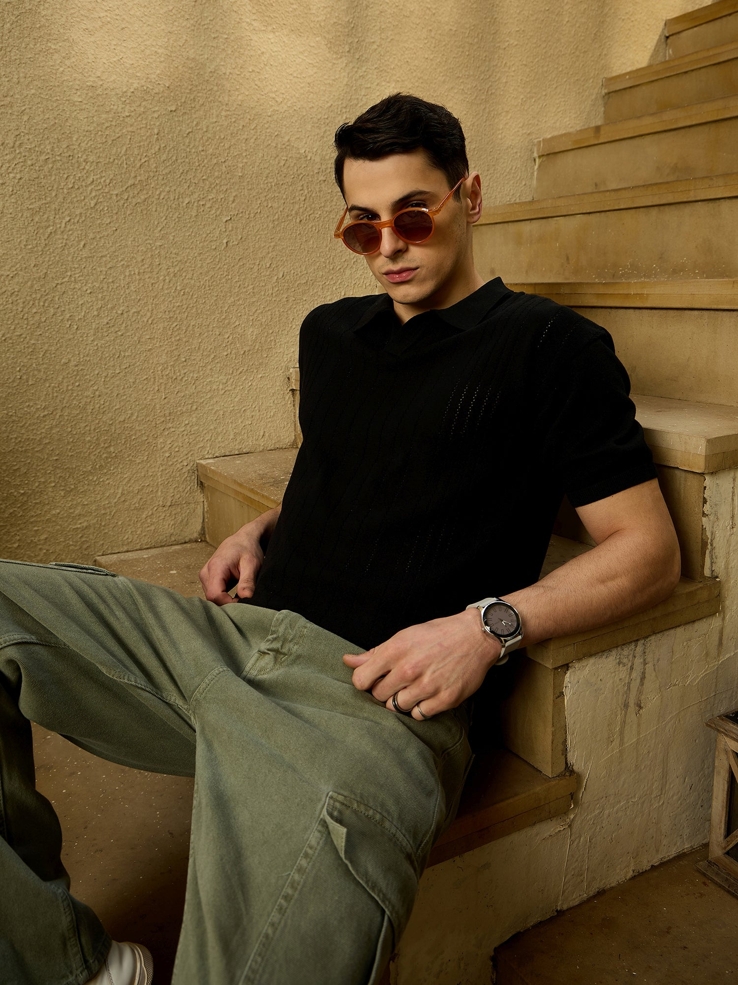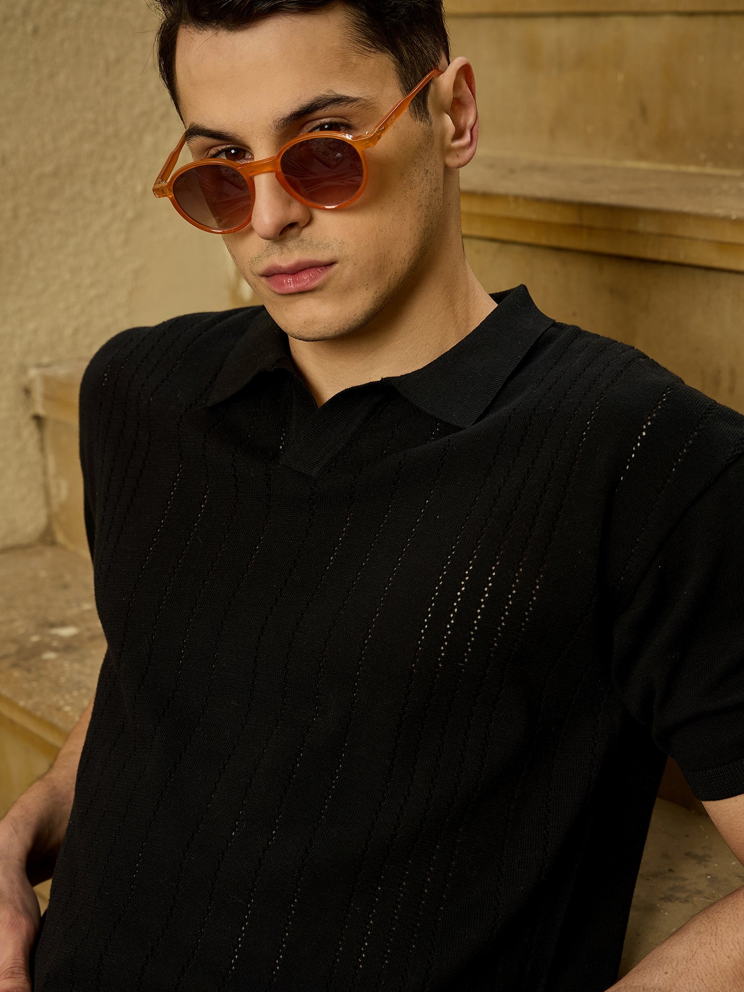 Black Textured Oversized Semi Sheer Knitted T-shirt ,has a Polo collar, no pocket, Half regular sleeves, full front coverage Self Design