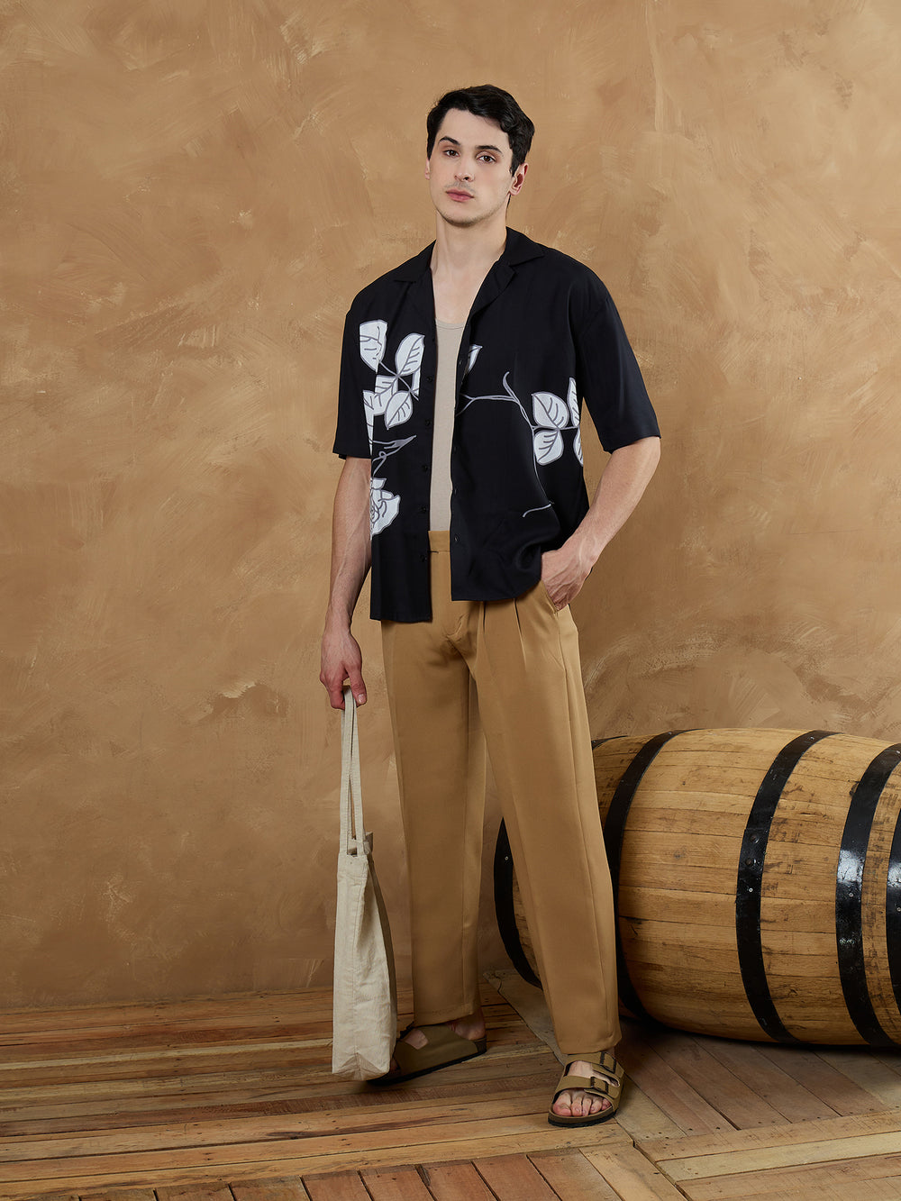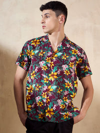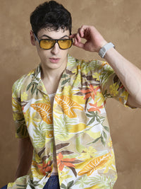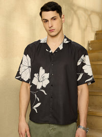 This Oversize Fit Floral Printed Placement Shirt is crafted from breathable Viscose Riyon, featuring a bold floral design, Cuban collar, drop-shoulder, and half sleeves—perfect for effortless casual style with standout appeal.