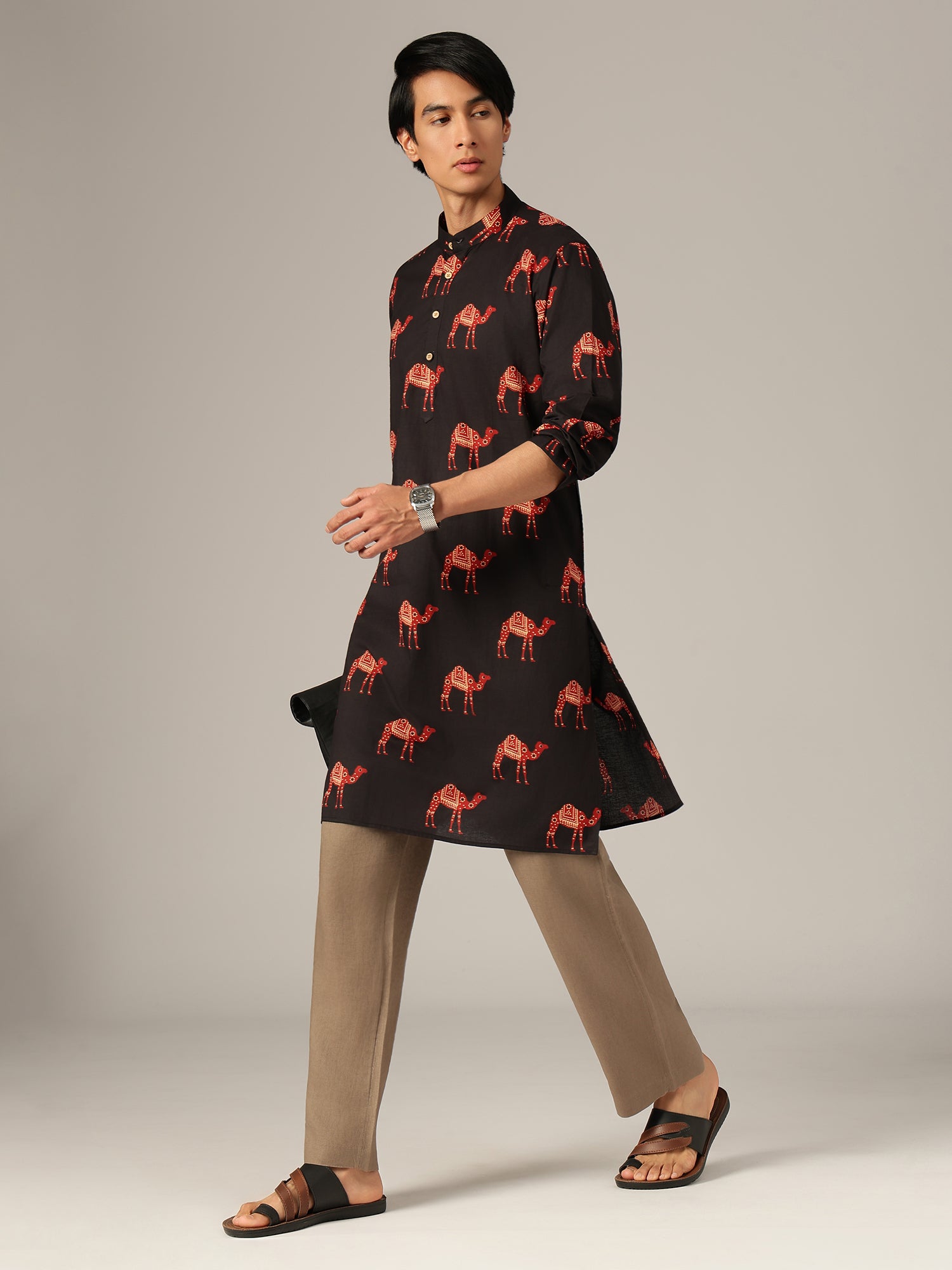 This regular fit ethnic block printed kurta is crafted from breathable cotton, featuring a mandarin collar, long sleeves, knee length silhouette, straight hemline, and side slits for ease, comfort, and everyday ethnic styling.