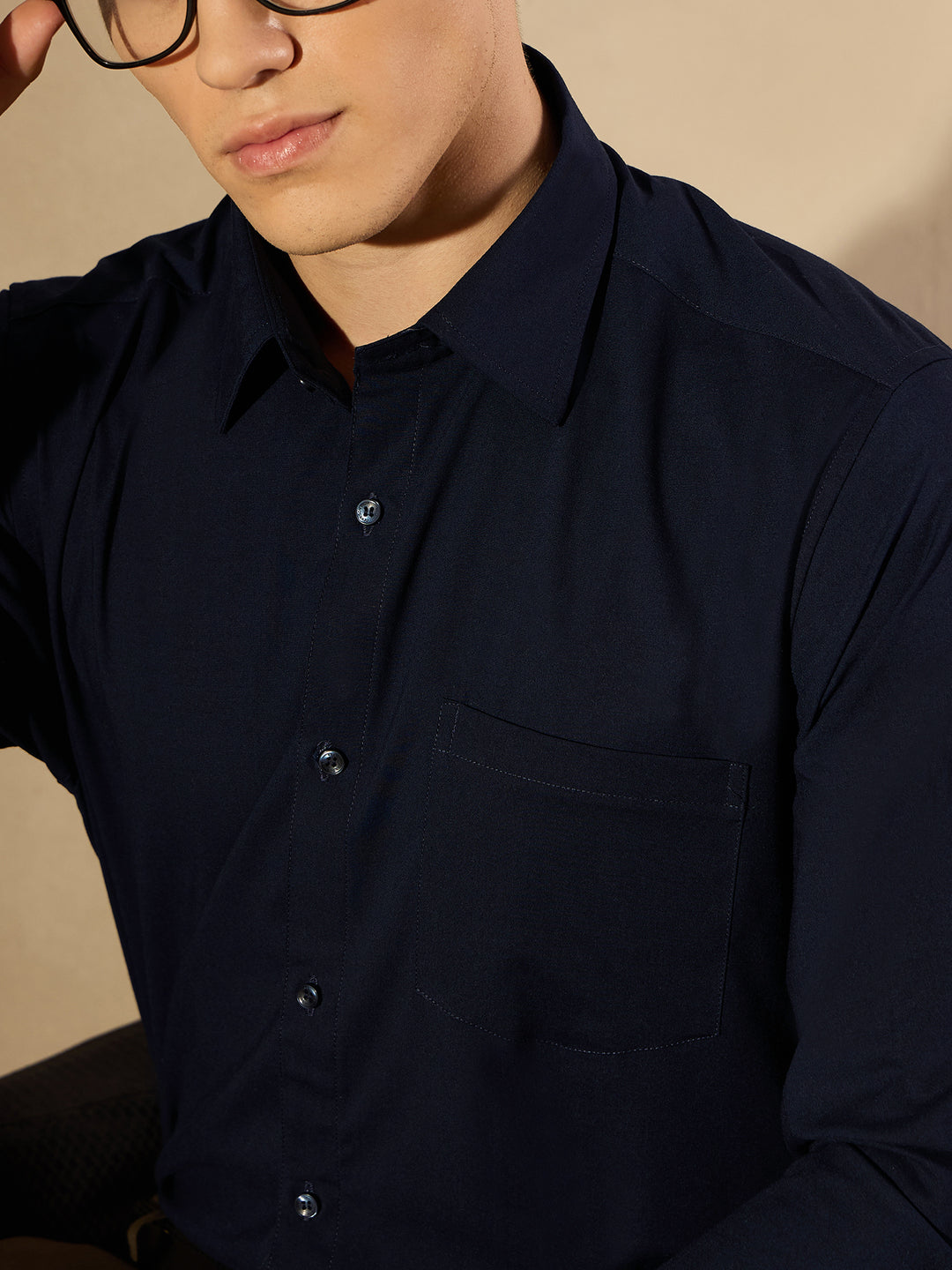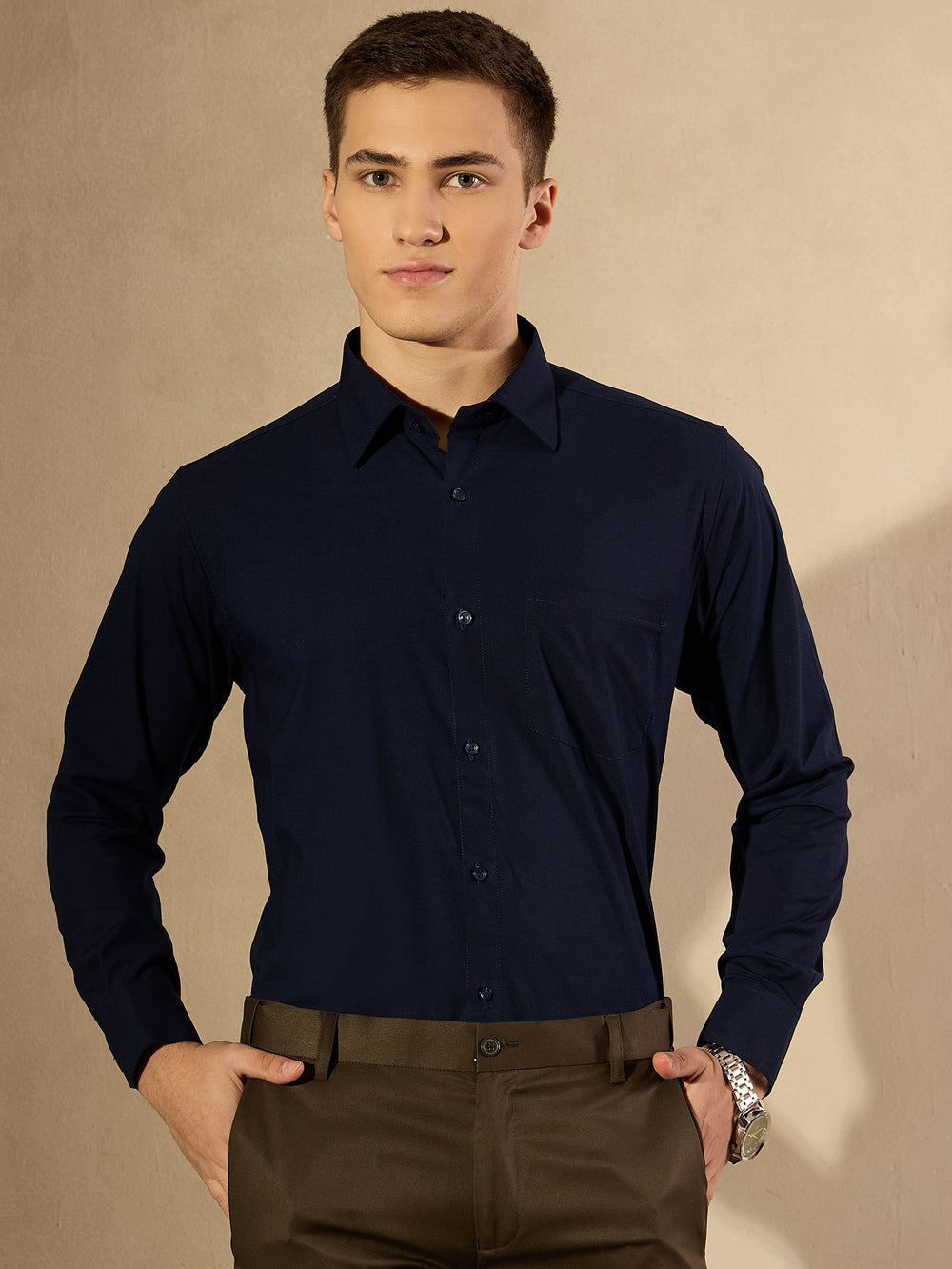 Navy Blue Solid opaque formal shirt, has a spread collar, button placket, long regular sleeves,1 Patch Pocket, straight hem