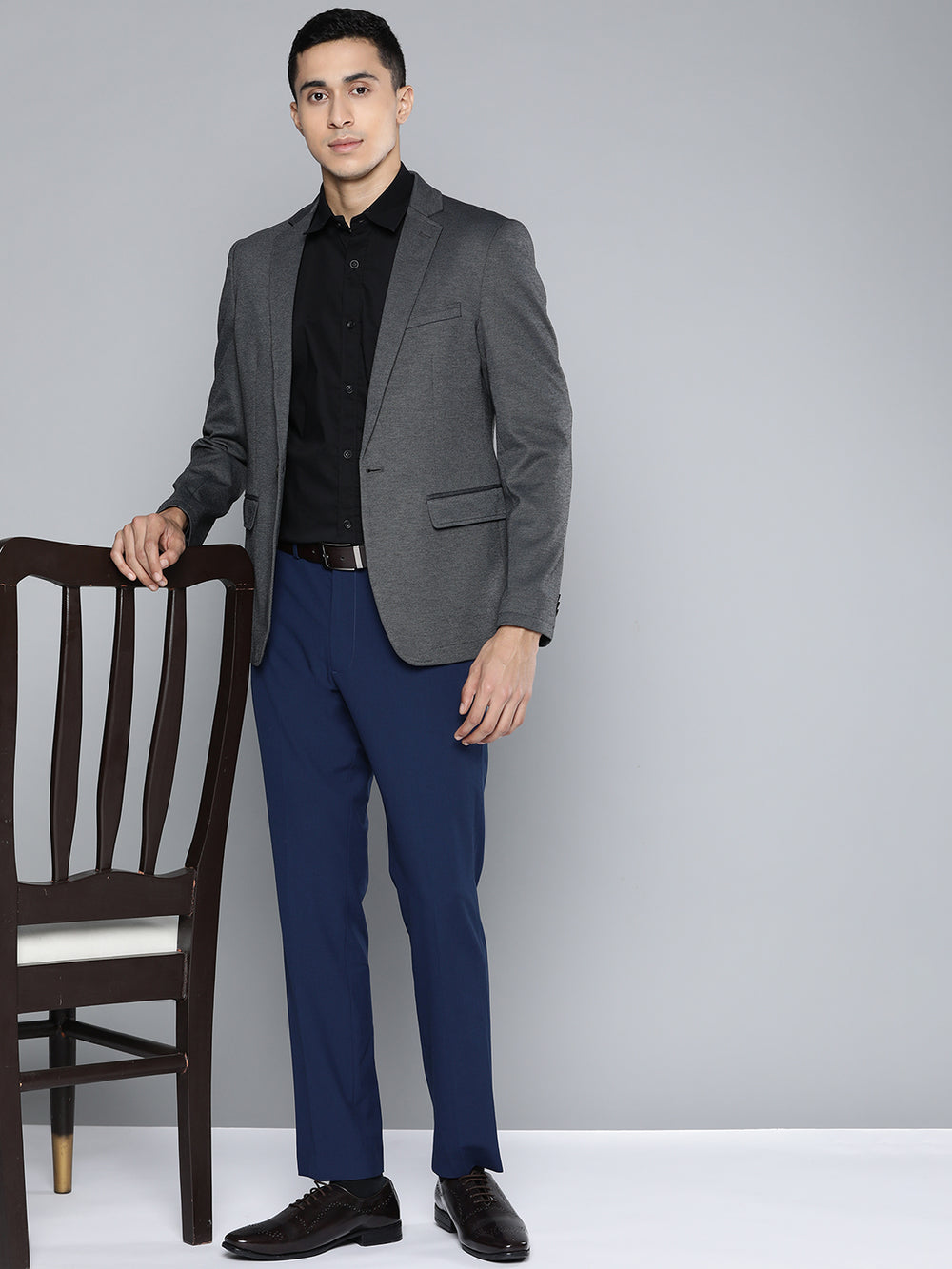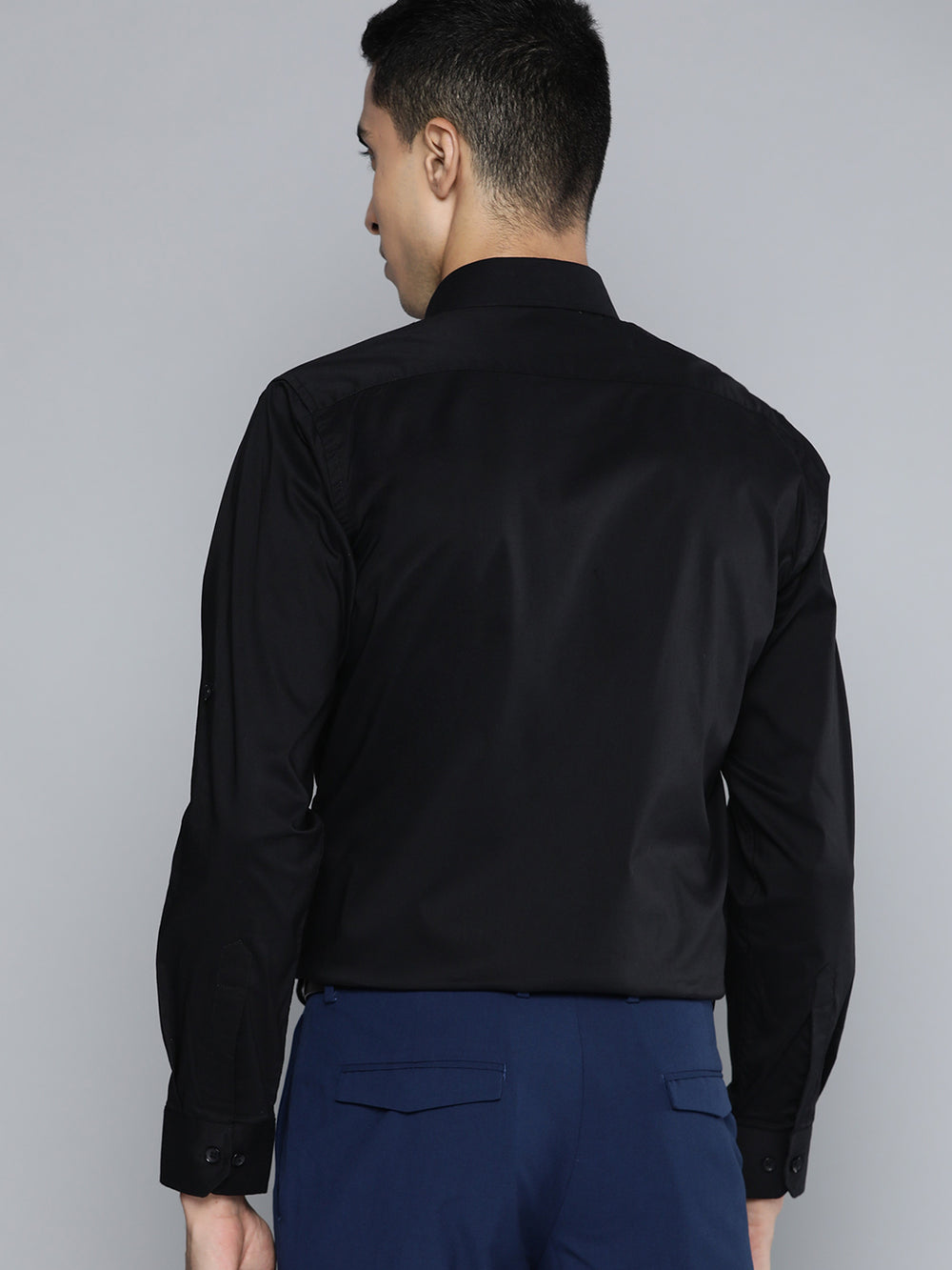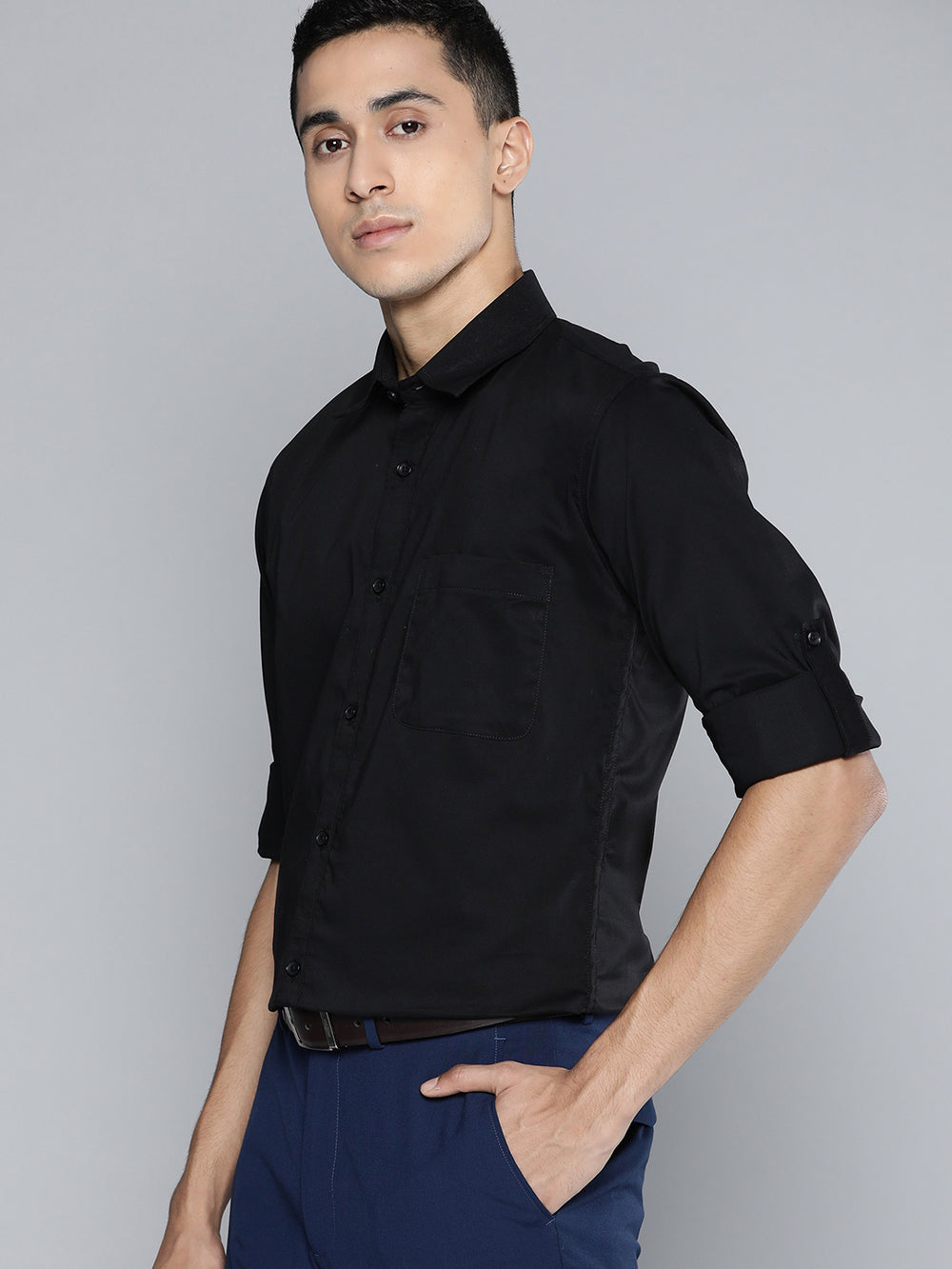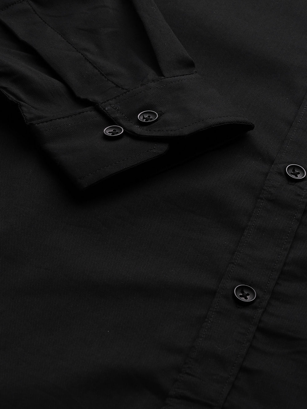 Black solid opaque knitted Formal shirt ,has a spread collar, button placket, 1 patch pocket, long roll-up sleeves, curved hem