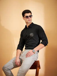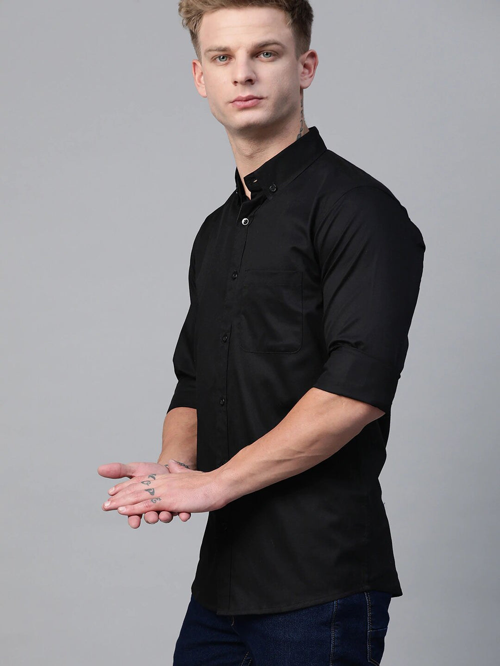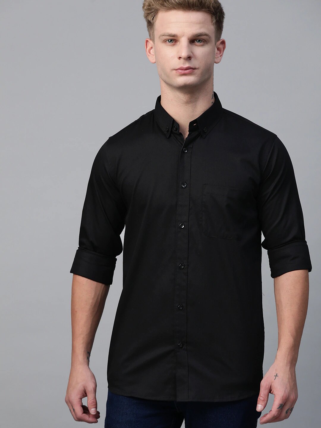 Black solid casual shirt, has a button-down collar, long sleeves, button placket, curved hem, and 1 patch pocket