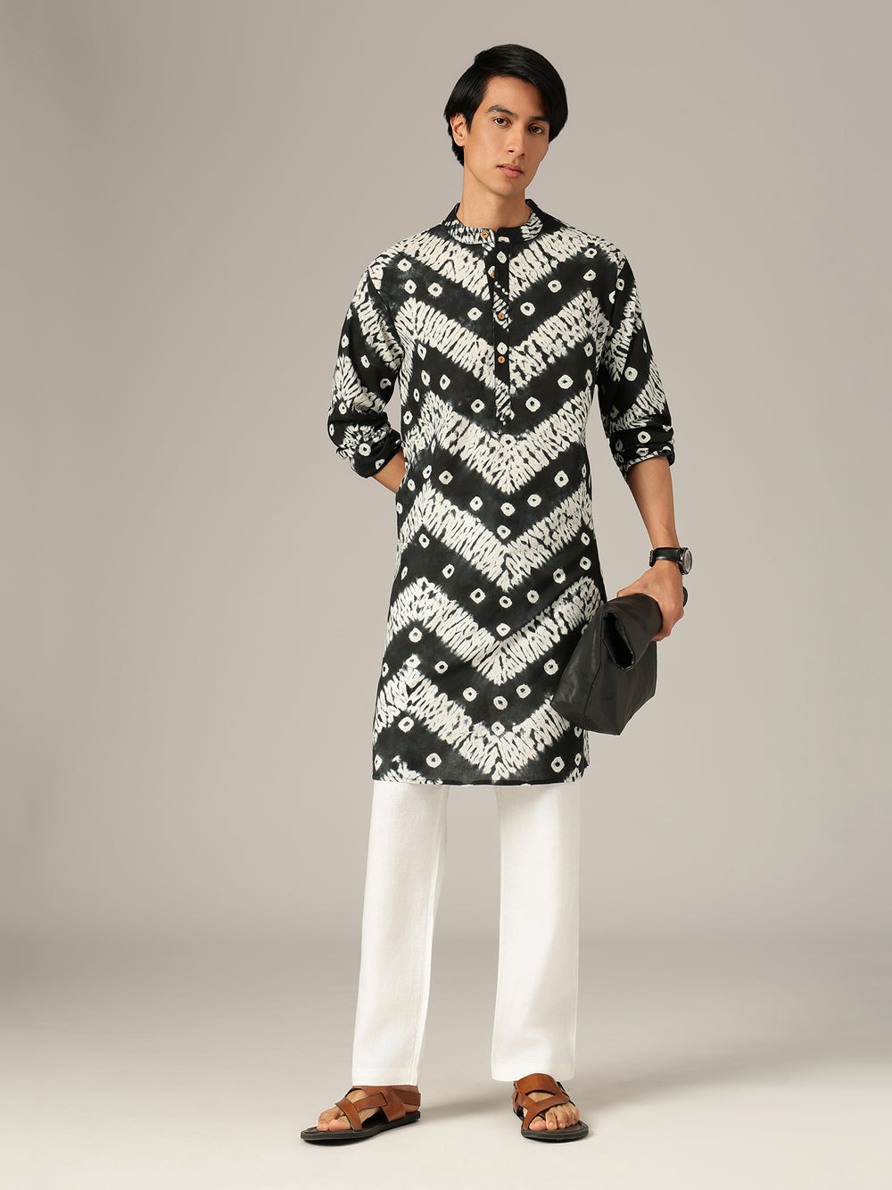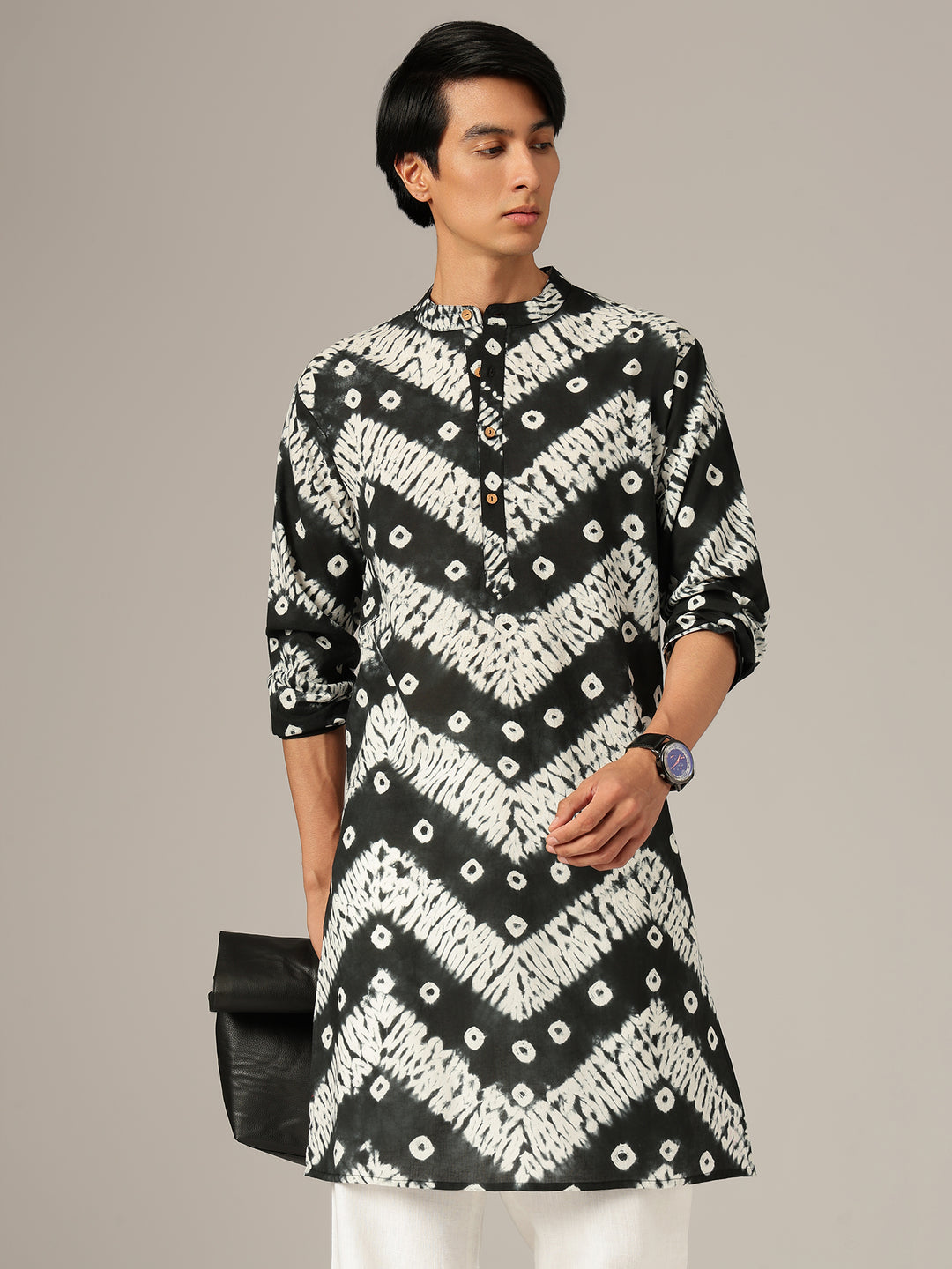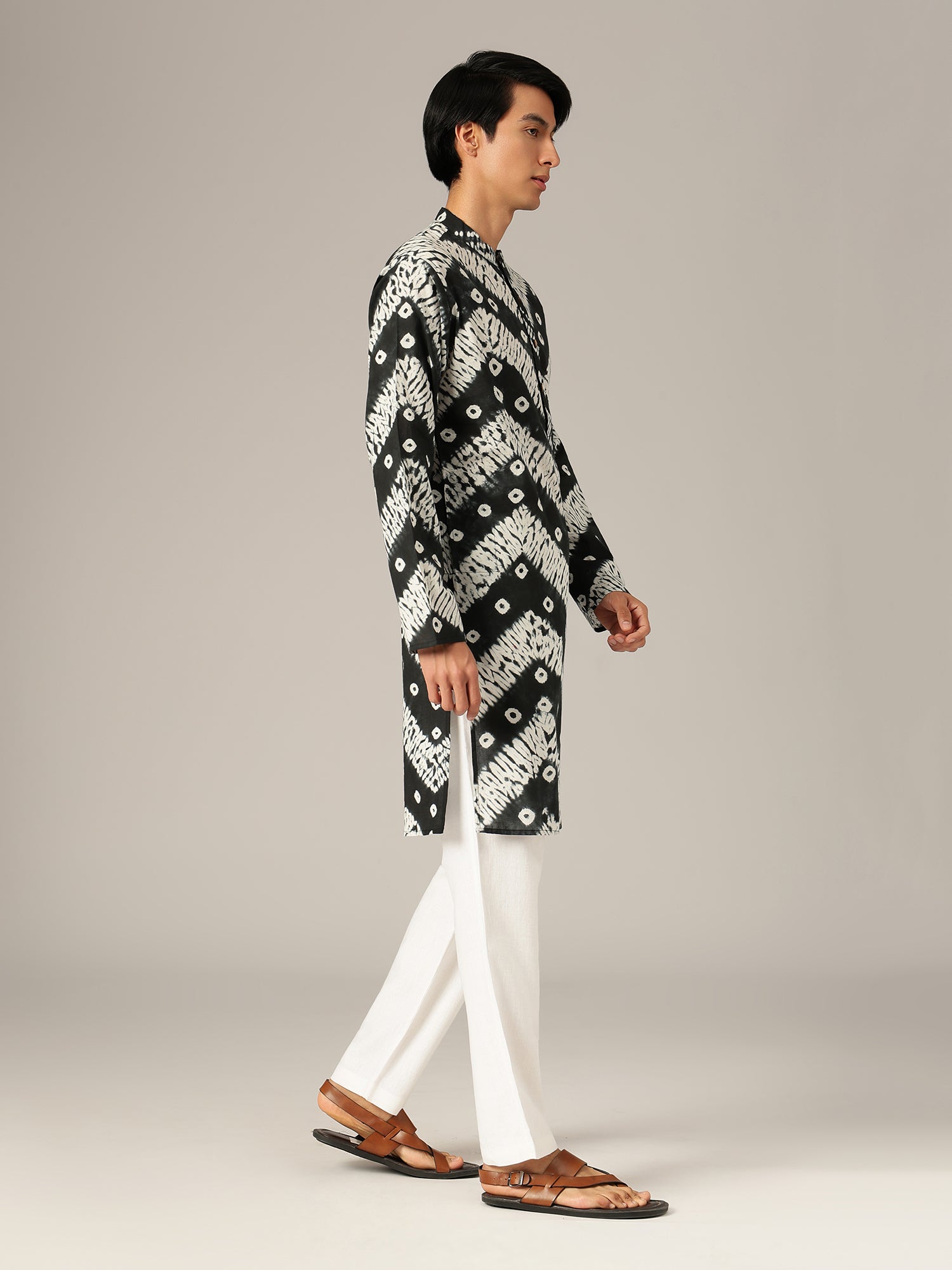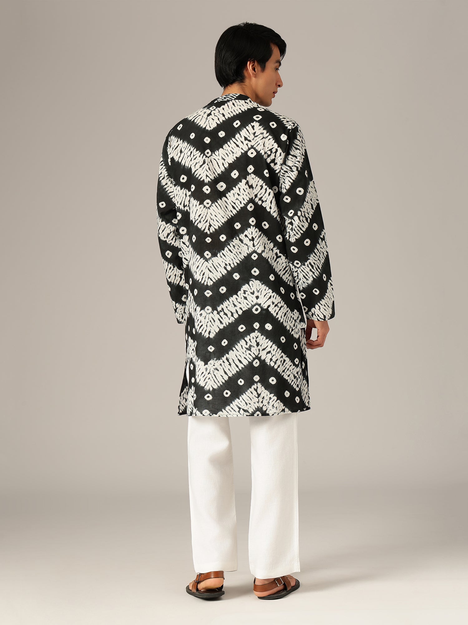 This Regular Fit Bandhani Printed Kurta features a Mandarin Collar, long sleeves, side slits, and a straight hemline. Crafted from sustainable cotton in a monochrome palette, it offers knee-length comfort with eco-friendly style.