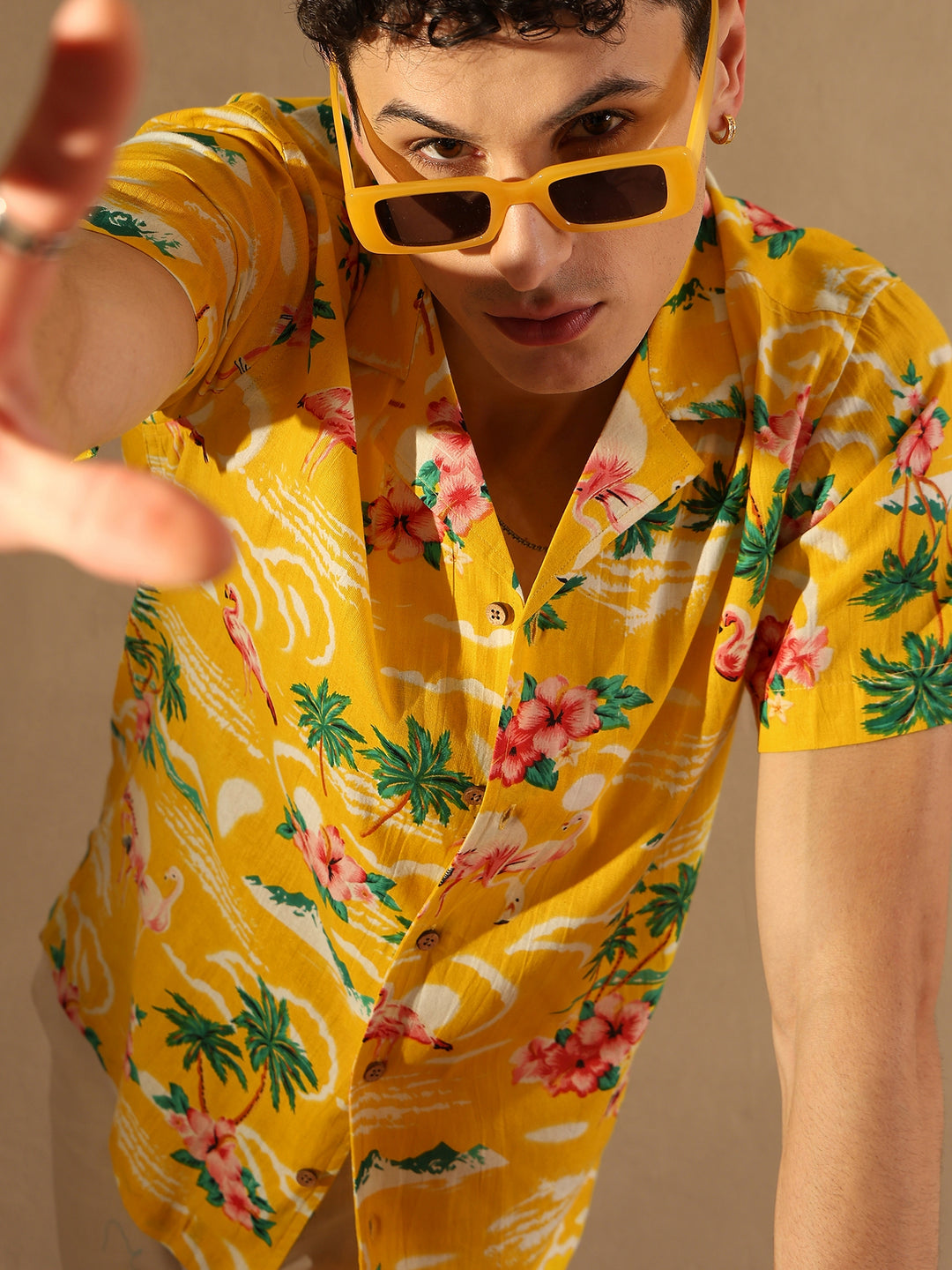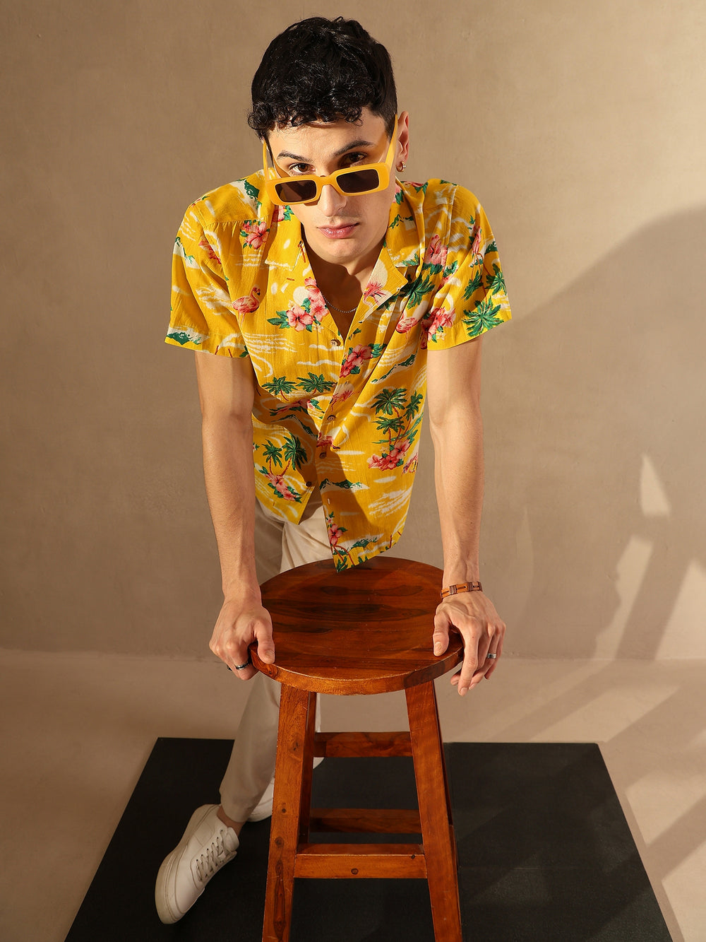 Mustard Yellow floral printed opaque Cuban Collar, has a cuban collar, button placket, long regular sleeves, curved hem