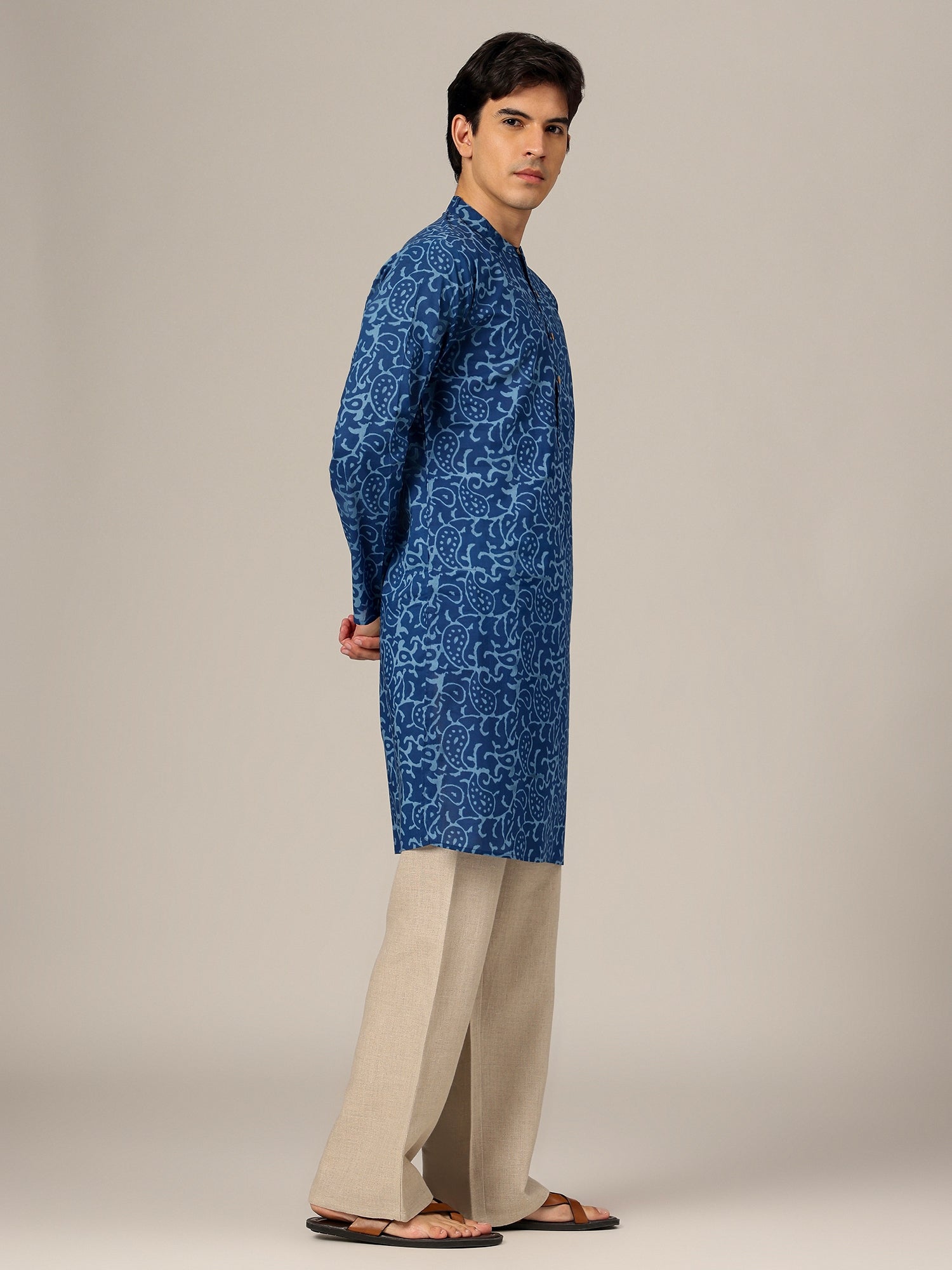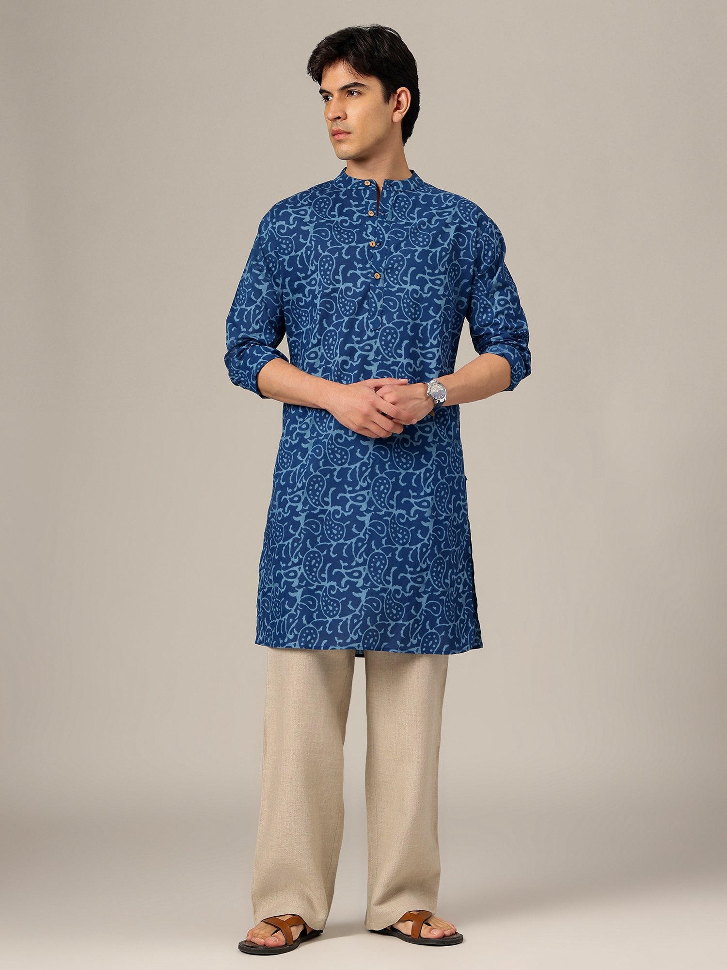 This Regular Fit Block Printed Kurta is crafted from soft cotton and features a Mandarin collar, long sleeves, and two pockets. The knee-length, straight shape with side slits ensures comfort and timeless elegance.