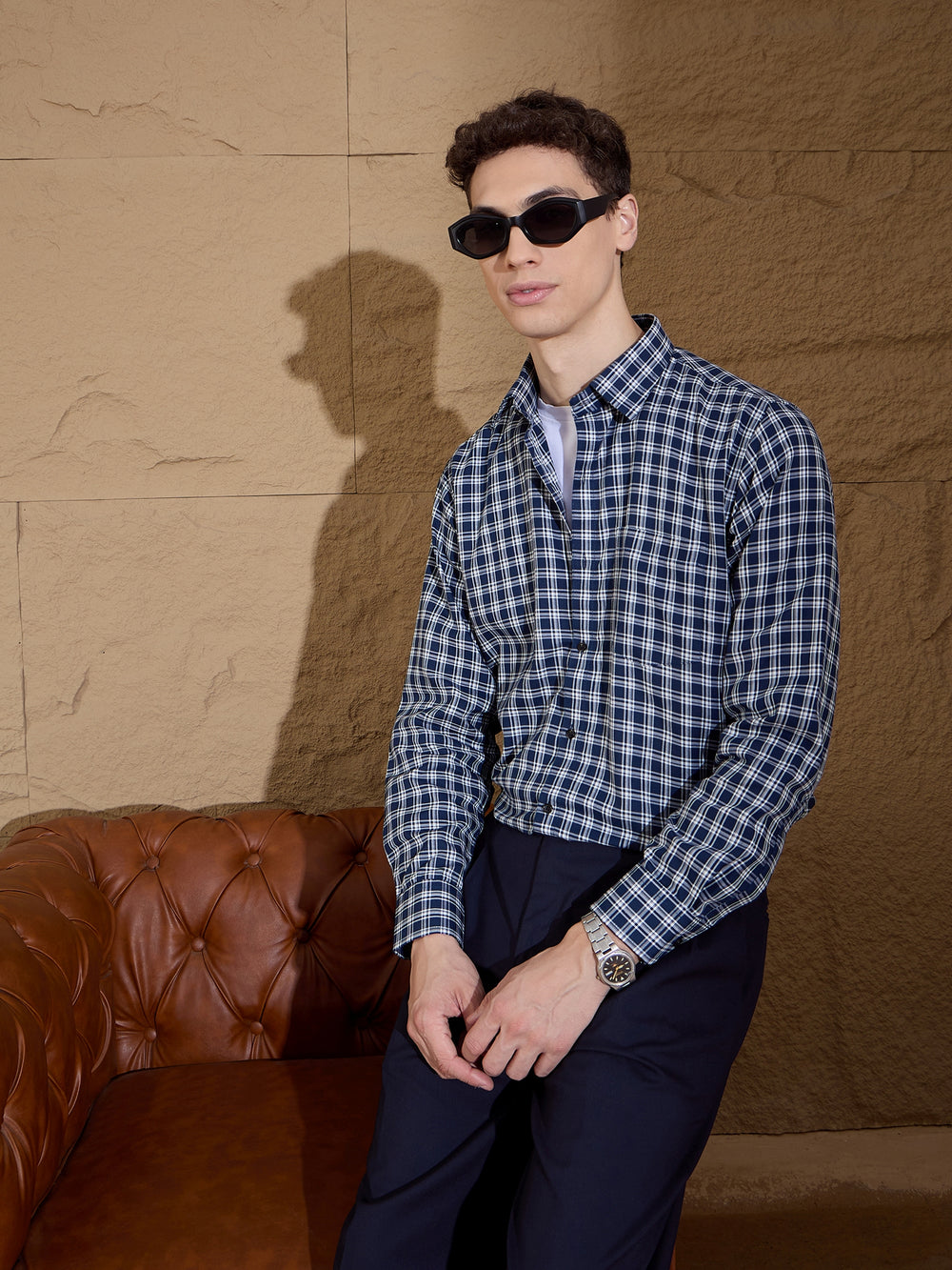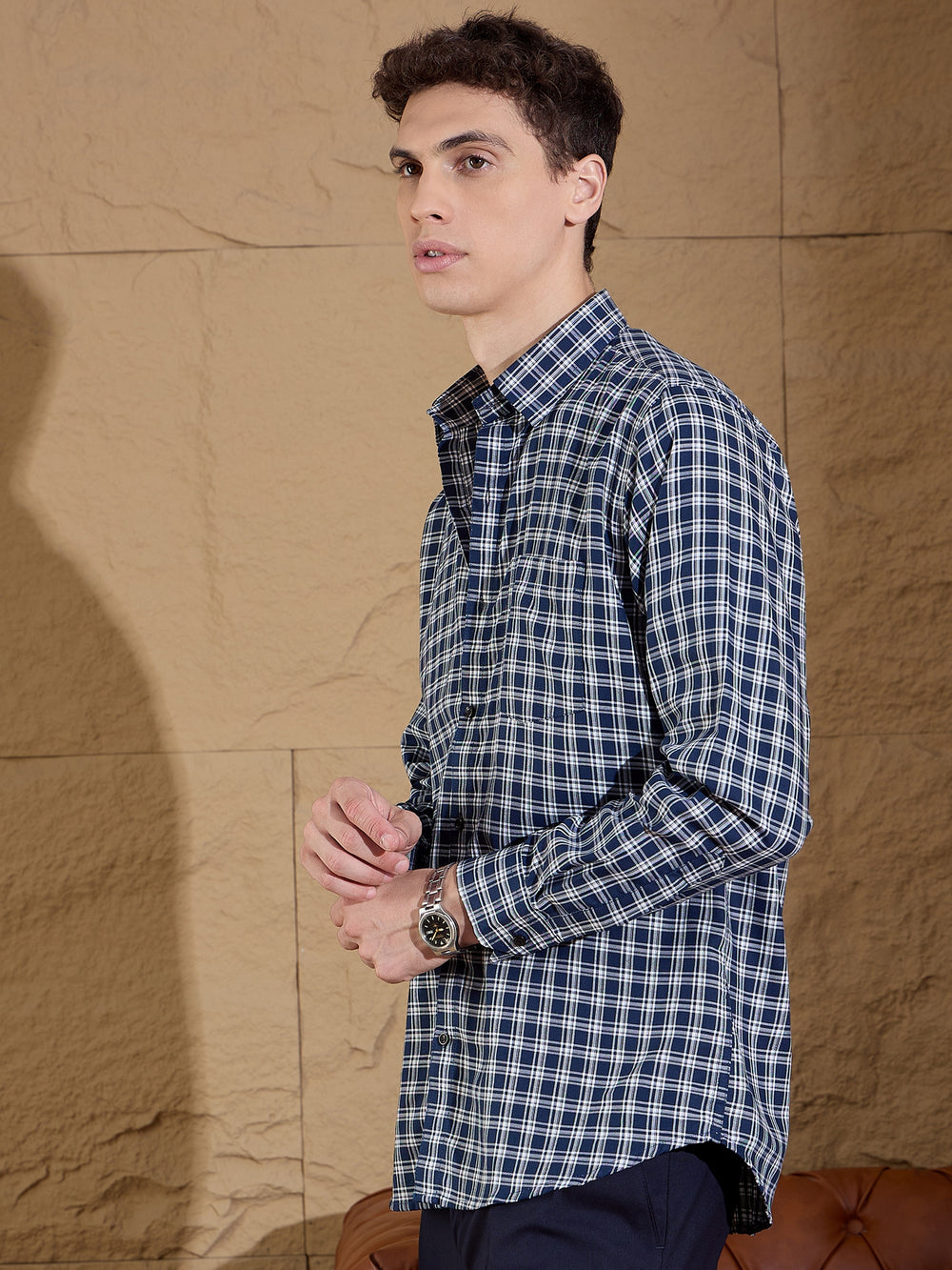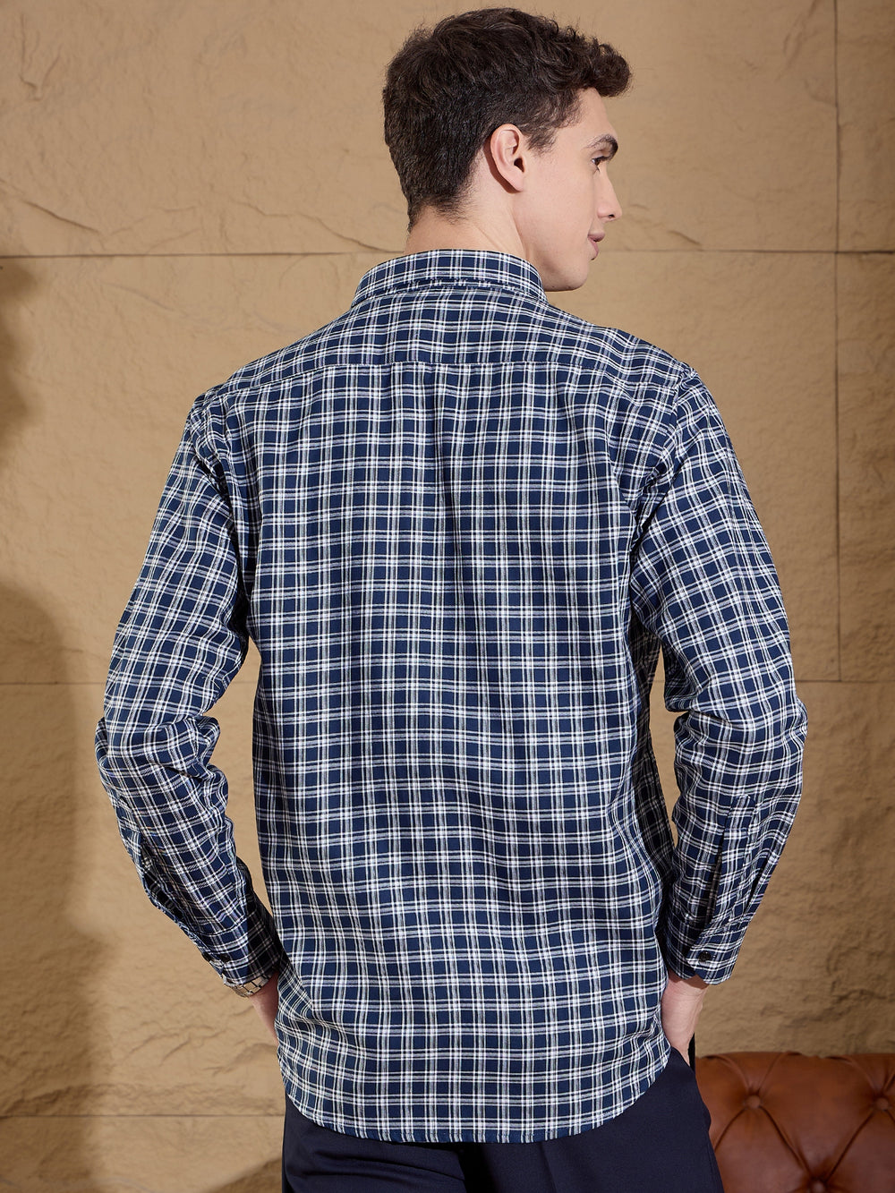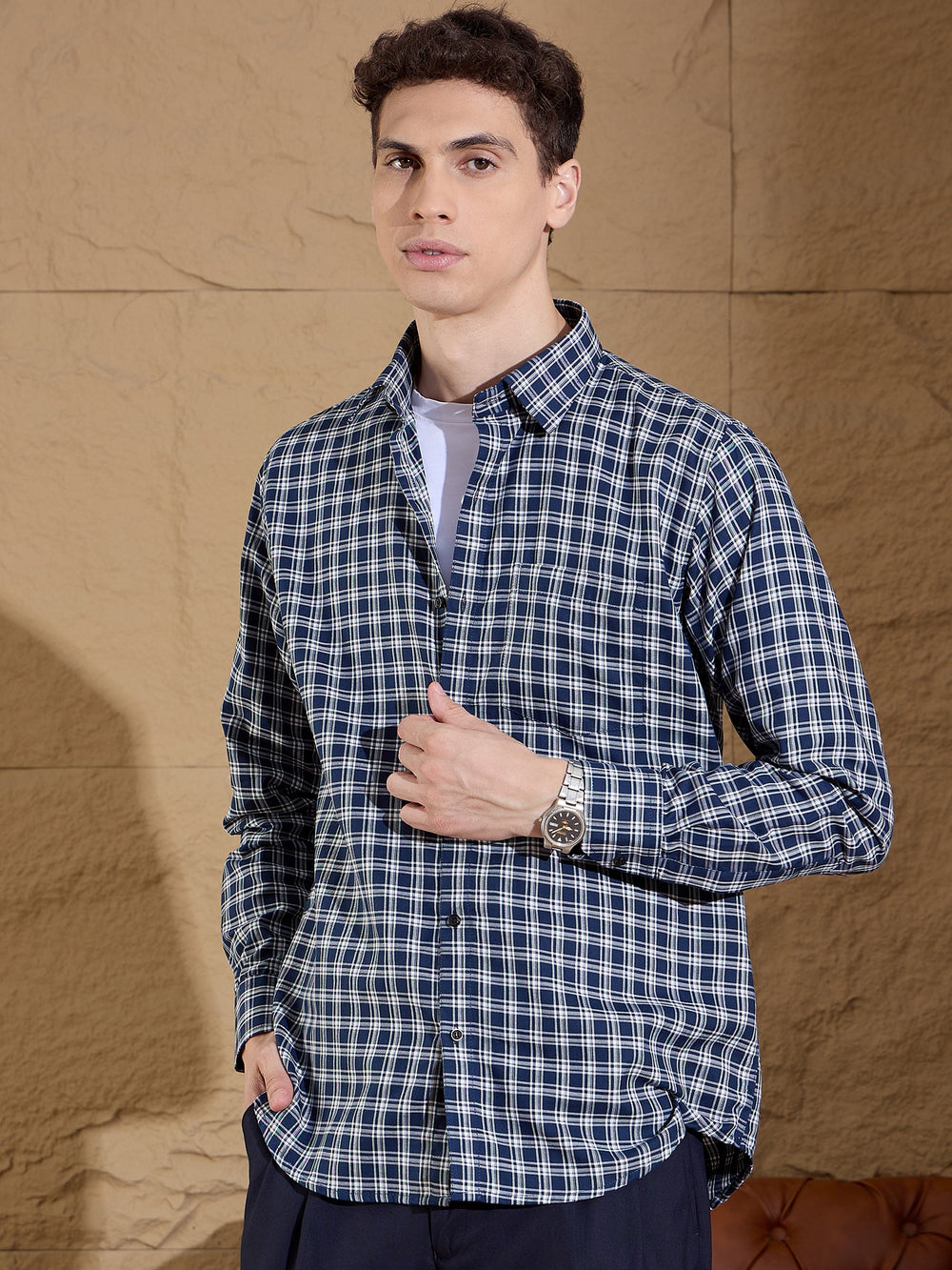 Blue and White tartan checks opaque Casual shirt, has a Spread collar, button placket, 1 patch pocket, long regular sleeves, curved hem