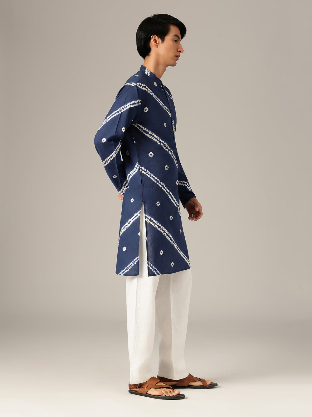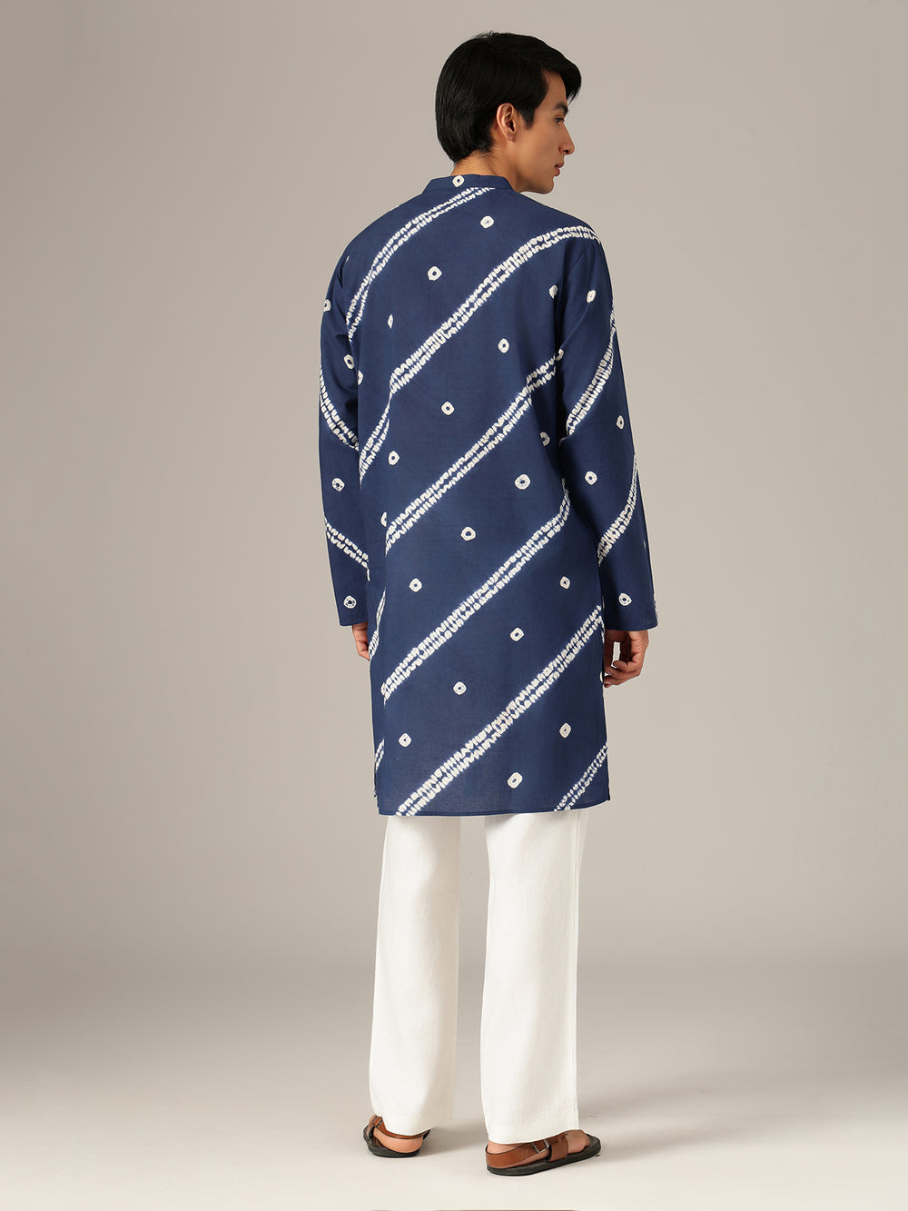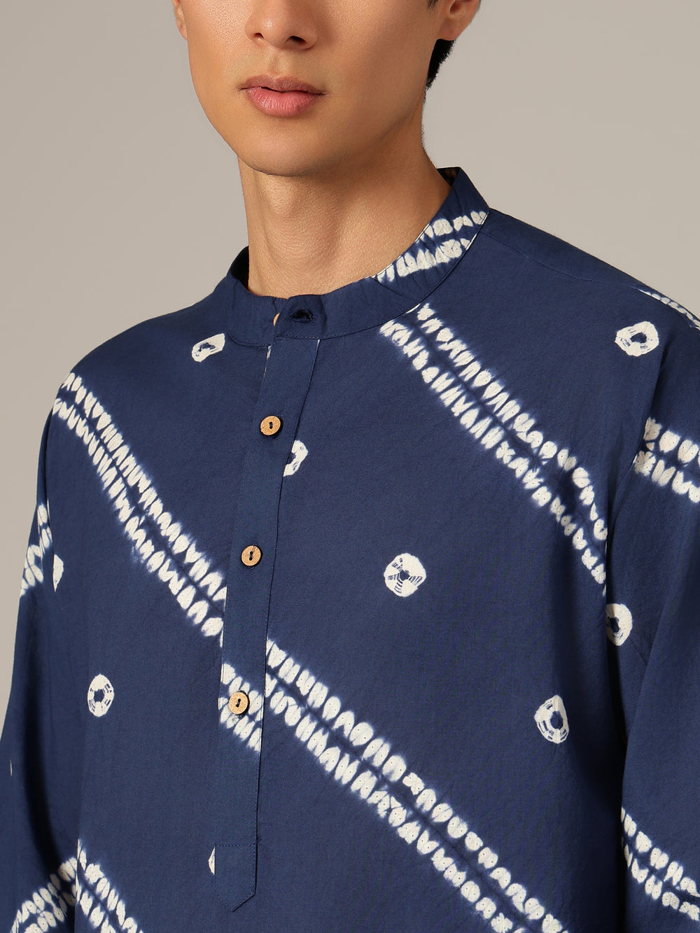 This Regular Fit Bandhani Printed Kurta is crafted from sustainable cotton, featuring a Mandarin Collar, long sleeves, side slits, and a straight hemline. Knee-length design in indigo shades ensures comfort, style, and eco-conscious elegance.