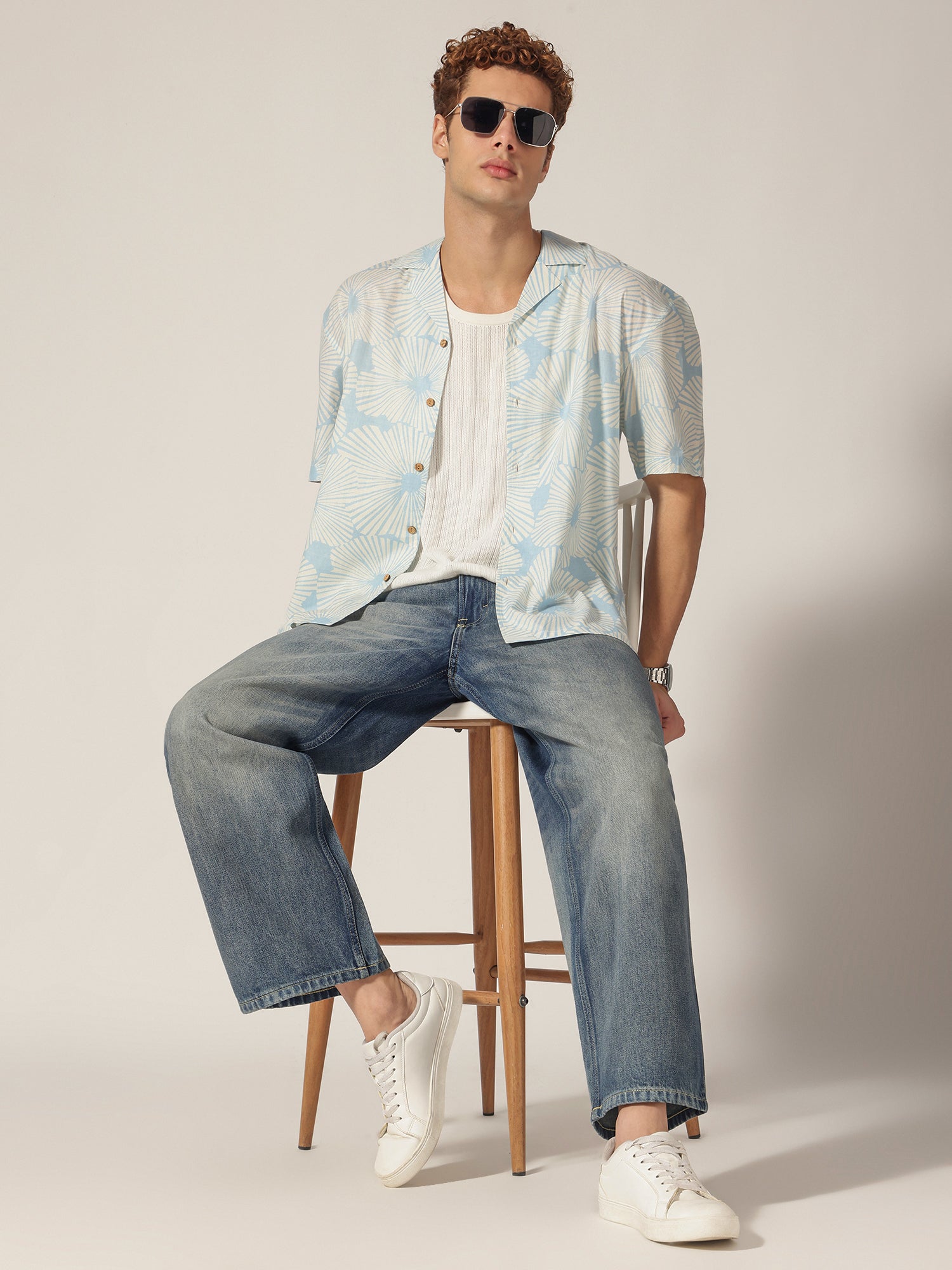 Blue & Upgrade your wardrobe with this Oversized Fit Casual shirt crafted from breathable Cotton. Featuring unique Block Printed design, Drop Shoulder, Half Sleeves, Cuban Collar, Straight Hemline, and a no pocket finish for a clean silhouette.