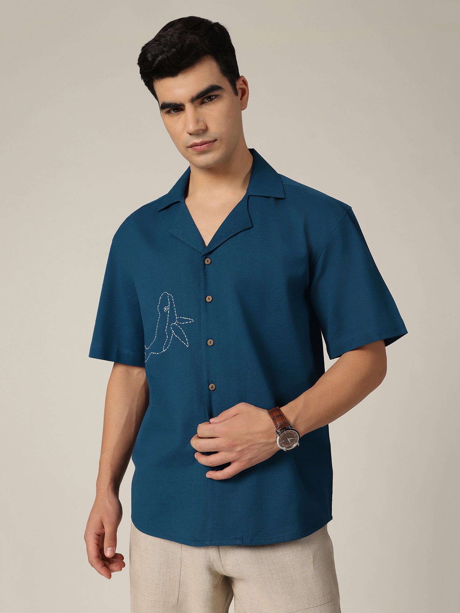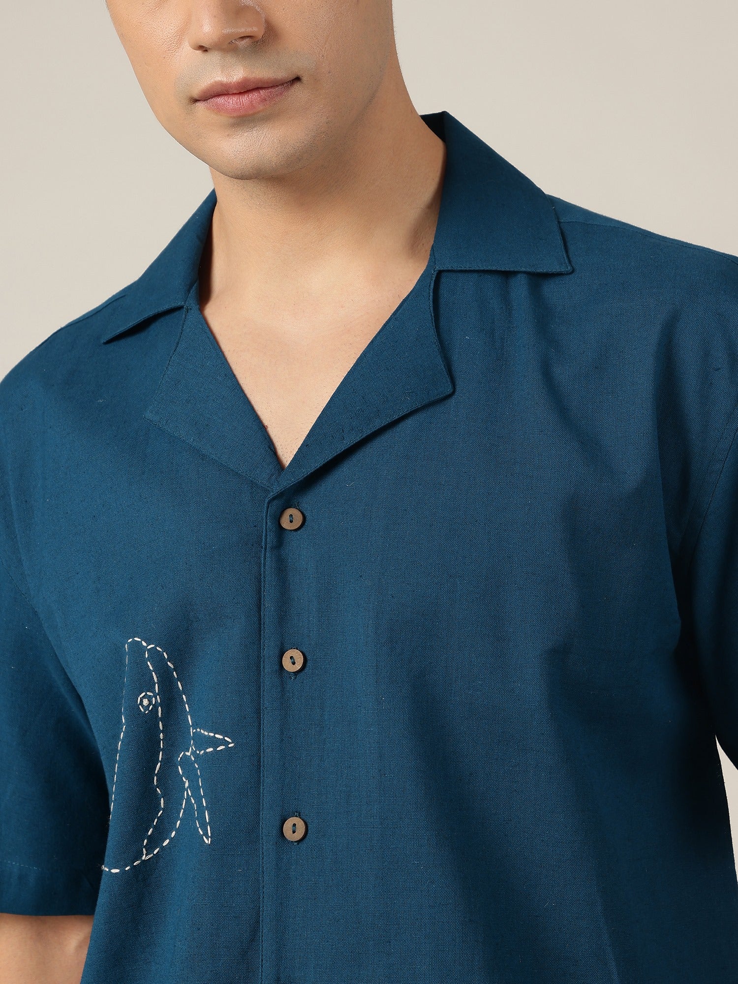 This embroidered Cuban-collar shirt blends relaxed structure with refined detailing. Its oversized silhouette and drop-shoulder cut create a modern, effortless vibe, perfect for elevating simple everyday looks with subtle sophistication.