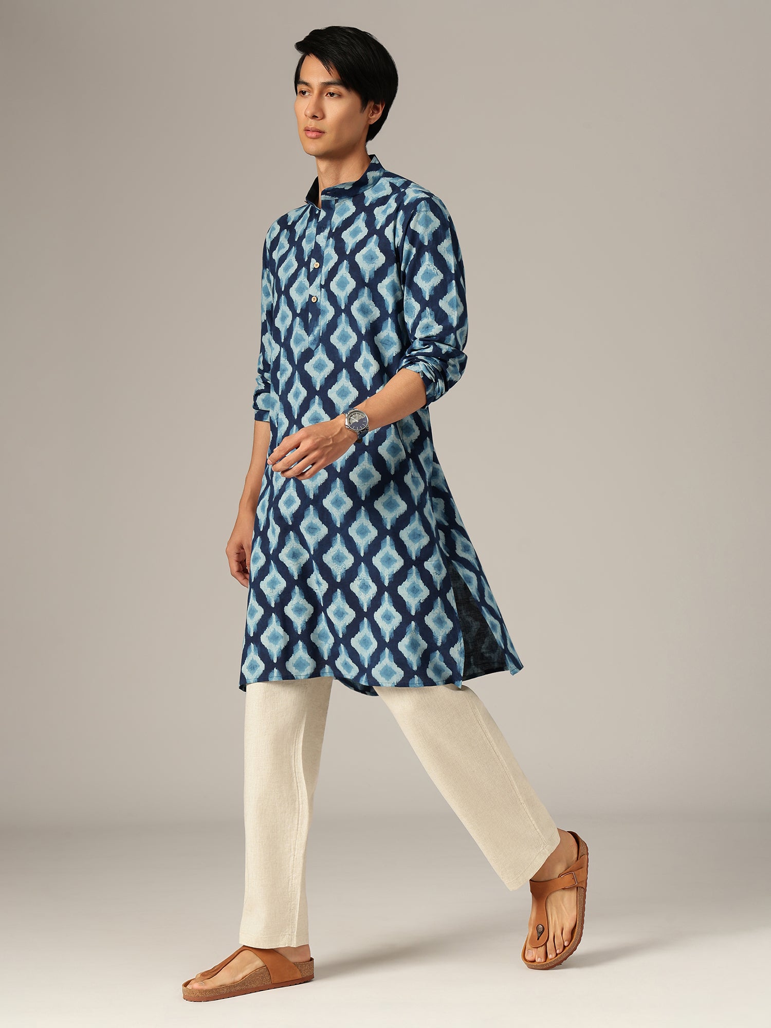 Traditional ikat patterns in a deep indigo palette give this kurta a handcrafted feel, blending cultural charm with a clean, modern silhouette for timeless ethnic appeal.