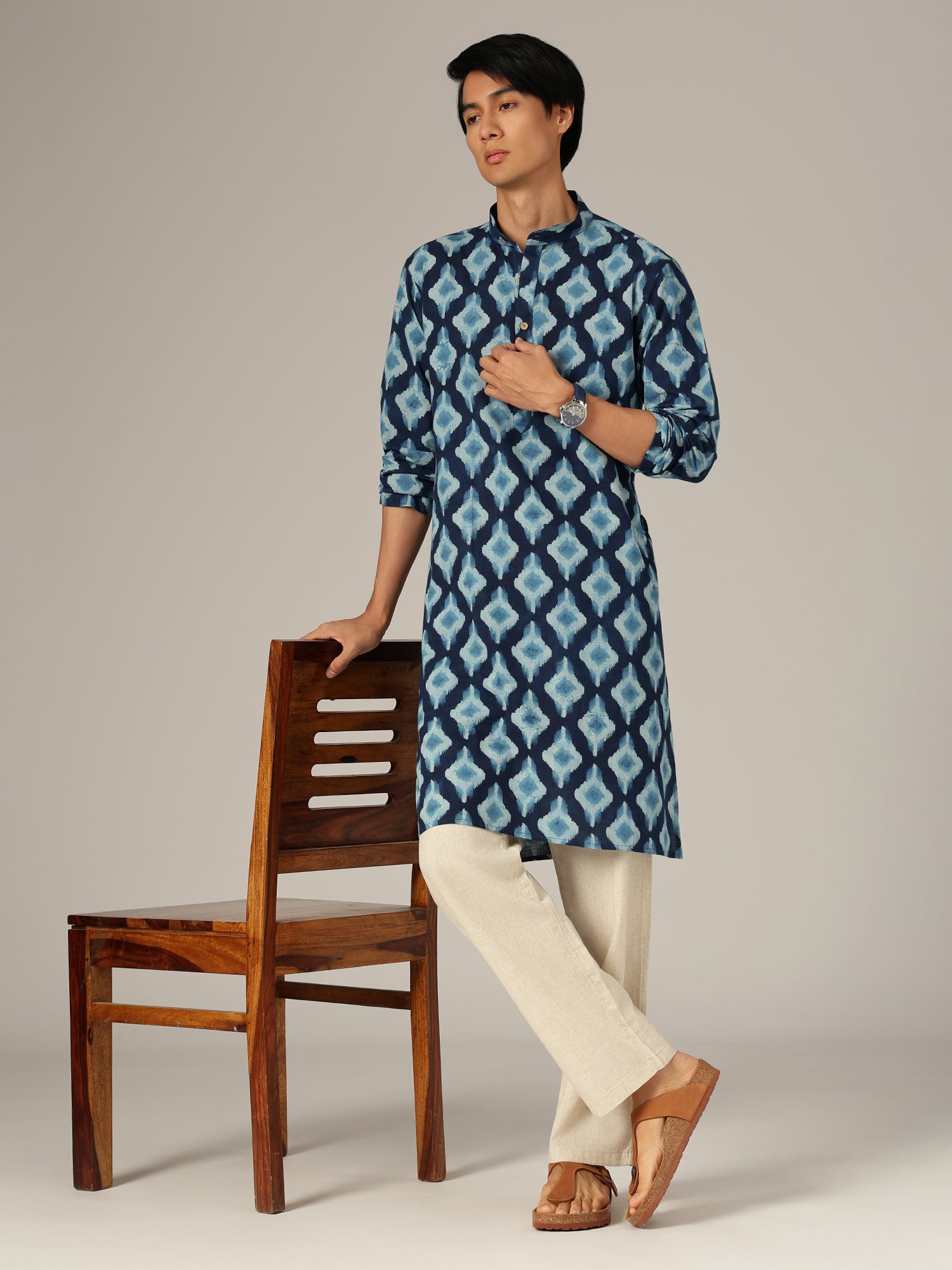 This regular fit ikat printed kurta is crafted from breathable cotton, featuring a mandarin collar, long sleeves, knee length silhouette, straight hemline, and side slits for comfort, structure, and easy movement in rich indigo tones.