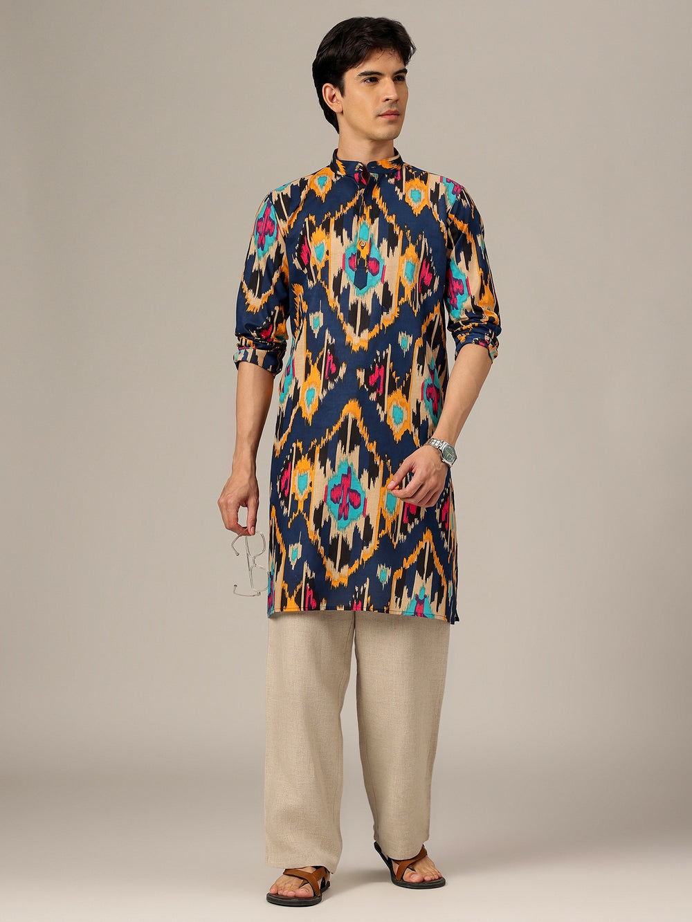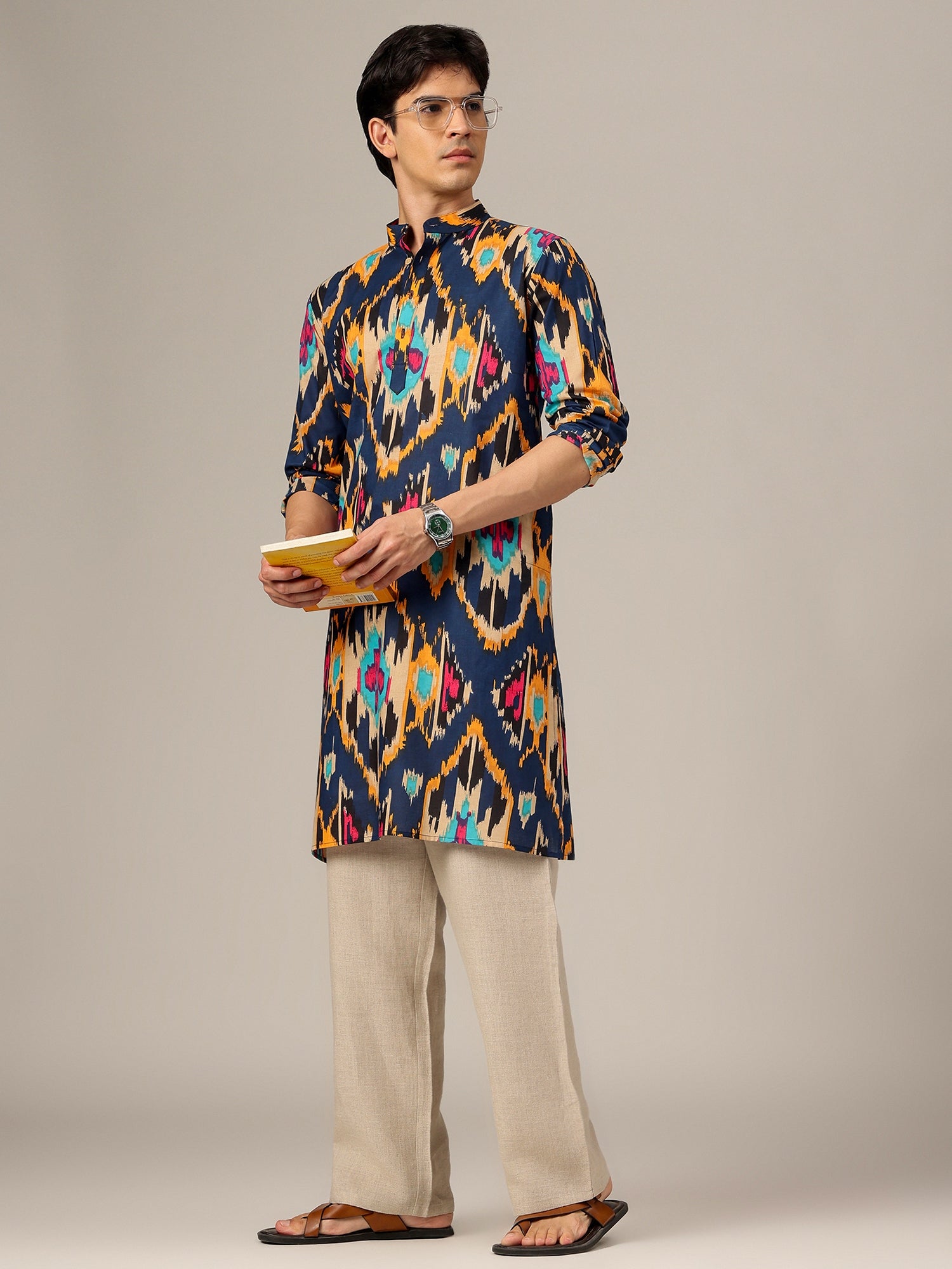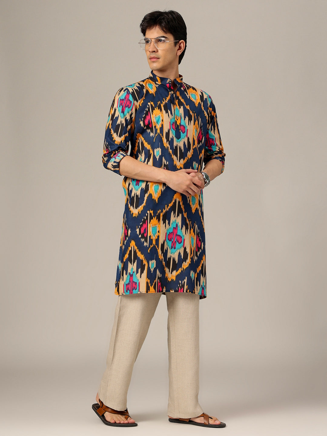 Showcasing a timeless Ikat print, this cotton kurta offers a perfect mix of tradition and modern elegance. The Mandarin collar and straight silhouette enhance its sophisticated appeal.
