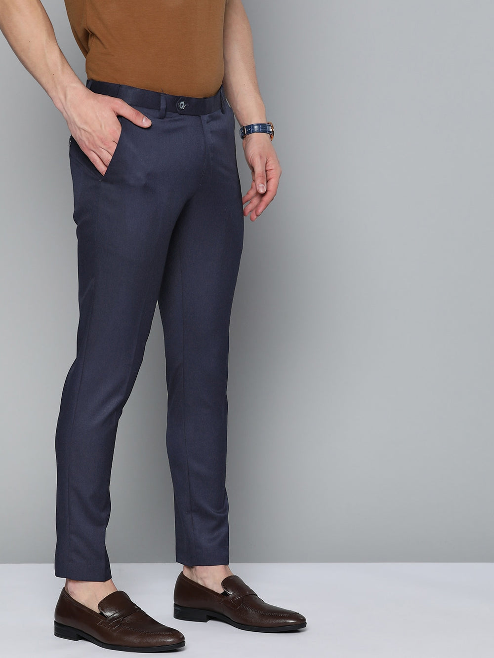 Blue woven Formal Tapered fit trousers, has a waistband with belt loops, Button closure, and four pockets