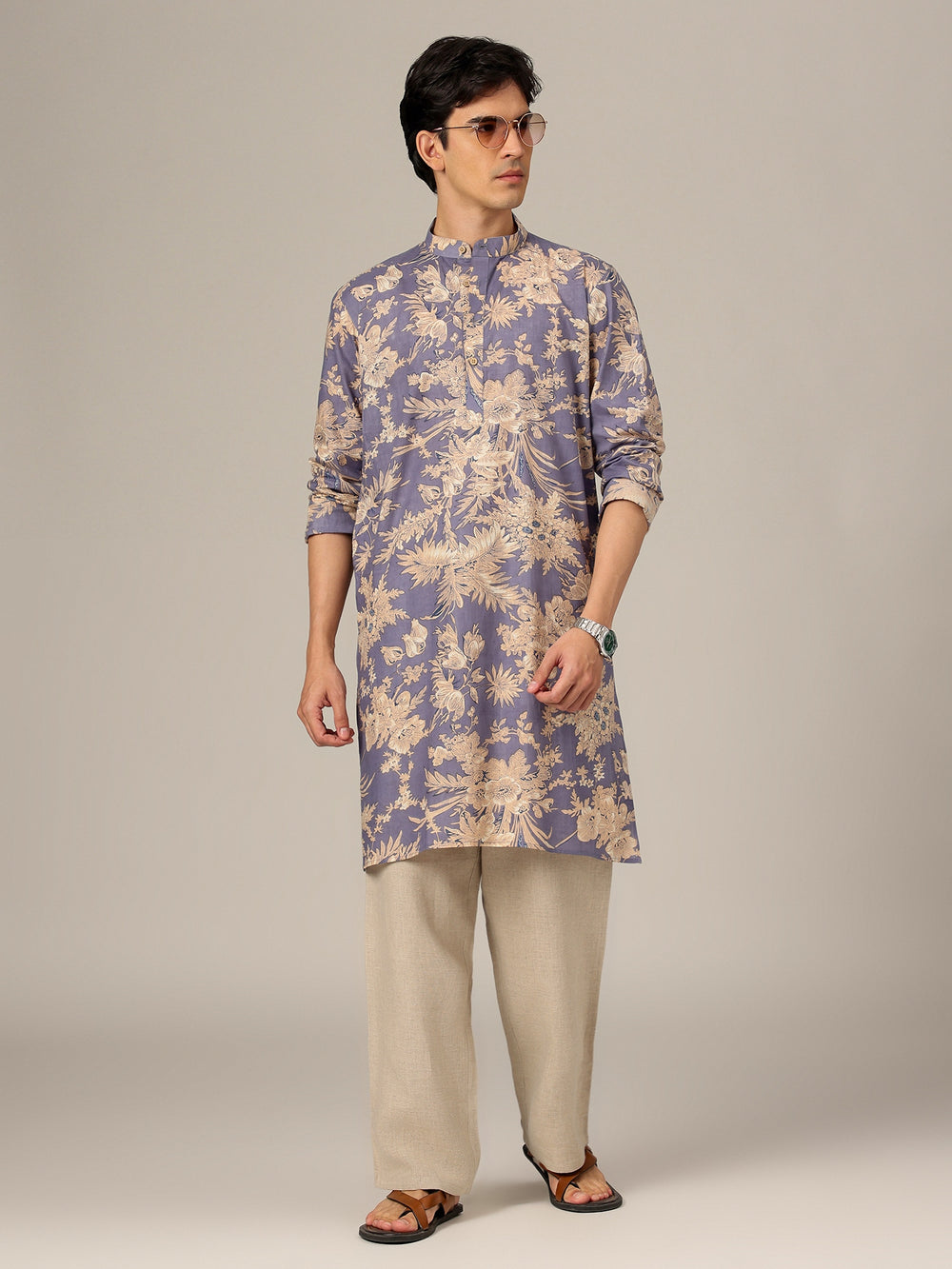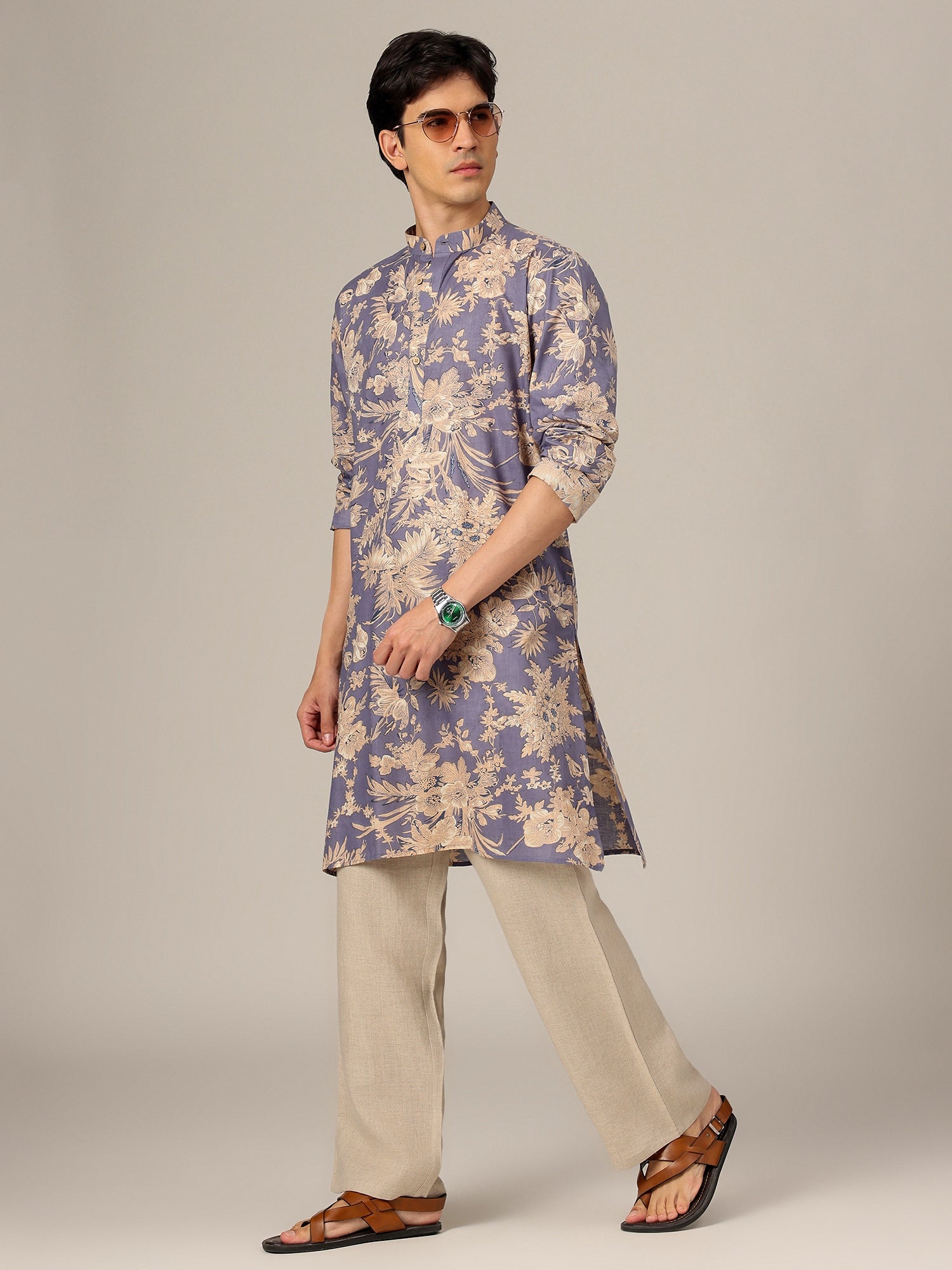 This Regular Fit Floral Printed Kurta is crafted from breathable cotton and features a Mandarin collar, long sleeves, and two pockets. Designed in a straight shape with side slits, it offers comfort and effortless charm.