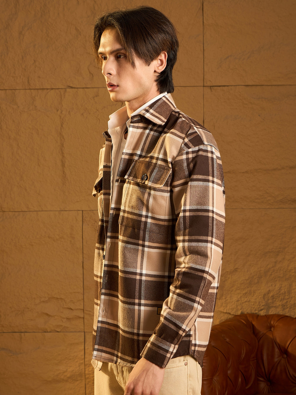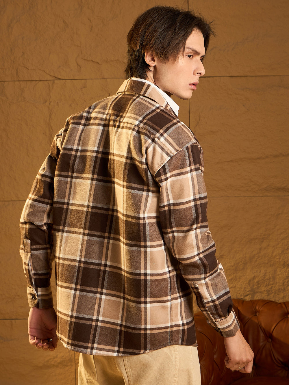 Brown and Beige checked shacket featuring a spread collar, drop shoulders, oversized fit, full sleeves, 2 Flap pockets, and a stylish curved hemline