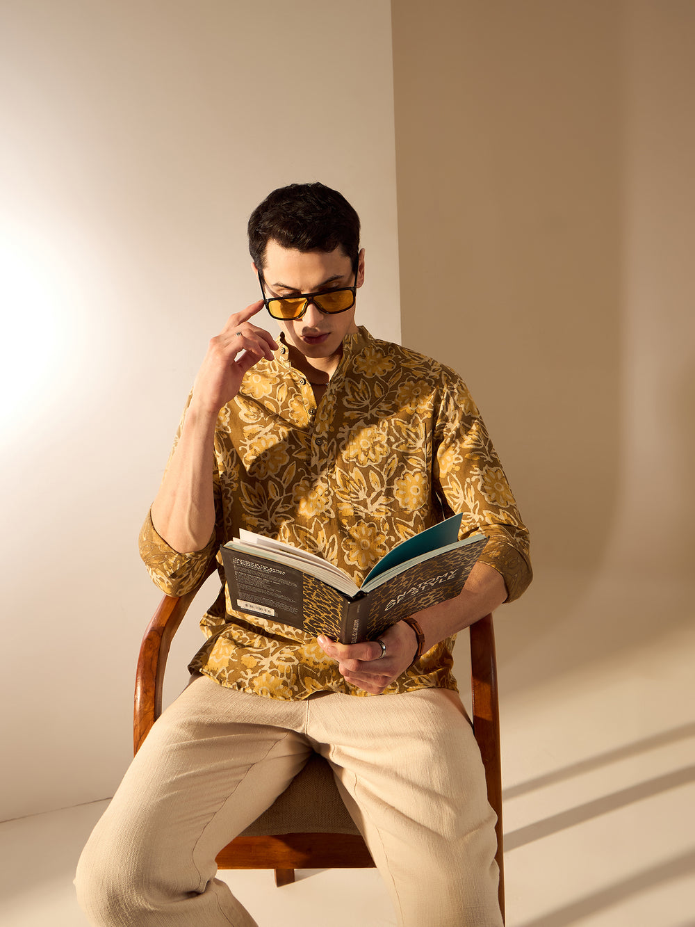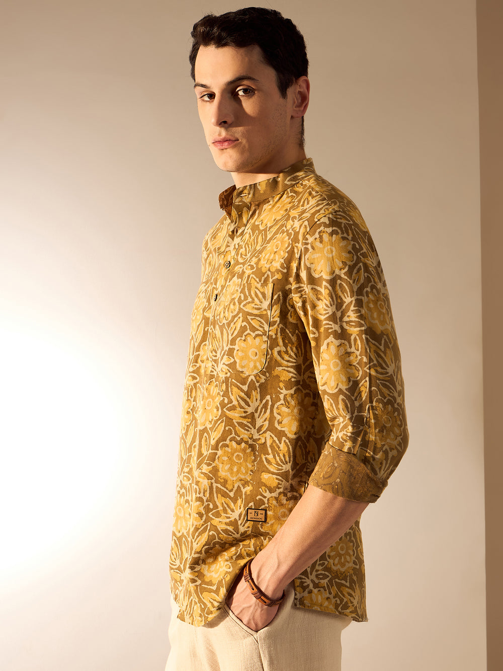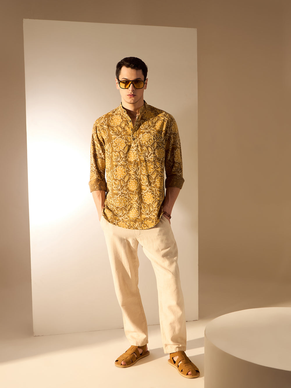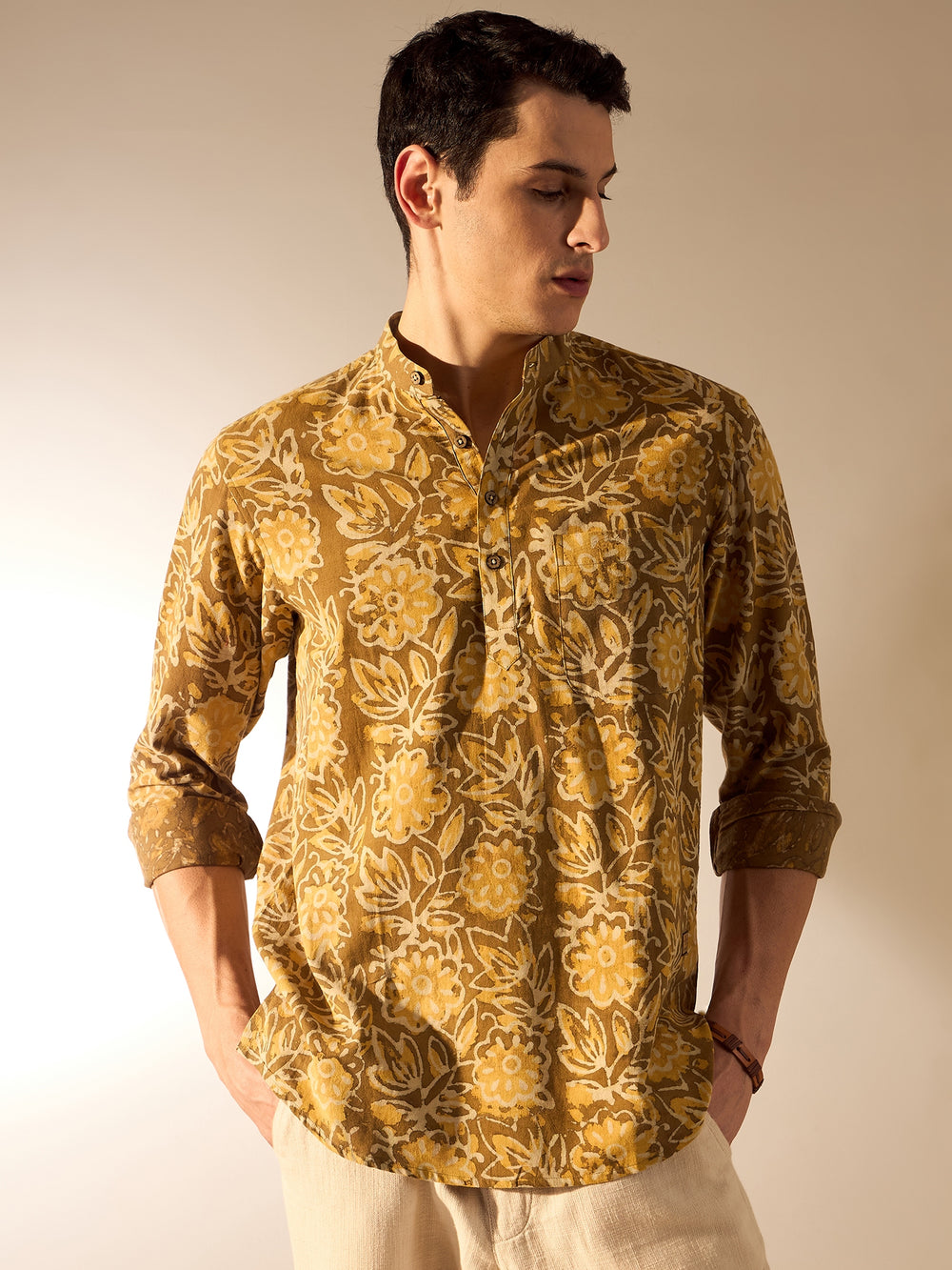 Pair this short kurta with solid-colored chinos or linen trousers for a clean and relaxed look. Add leather sandals or loafers for a casual vibe. For festive occasions, style it with a sleeveless Nehru jacket and mojaris.