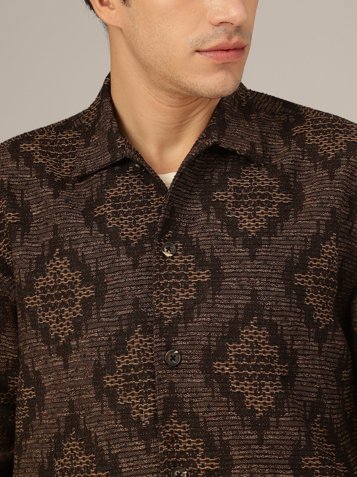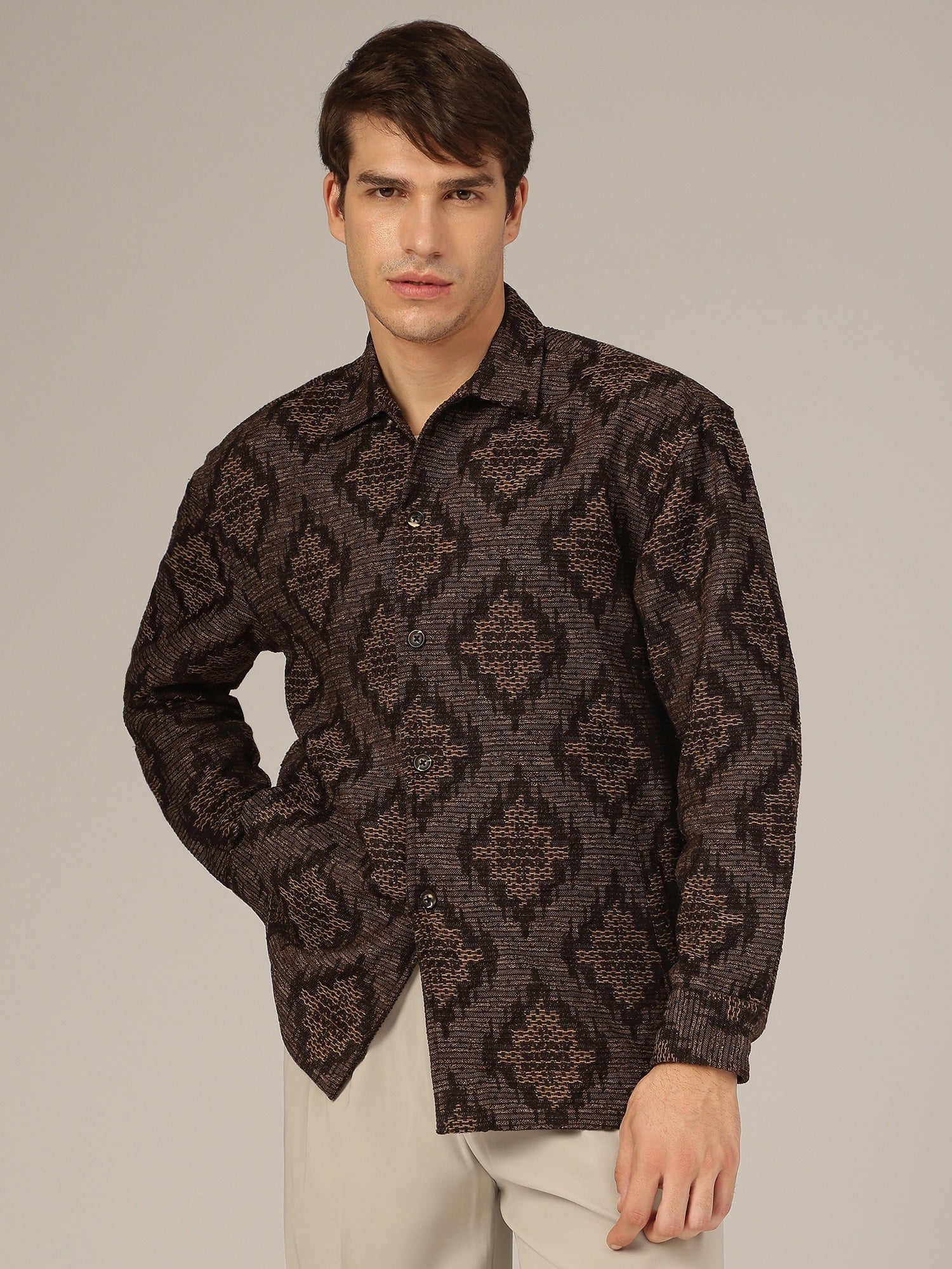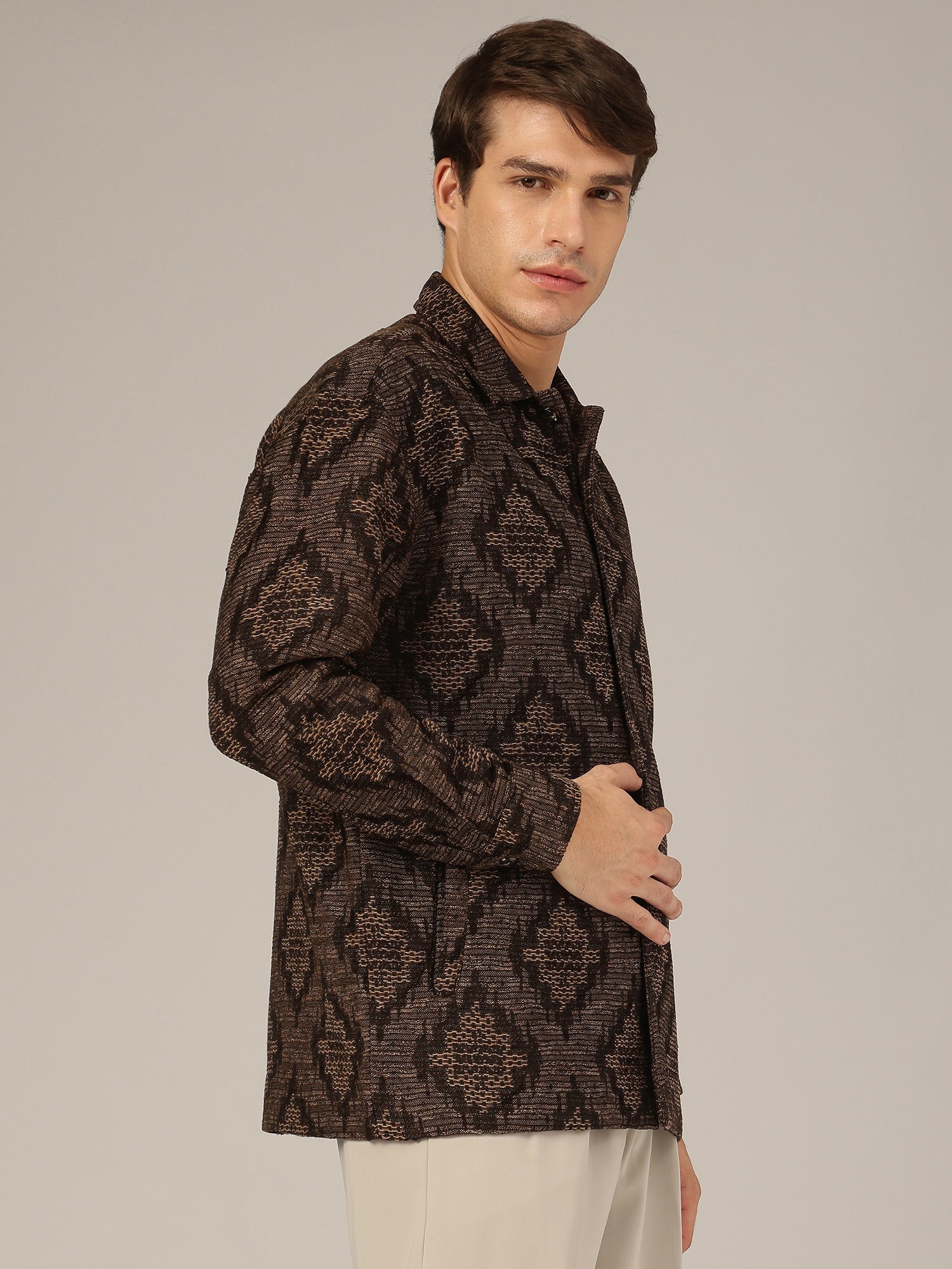 Brown: Jacquard Printed Oversized Drop-Shoulder Shacket