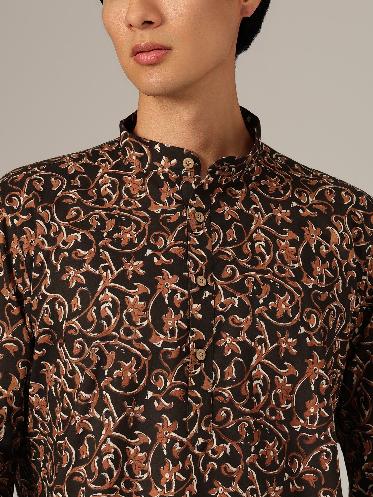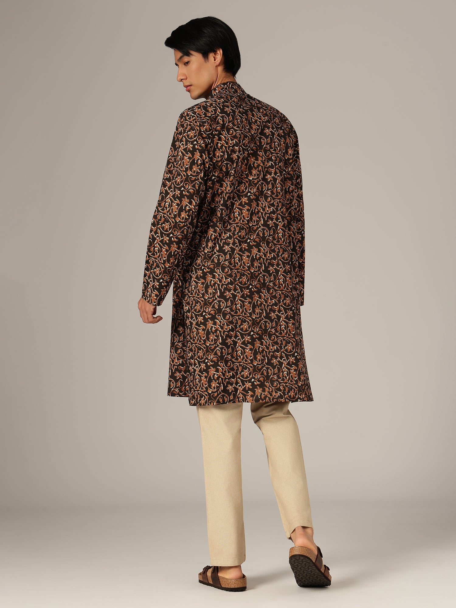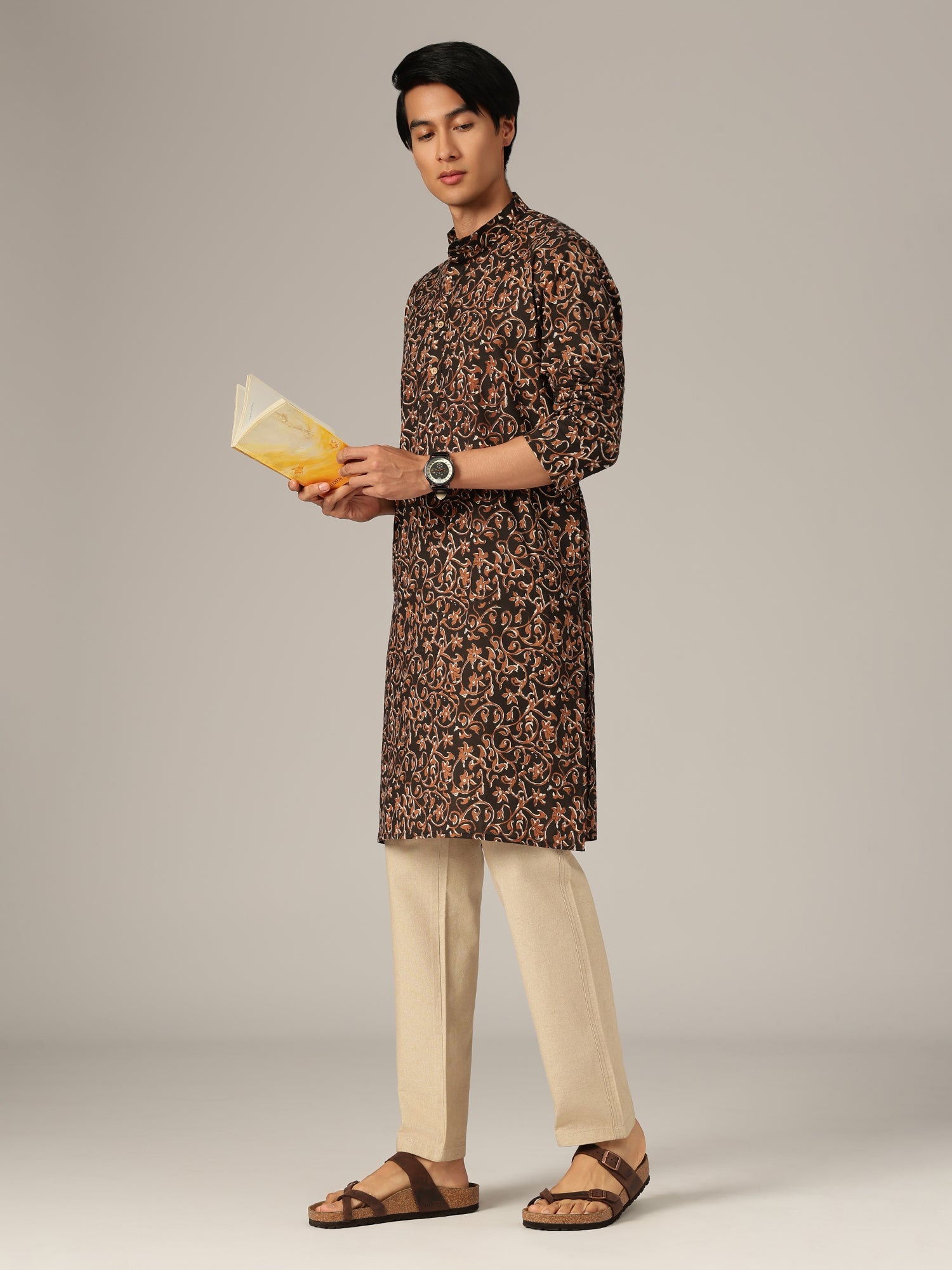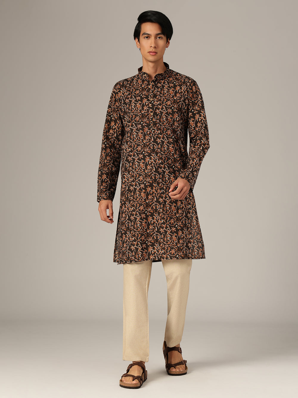 This Regular Fit, sustainable Kalamkari Block Printed Kurta features a Mandarin Collar, long sleeves, and side slits. Crafted from breathable cotton in earthy tones, it offers knee-length coverage and a straight hemline for effortless comfort.