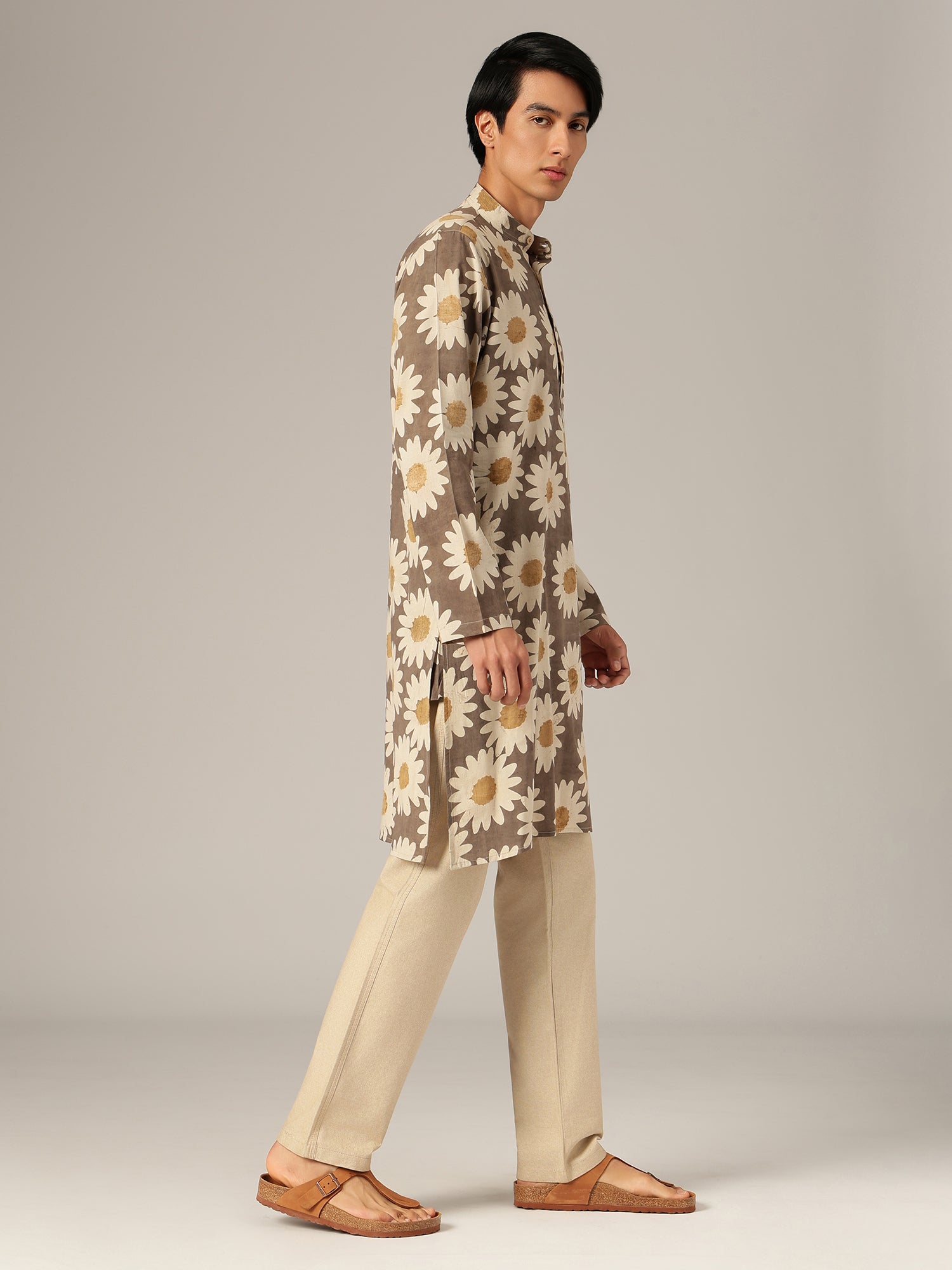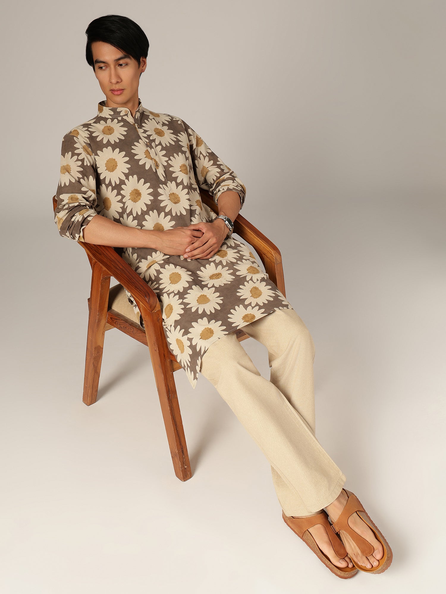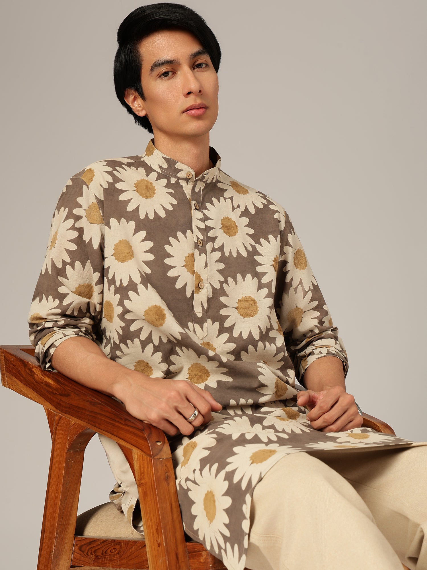 This regular fit floral block printed kurta is crafted from breathable cotton, featuring a mandarin collar, long sleeves, knee length design, straight hemline, and side slits for all-day comfort and effortless ethnic style.