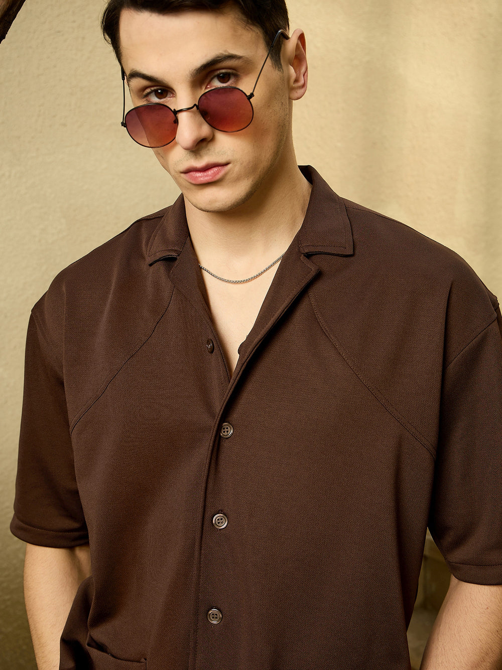 Brown double pocket drop shoulder Oversize Casual shirt ,has a Cuban collar, button placket, 2 pocket,Wrinkle Free, short sleeves, Straight hem