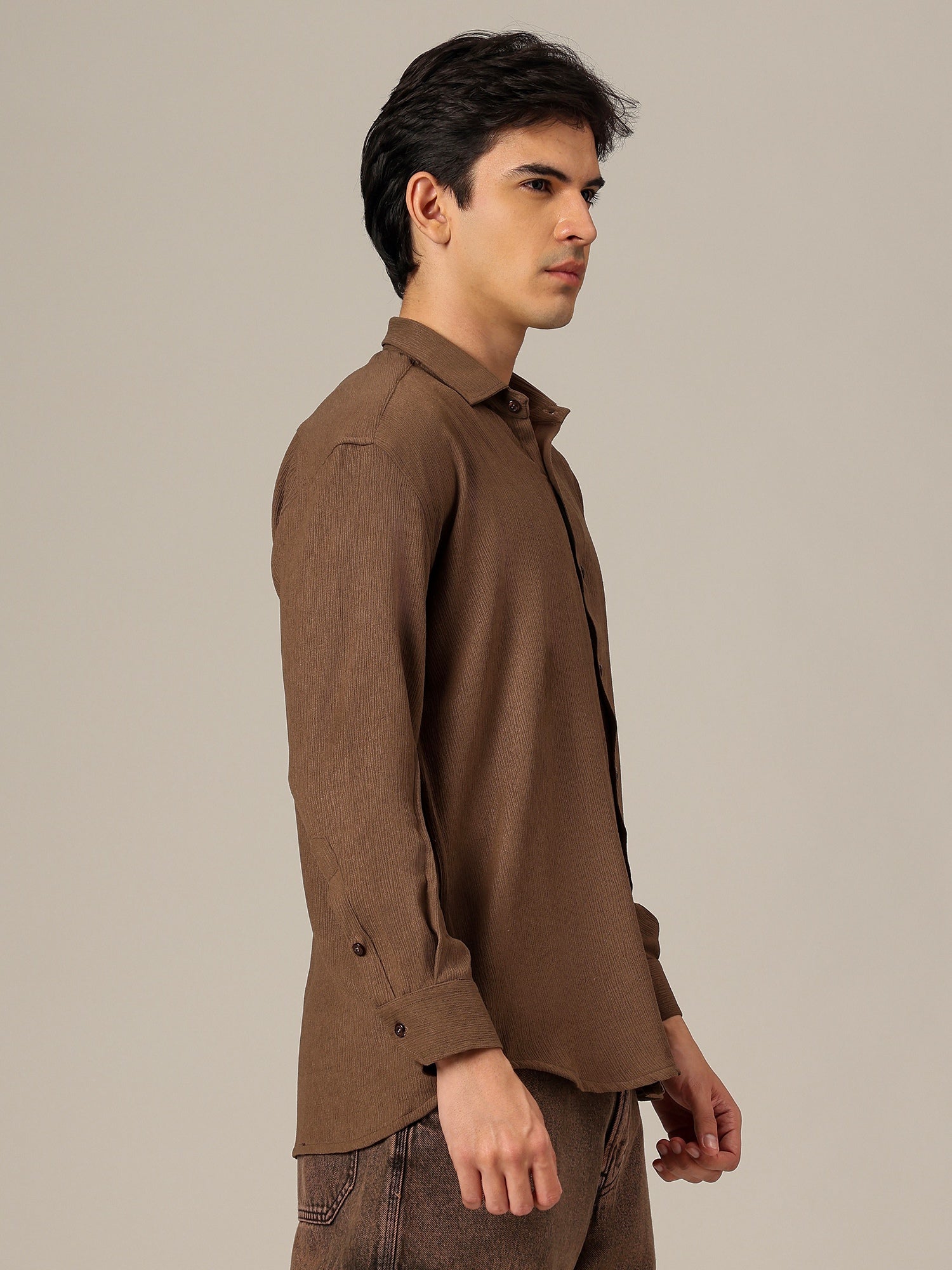 This Oversize Textured Polyester Casual Shirt combines comfort and contemporary style. Its relaxed fit and spread collar make it ideal for layering or wearing solo for effortless fashion.