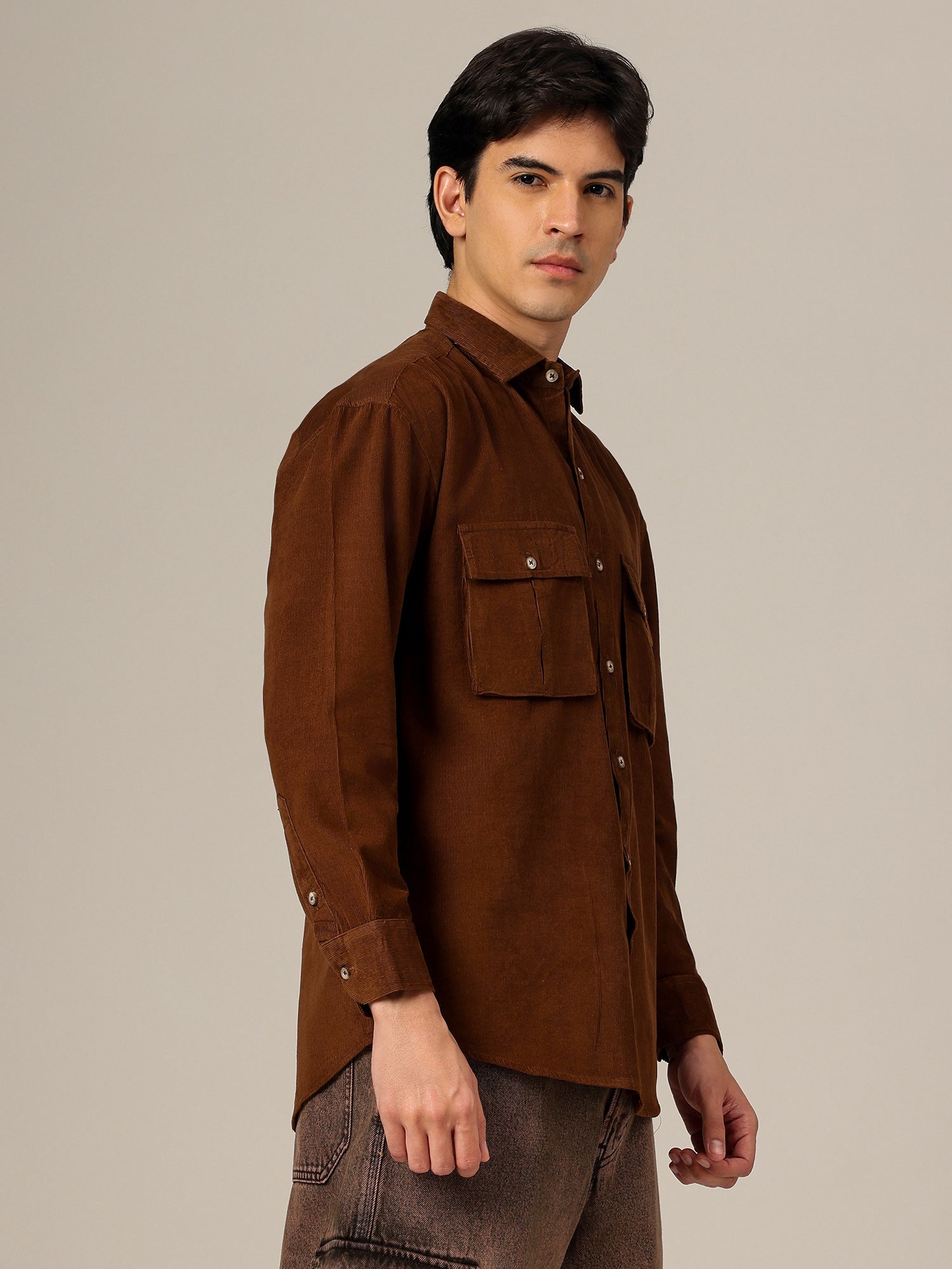 Upgrade your wardrobe with this Corduroy Shirt in a Textured, Oversize Fit. Featuring Drop-Shoulders, Full Sleeves, Double Flap Pockets, a classic Spread Collar, and a stylish Curved Hemline, it’s perfect for casual, layered looks.