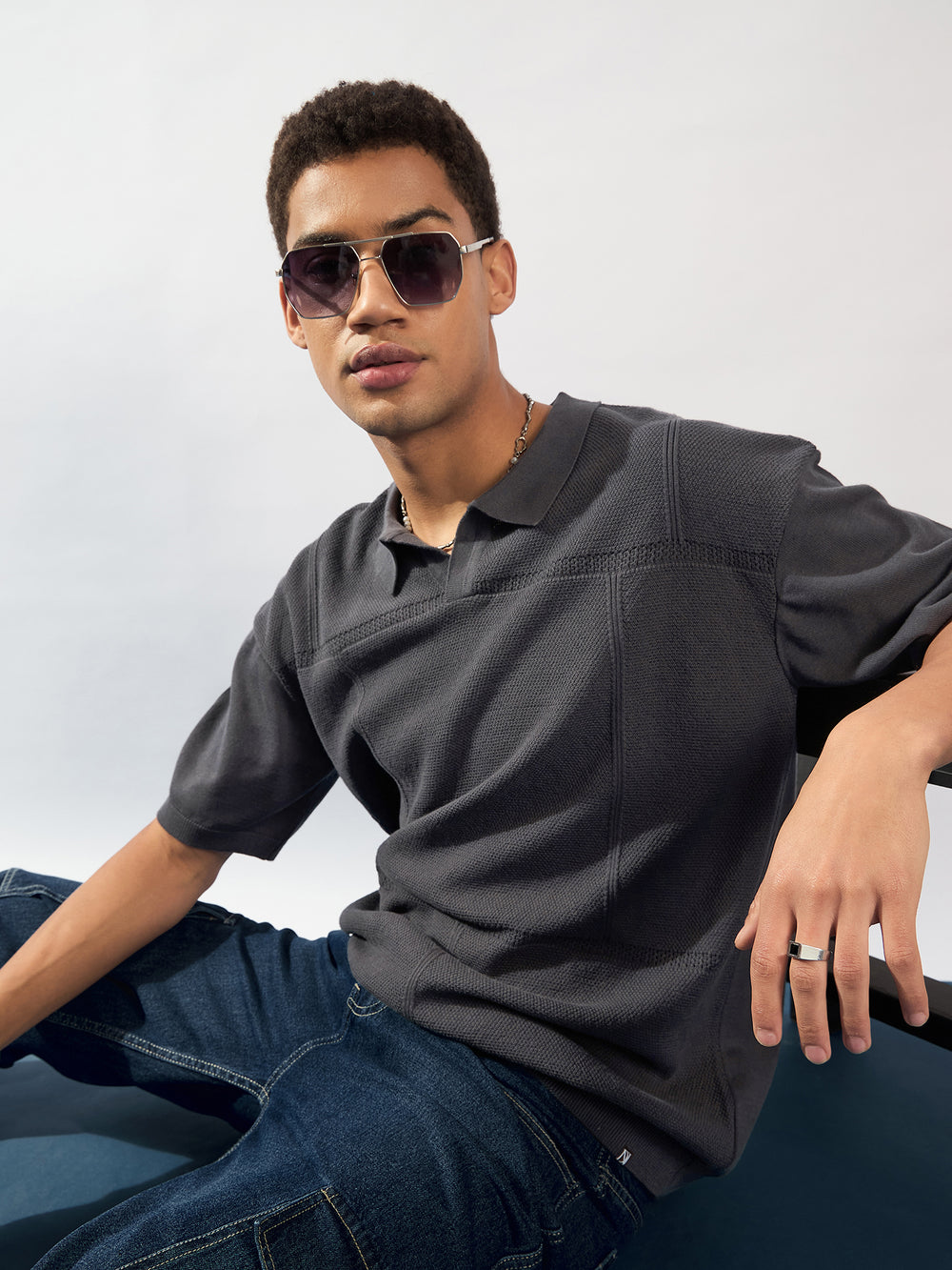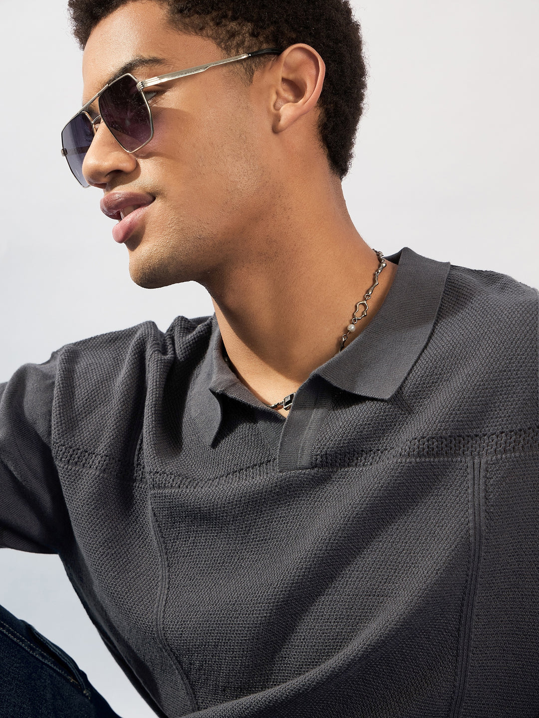 Charcoal Grey Textured Oversized Semi Sheer Knitted T-shirt ,has a Polo collar, no pocket, Half regular sleeves, full front coverage Self Design